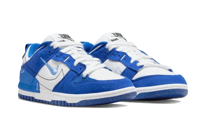 Comme c’est typique de la Disurpt, la tige est visuellement occupée sans perdre la sensation de la Dunk Low classique. Ceci, bien que plus évident dans la forme, peut également être vu à travers les superpositions, dont les panneaux en daim conservent la forme générale de l’original. Les matériaux, cependant, ne sont pas aussi similaires, et l’adhésion au « Kentucky » se termine effectivement par le coloris bleu sur blanc. Des détails tels que le Swoosh brodé de couleur UNC et la semelle mouchetée partiellement recyclée ne font que distinguer davantage cette paire des Wildcats.