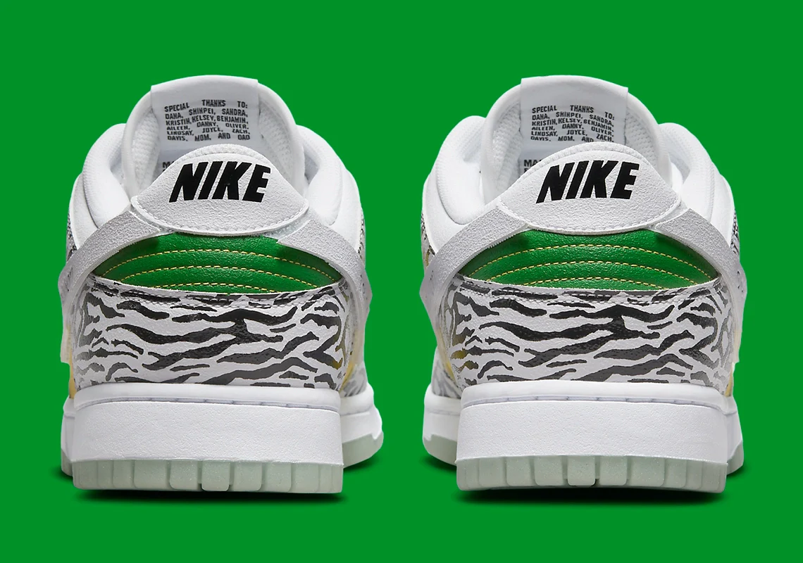 Zoe Taaffe, comme le dit Nike, est « une sur un million ». La Dunk Low de la jeune créatrice de baskets, qui s’inspire des passions de Zoe Taaffe et de son expérience de la lutte contre une maladie auto-immune extrêmement rare, en est la preuve. Taaffe admet que « personne ne pouvait relier les points jusqu’à ce qu’elle arrive à Doernbecher ». Jusque-là, elle souffrait d’enflures, de toux, d’éruptions cutanées et de fièvre, qui se sont stabilisées après des transfusions de sang et de plasma, des stéroïdes et une chimiothérapie. Bien qu’il s’agisse d’une période éprouvante, la jeune fille de 17 ans est reconnaissante d’avoir pu voir de près la profession qu’elle a choisie, et elle envisage maintenant de poursuivre une carrière d’infirmière. Réalisé en collaboration avec Nike, le Dunk Low « Doernbecher Freestyle XVII » est d’abord une lettre d’amour à l’équipe favorite de la native de Tualatin : les Ducks de l’Oregon. Les couleurs jaunes et vertes sont appliquées en alternance sur le panneau central et sur les œillets, entre un imprimé zébré audacieux et personnalisé. Et en y regardant de plus près, le graphique révèle le nom de Zoe Taaffe ; les formes, elles aussi, célèbrent la créatrice, faisant subtilement référence aux vergetures que les stéroïdes susmentionnés ont provoquées. En outre, la chaussure offre une semelle extérieure phosphorescente, un symbole d’infirmière inspiré des Oregon Ducks, des Swooshes interchangeables et le mot « fearless » sur les lacets.