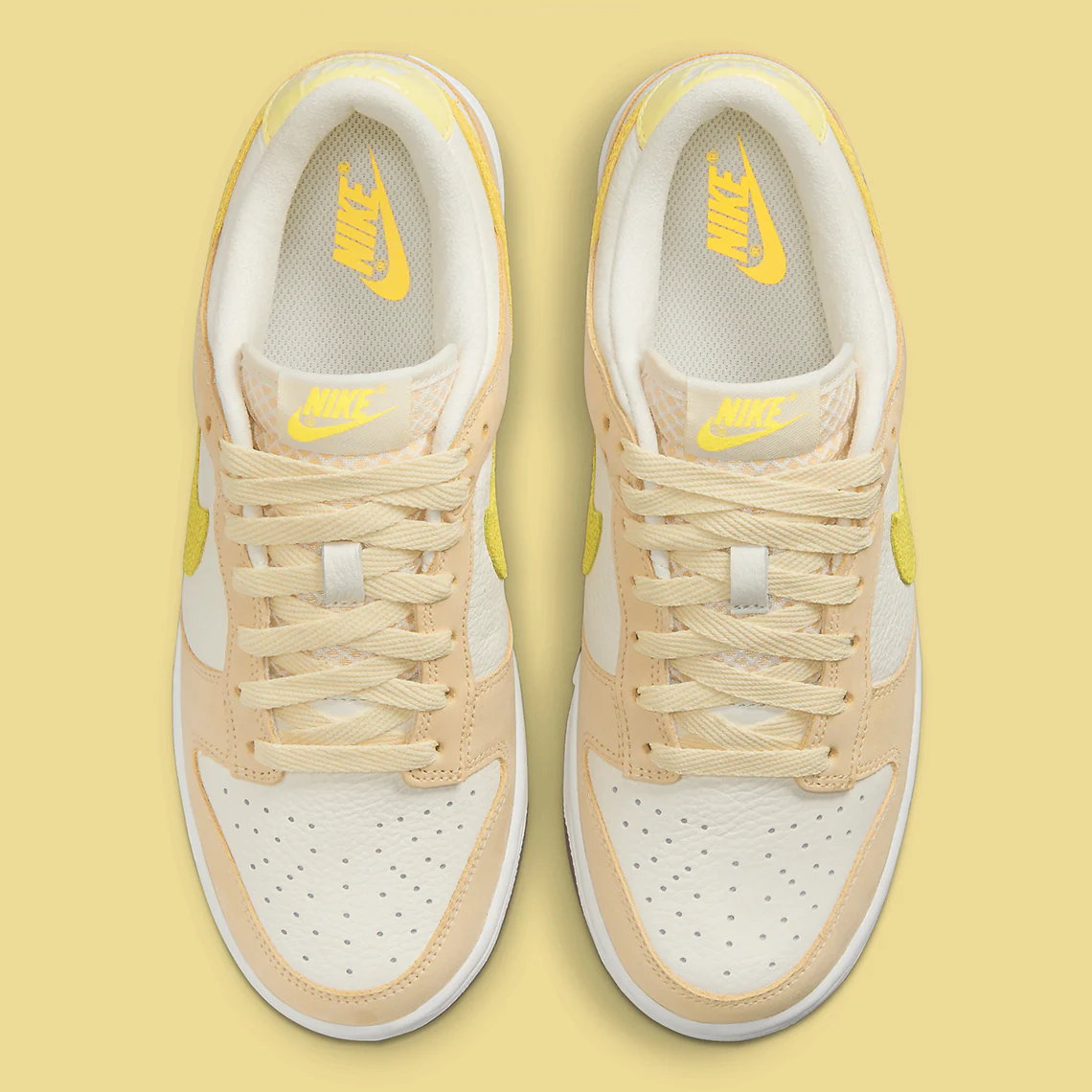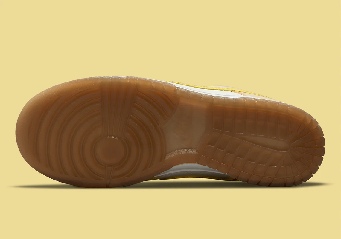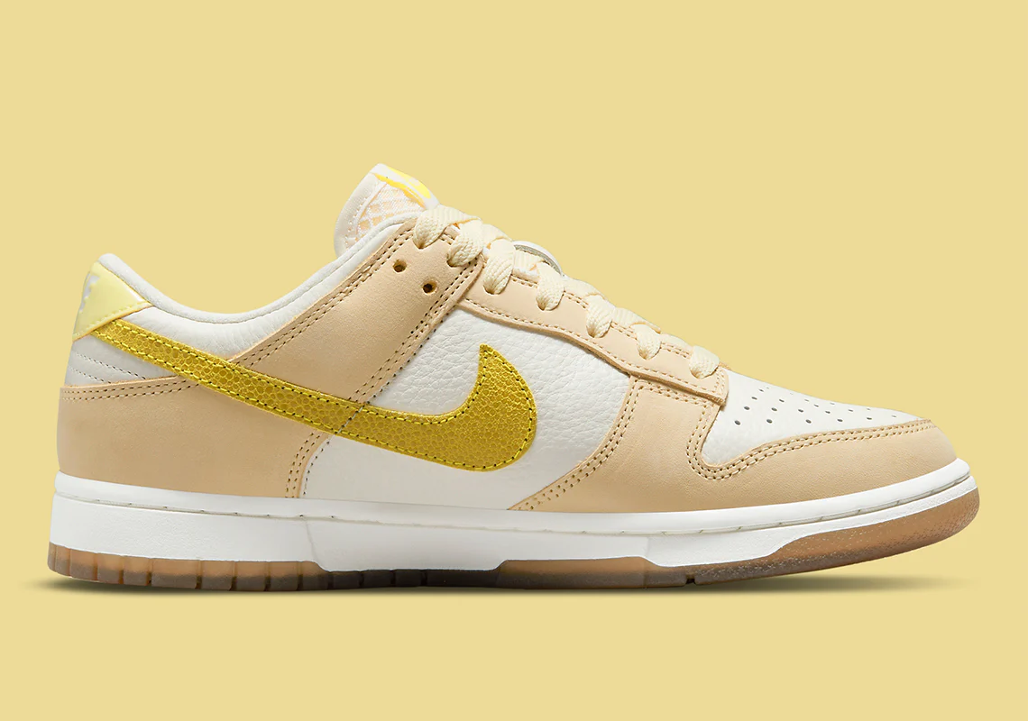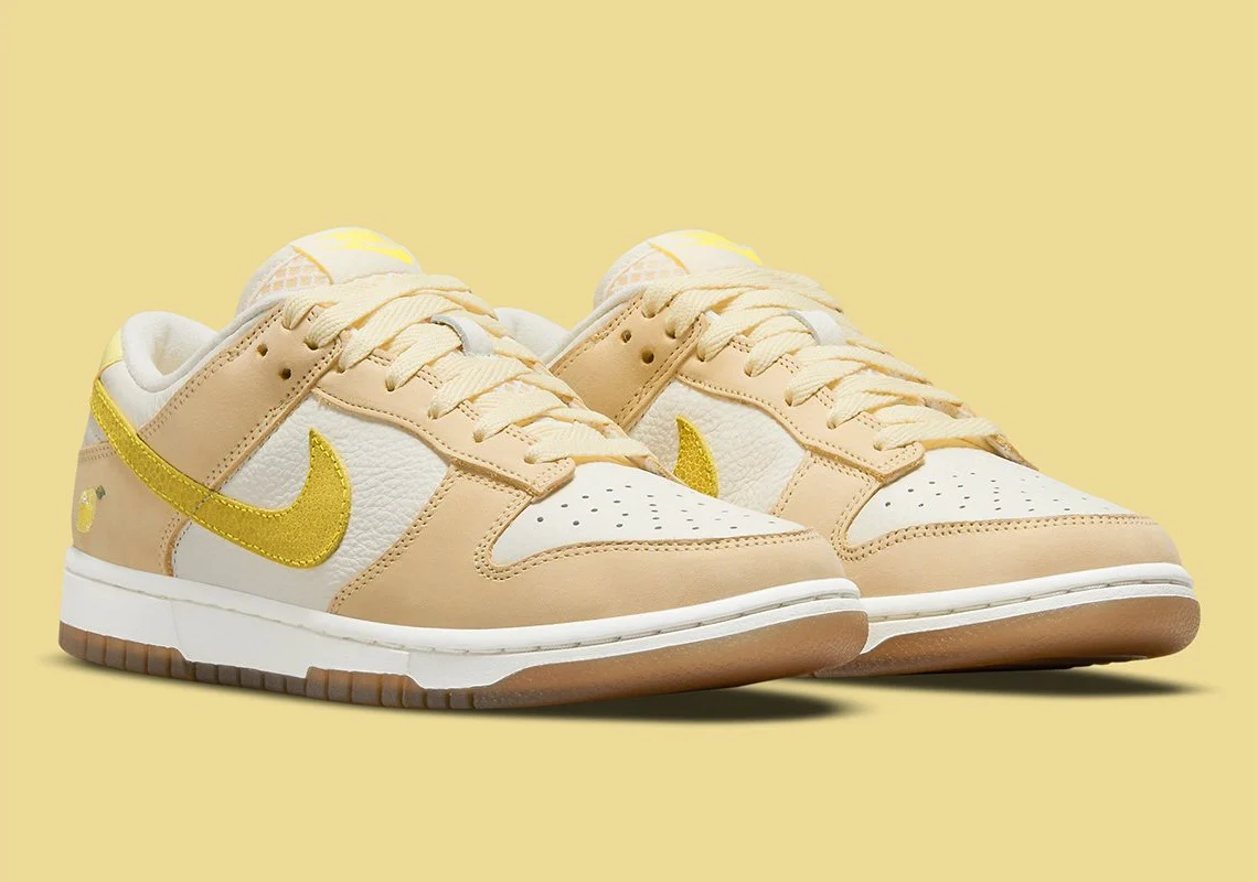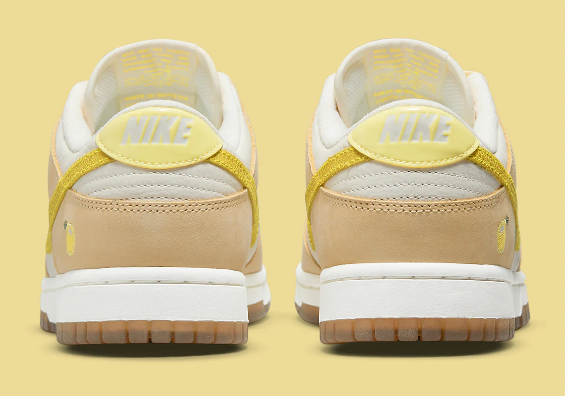 Semblable aux coloris déjà vus, la paire se livre à un cuir blanc cassé qui ouvre la voie à des superpositions en daim inspirées des agrumes. L’avant-pied, les protections en dentelle et la majeure partie du talon sont recouverts de jaune pâle. En comparaison, les swooshes de profil, les panneaux de talon supérieur de marque «NIKE» et les étiquettes sur la languette présentent un mélange brillant de «Opti Yellow» et de «Zitron». Pourtant, le citron brodé sur le talon latéral vole sans doute la vedette, car il relie bien la palette de couleurs thématiques. Sous les pieds, les semelles intermédiaires optent pour un maquillage blanc éprouvé, tandis que les semelles extérieures préfèrent une finition marron opaque.
