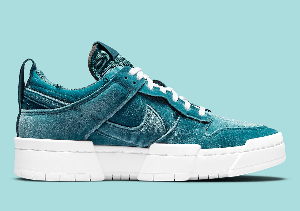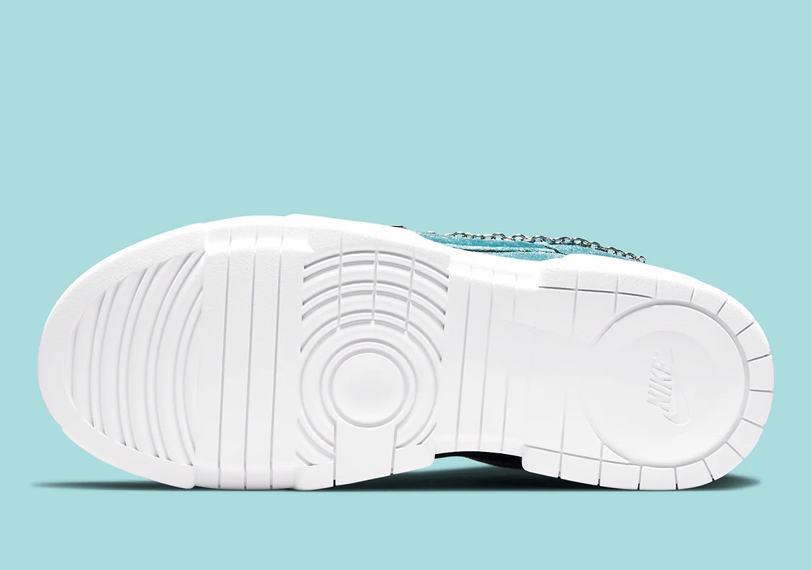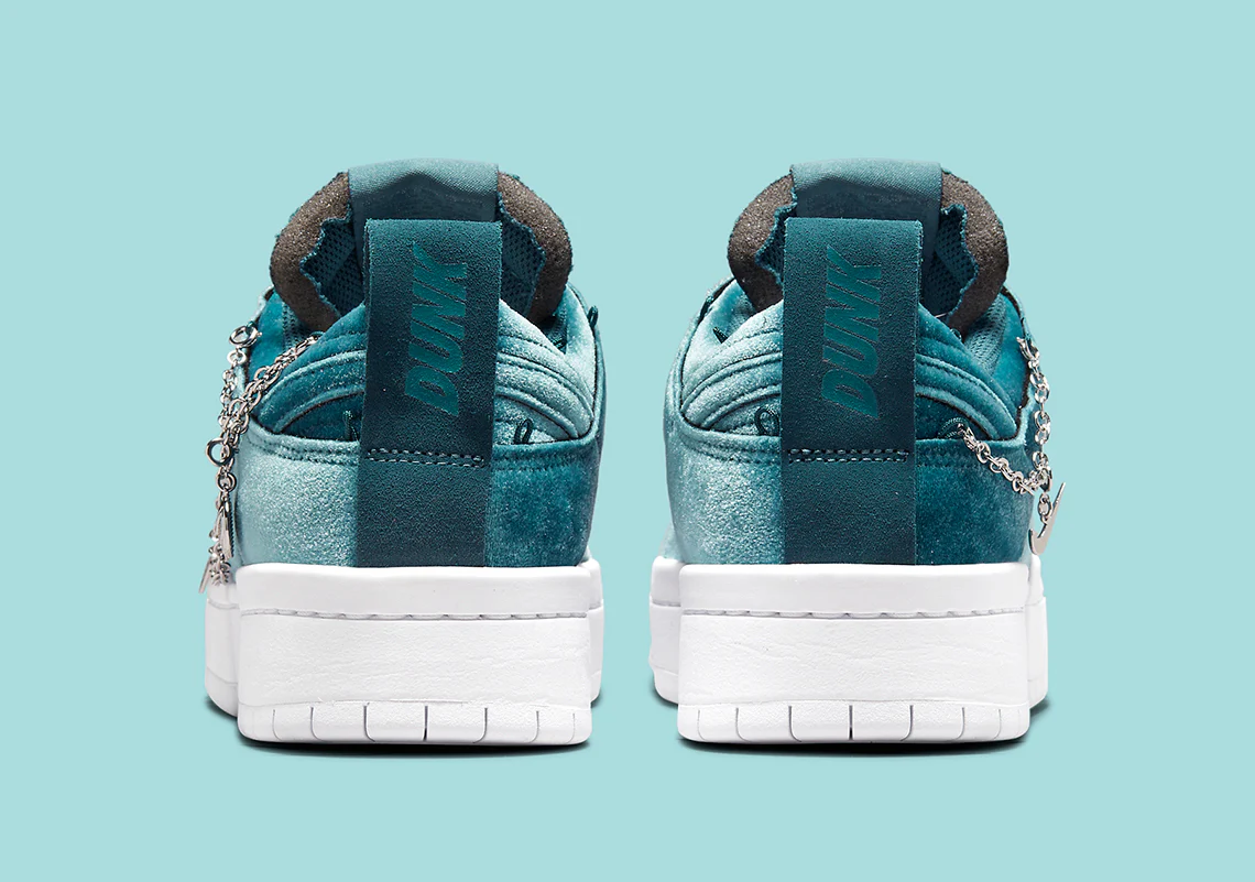 La Nike Dunk Low Lucky Charms Ash Green a une tige en velours bleu sarcelle qui crée une dimension riche qui passe du brillant au mat. La sneaker repose sur sa semelle signature Disrupt, assortie aux lacets blancs. Pour un détail enchanteur supplémentaire, le Nike Swoosh est orné d’un motif à maillons argentés qui comporte des « porte-bonheur », comme un ballon de basket et une boîte à chaussures Nike.
