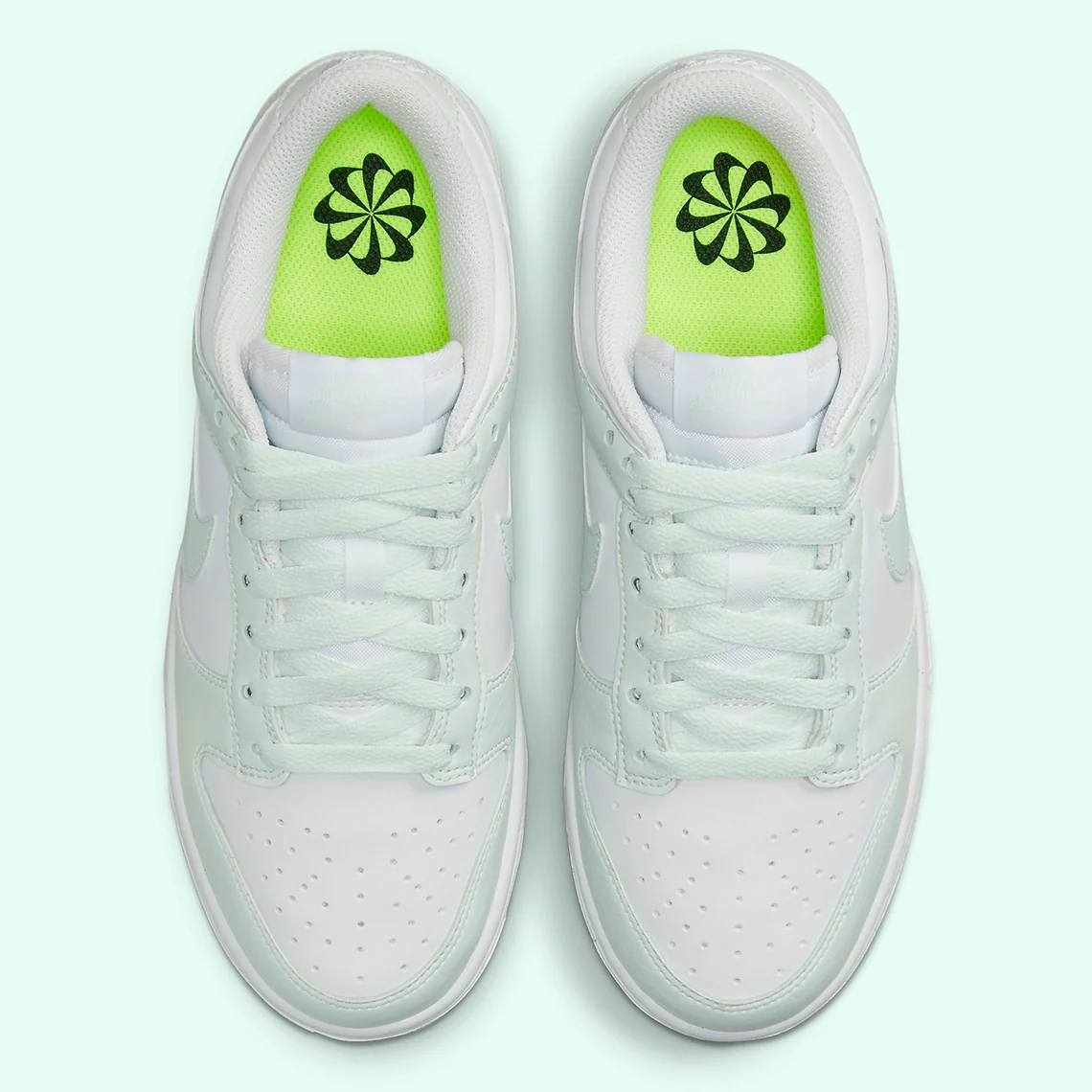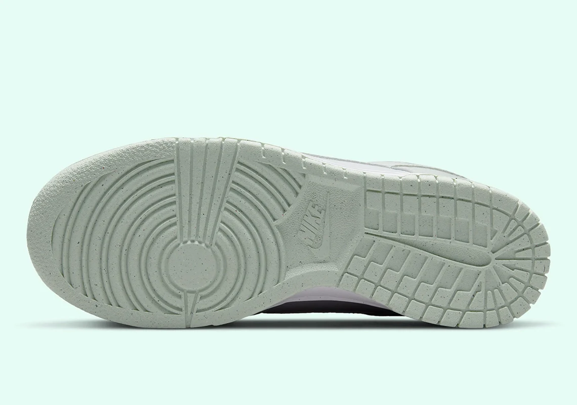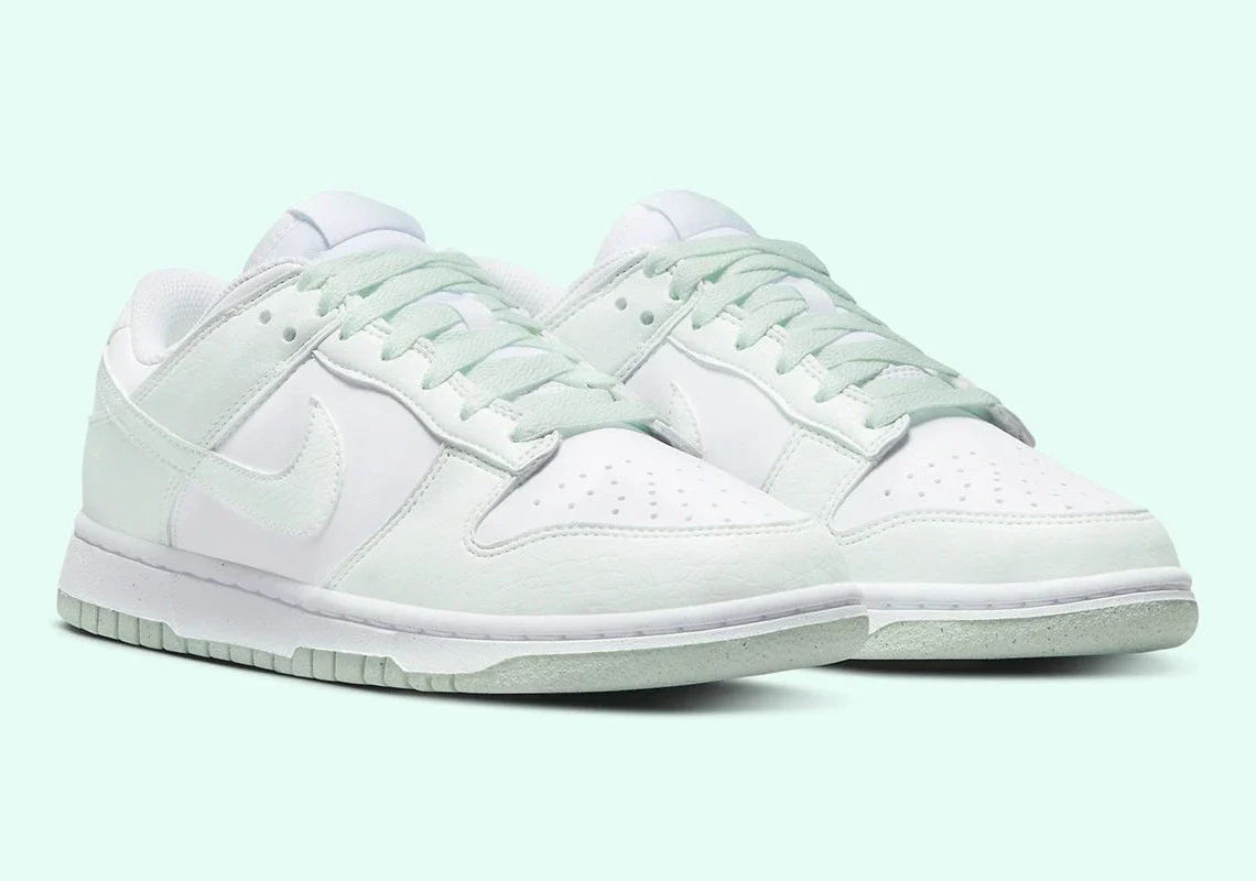 La Dunk Low Next Nature White Mint ressemble aux paires standard. La couleur d’accent réside dans les superpositions en cuir synthétique, tandis qu’une base blanche garde les choses simples et proches du gilet des offres originales sur le thème de l’université.