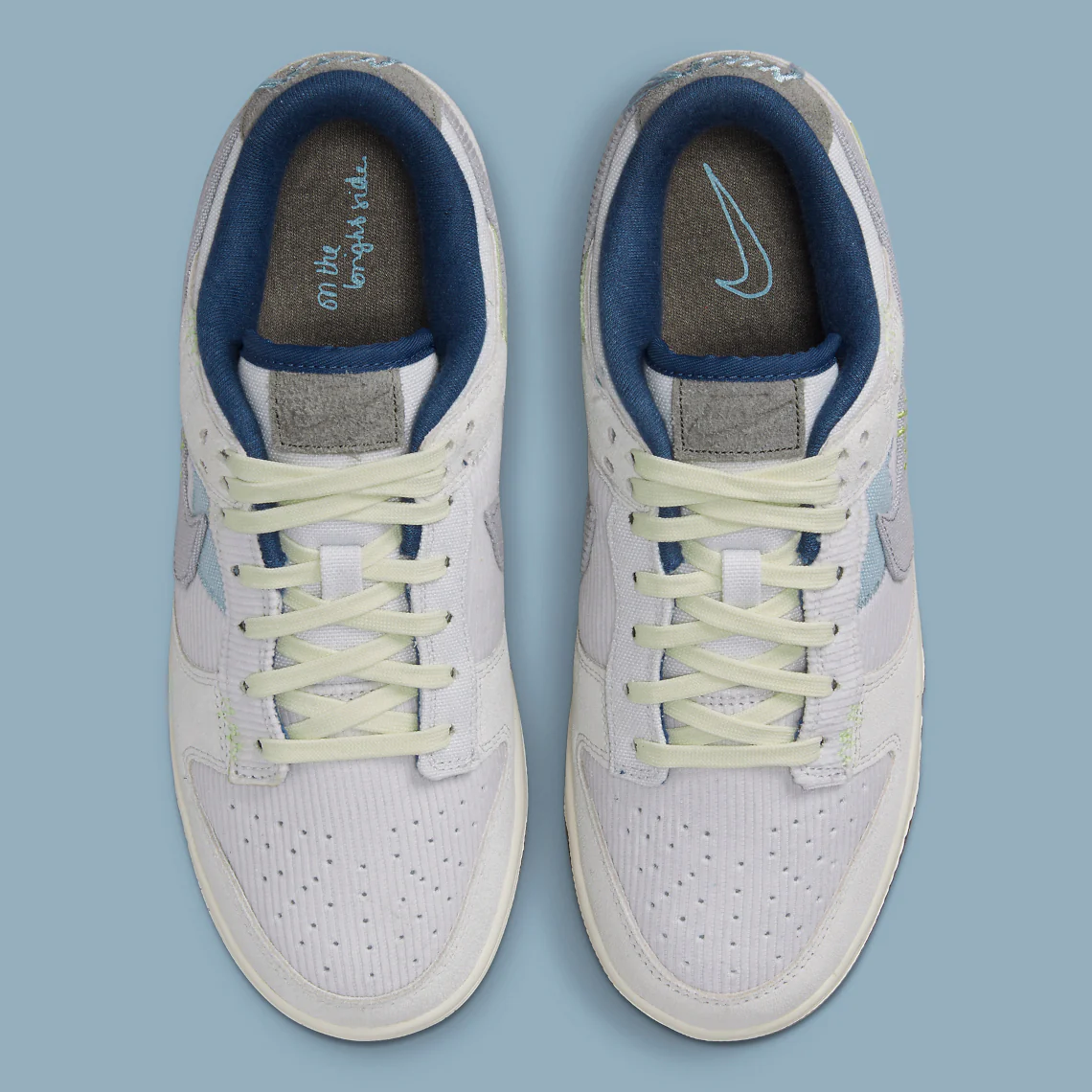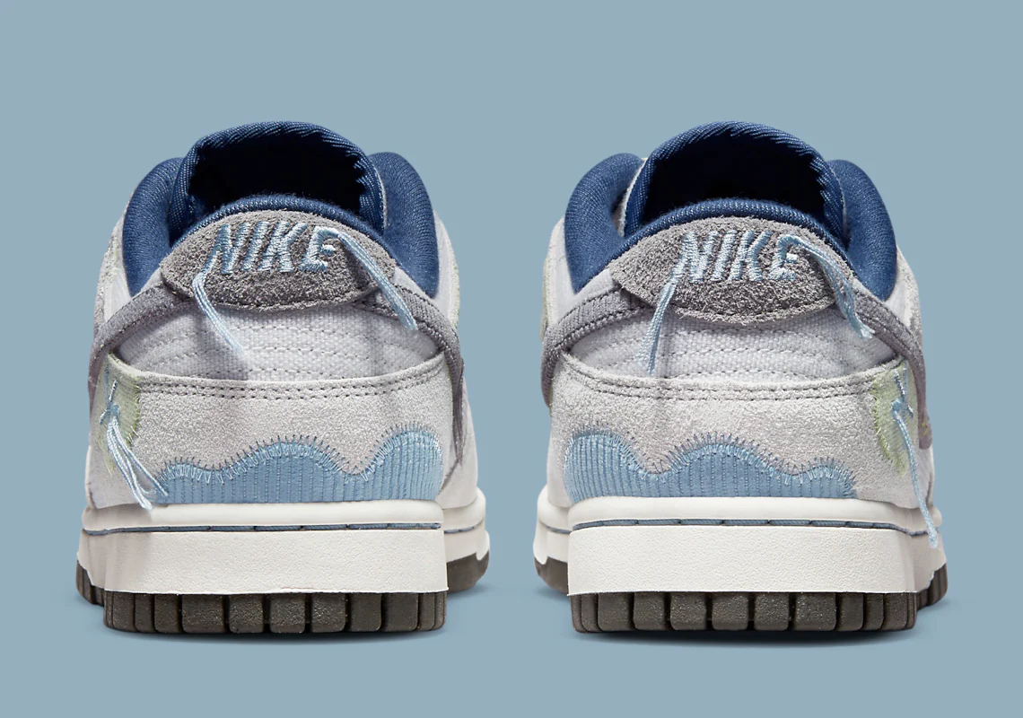 Une semelle extérieure noire mouchetée suggère que la dernière Nike Dunk suit les efforts de la marque en matière de développement durable, ce que le mélange « aléatoire » de velours côtelé, de daim, de nylon et de toile sur la tige vient renforcer. Des détails effilochés apparaissent au niveau du milieu du pied, du talon et de la colonne vertébrale, accompagnant des patchs brodés semblables à des fleurs qui crient « printemps ». Le message « du bon côté » peut donc faire référence à la construction des baskets, qui ont été transformées en une option de chaussure portable et attrayante. Une autre possibilité est que la déclaration de quatre lettres a été formulée pour la Saint-Valentin, rappelant aux porteurs qu’il y a toujours un « bon côté » à un chagrin d’amour. Quelle que soit l’inspiration derrière ces chaussures, le mélange de gris et de bleu marine qui recouvre une grande partie de la dernière version du modèle de Peter Moore, vieux de 37 ans, ne manquera pas d’alimenter le « moment » du modèle.