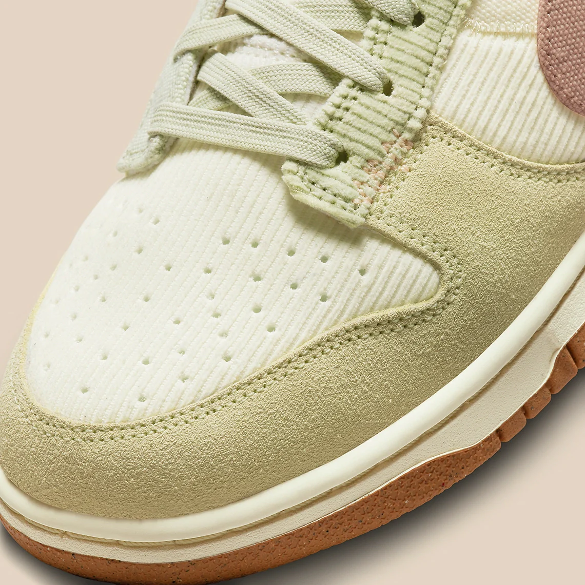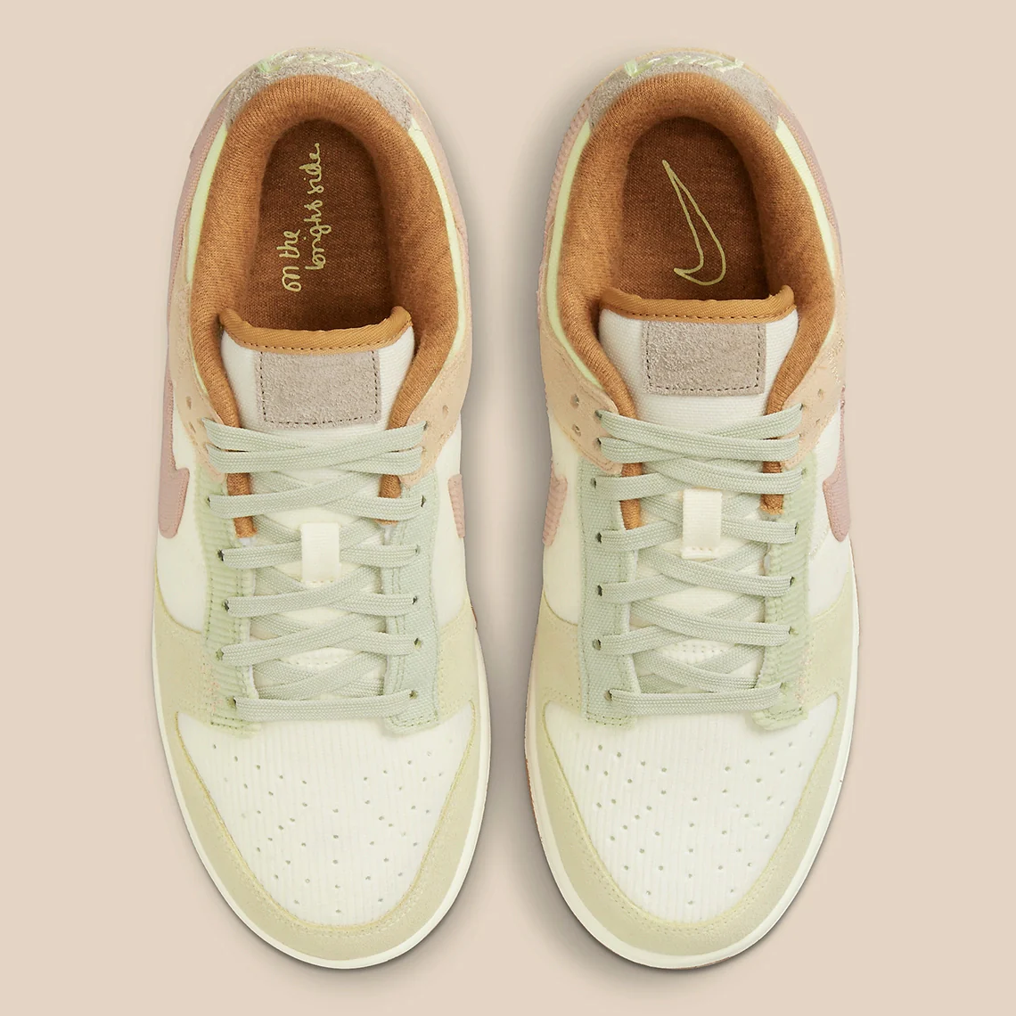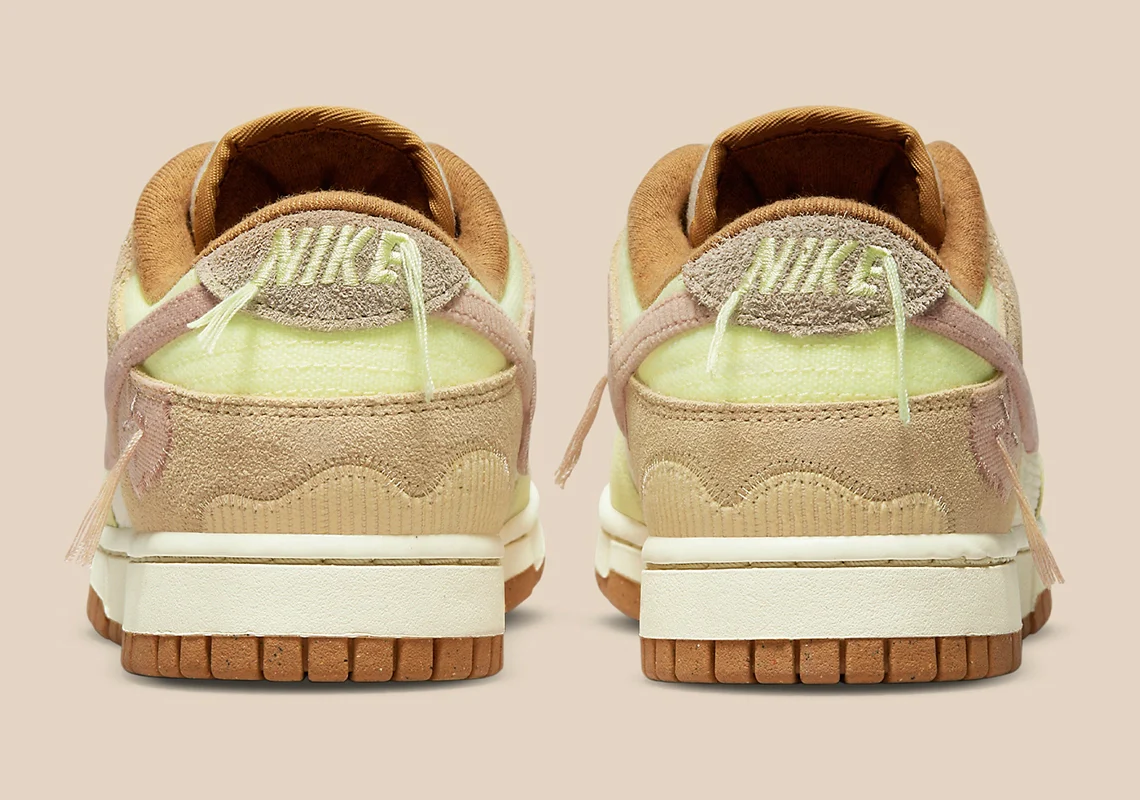 La Dunk Low « On The Bright Side » est beaucoup plus décorative avec des motifs floraux et d’autres éléments visuels naturels qui apparaissent tout autour de la tige, tandis qu’un matériau côtelé semblable à du velours côtelé est placé de façon aléatoire sur les logos Swoosh, le talon et les cols de lacets. Un sergé de denim et du daim recouvrent le reste, tandis qu’une doublure intérieure en peluche suggère un look artisanal.