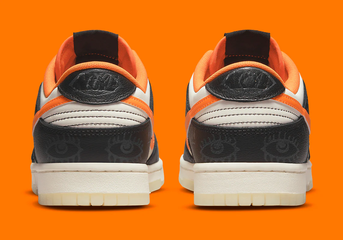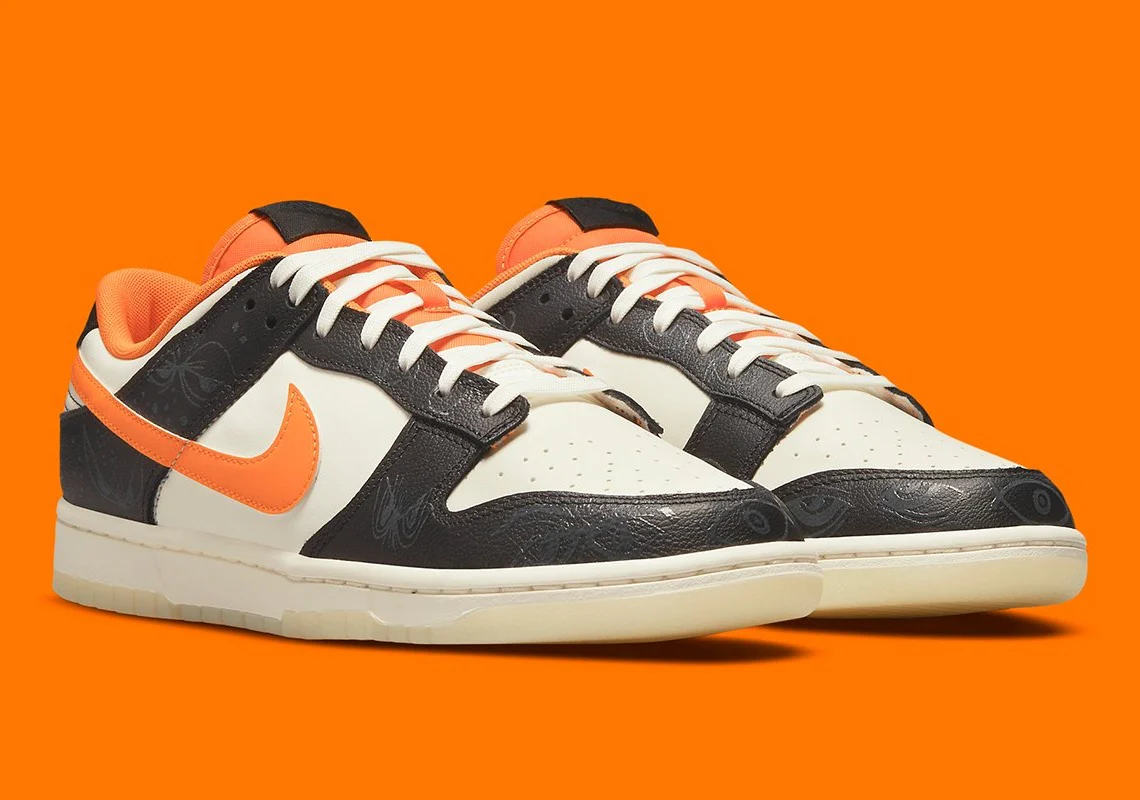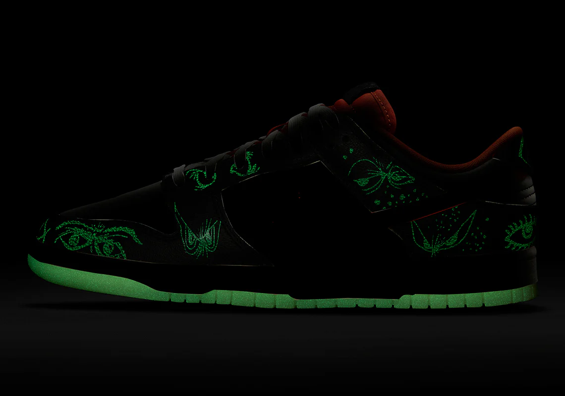 La Nike Dunk Low PRM Halloween (2021) revisite la silhouette culte avec une esthétique sombre, mystique et parfaitement calibrée pour la saison. Sa tige mêle cuir noir premium et blanc cassé, créant un contraste net relevé par des accents orange pumpkin éclatants sur le swoosh, le talon et la languette. Mais la vraie magie opère une fois la lumière éteinte : les empiècements noirs sont ornés de motifs effrayants phosphorescents, invisibles de jour mais lumineux la nuit, révélant toiles d’araignée, yeux et silhouettes mystérieuses.