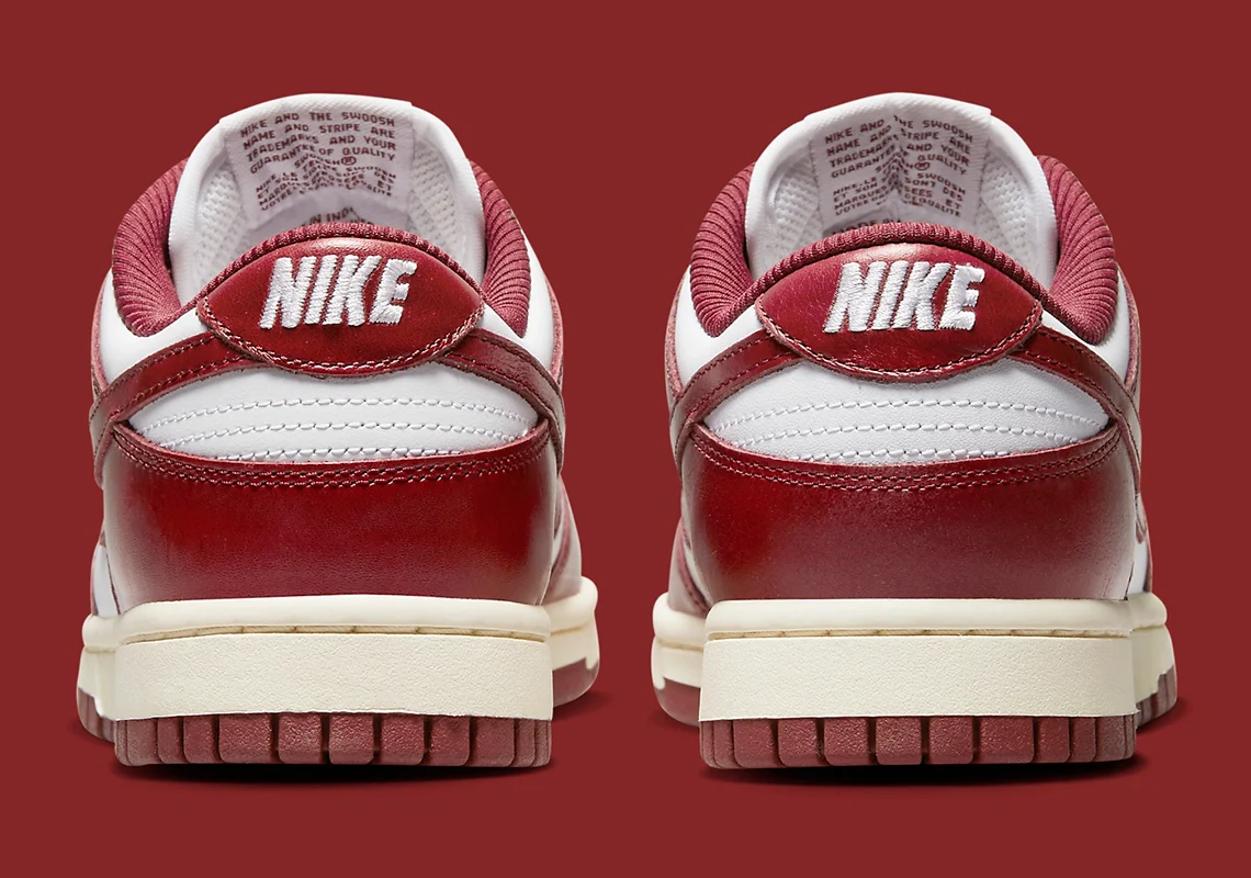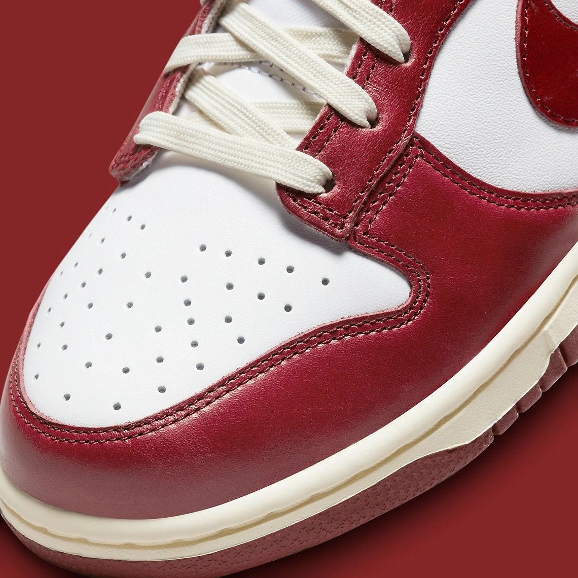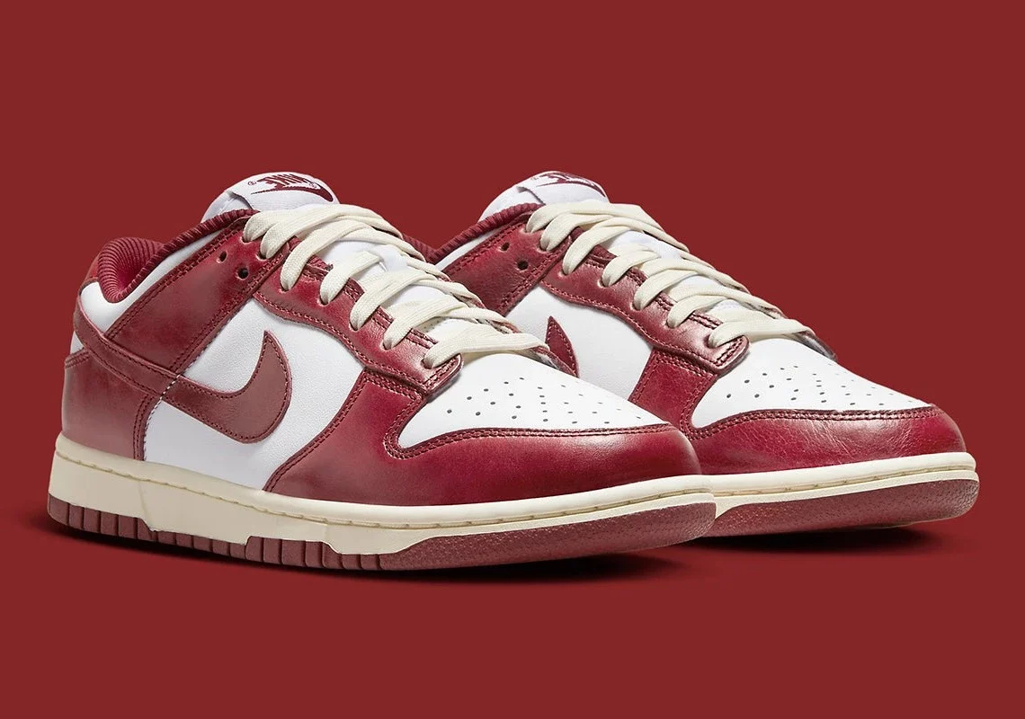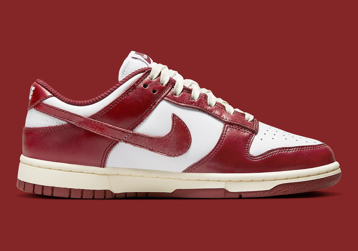 Dévoilée ici via des images officielles, la Dunk Low Vintage « Team Red » se compose d’un extérieur en cuir usé de couleur rouge sur une base en cuir blanc propre et lisse. Les lacets plus épais de type varsity sont recouverts d’un blanc de voile, tandis que la doublure intérieure présente une texture côtelée similaire aux poignets des vestes varsity. La semelle jaunie est peut-être le détail le plus efficace pour obtenir cette attitude Vintage.