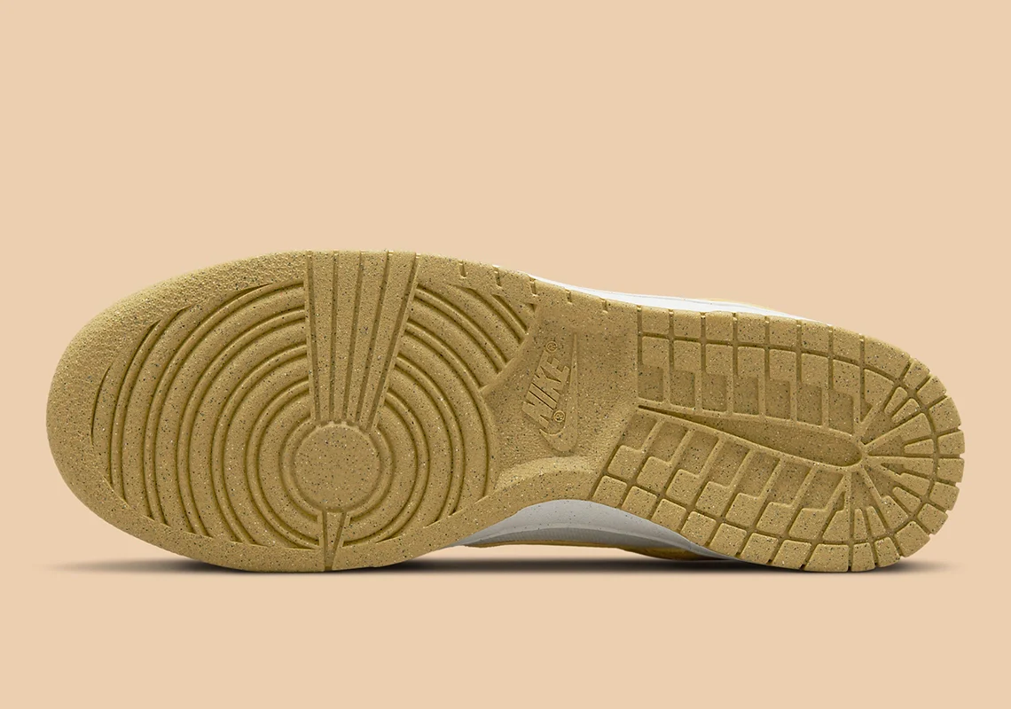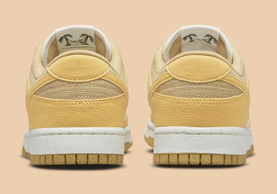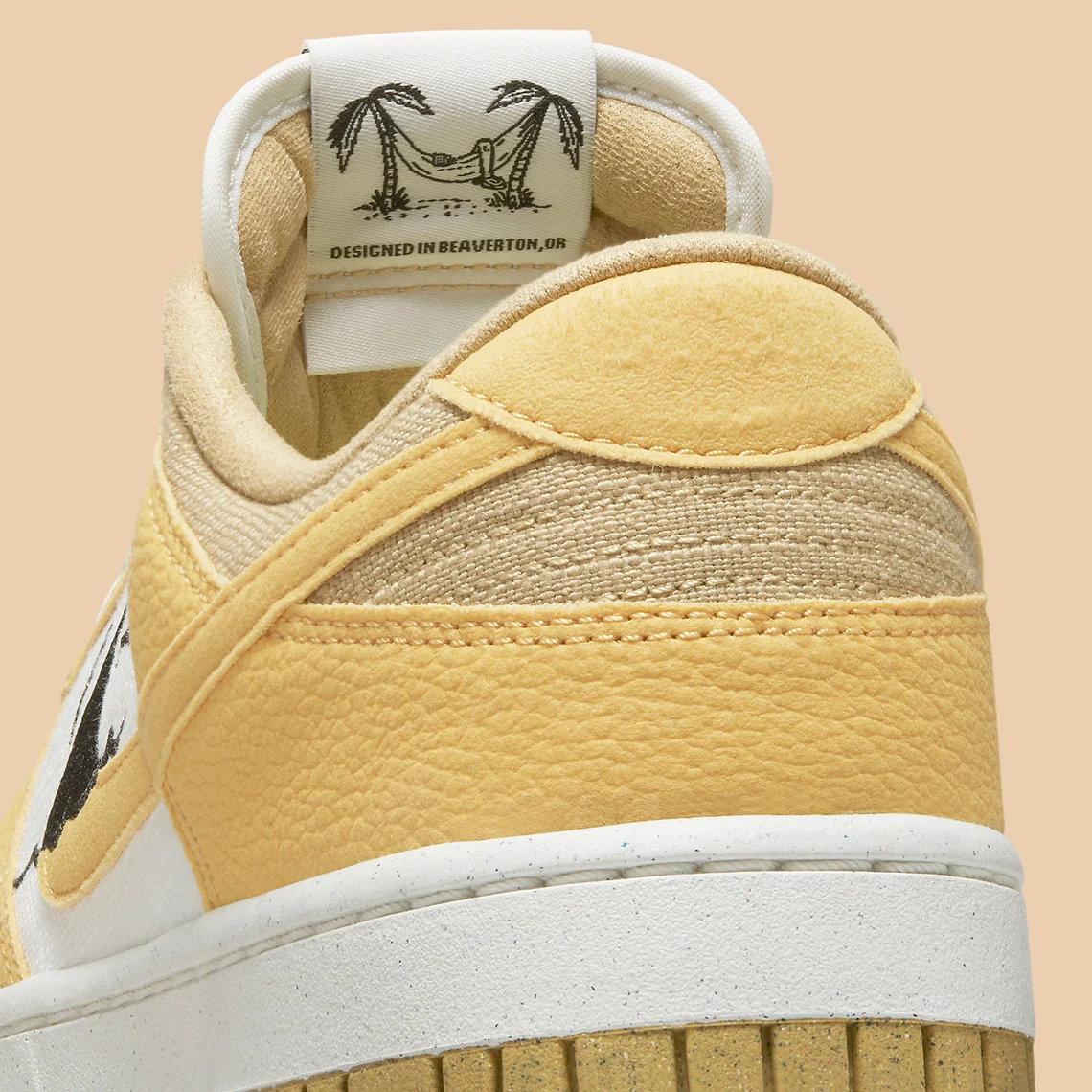 La tige est recouverte d’un mélange de jaune soleil, de blanc et de beige sur une construction en cuir et en textile. Autour de la boîte d’orteils en textile, un garde-boue en cuir jaune soleil s’enroule pour rejoindre les baies oculaires de la même couleur, contrastée par un ensemble de lacets plats blancs. Sous ces lacets se trouve une languette en textile blanc avec le logo Nike Sun Club sur la languette, et des palmiers sur le revers. La plus grande touche de motifs estivaux se trouve sous la forme du Swoosh sur les côtés, habillé de jaune avec une broderie noire sur le bout, formant une vague océanique. Une petite touche de textile beige est présente sur le col et la semelle intérieure, avec des semelles intérieures vert fluo. Le tout est associé à une semelle intermédiaire blanche et à une semelle extérieure en caoutchouc Nike Grind composée de matériaux recyclés.