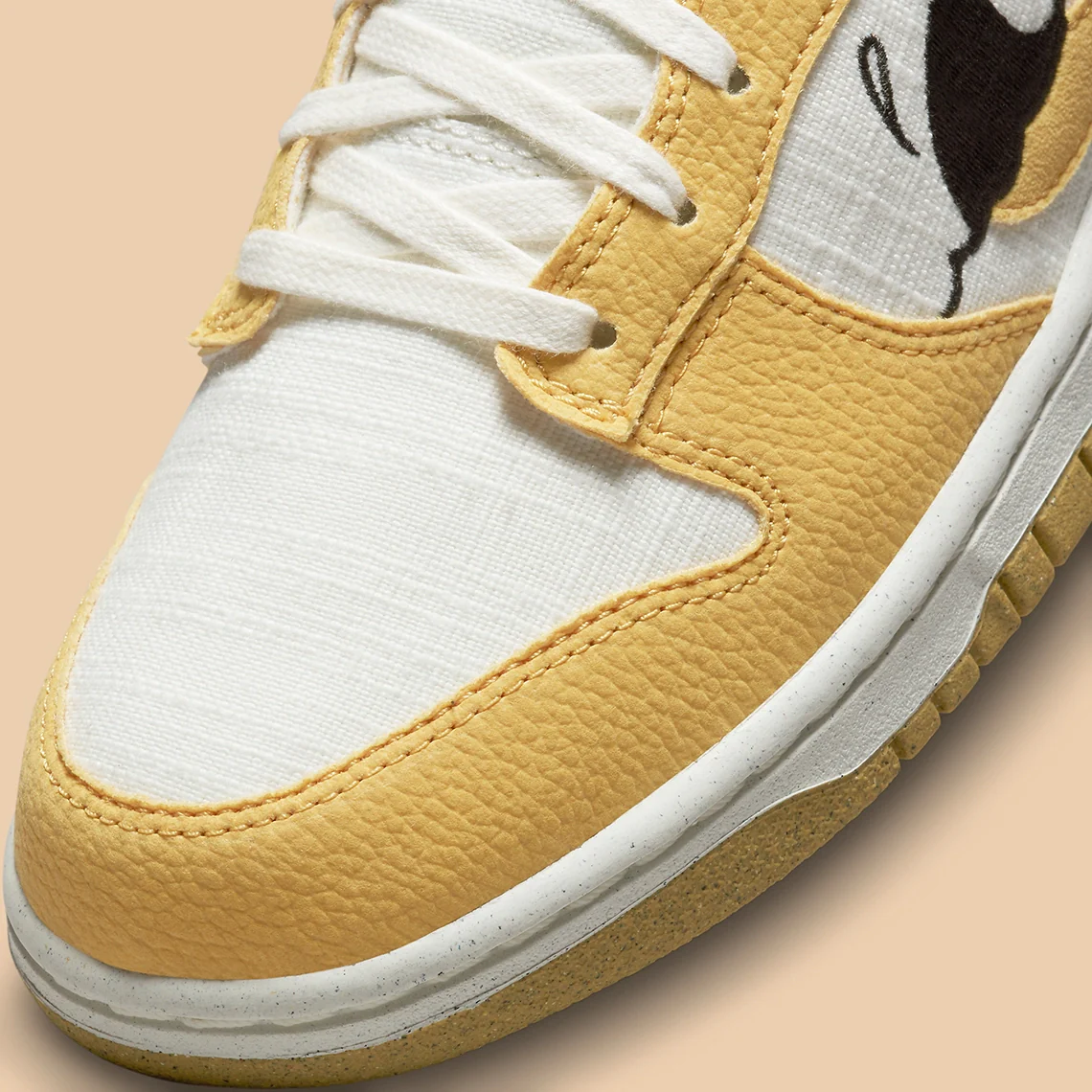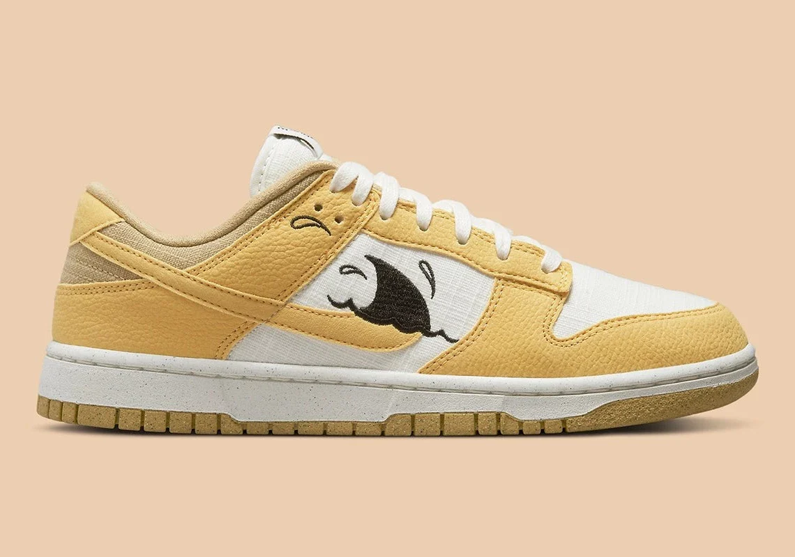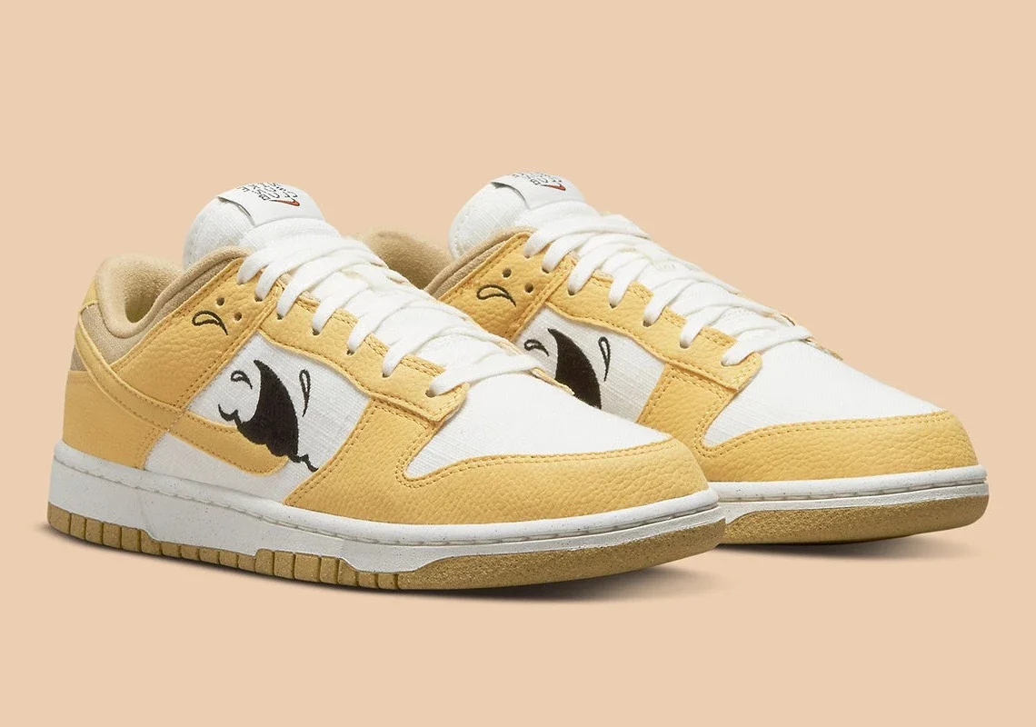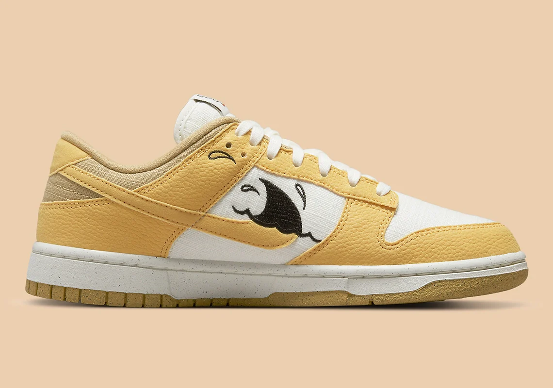 La tige est recouverte d’un mélange de jaune soleil, de blanc et de beige sur une construction en cuir et en textile. Autour de la boîte d’orteils en textile, un garde-boue en cuir jaune soleil s’enroule pour rejoindre les baies oculaires de la même couleur, contrastée par un ensemble de lacets plats blancs. Sous ces lacets se trouve une languette en textile blanc avec le logo Nike Sun Club sur la languette, et des palmiers sur le revers. La plus grande touche de motifs estivaux se trouve sous la forme du Swoosh sur les côtés, habillé de jaune avec une broderie noire sur le bout, formant une vague océanique. Une petite touche de textile beige est présente sur le col et la semelle intérieure, avec des semelles intérieures vert fluo. Le tout est associé à une semelle intermédiaire blanche et à une semelle extérieure en caoutchouc Nike Grind composée de matériaux recyclés.
