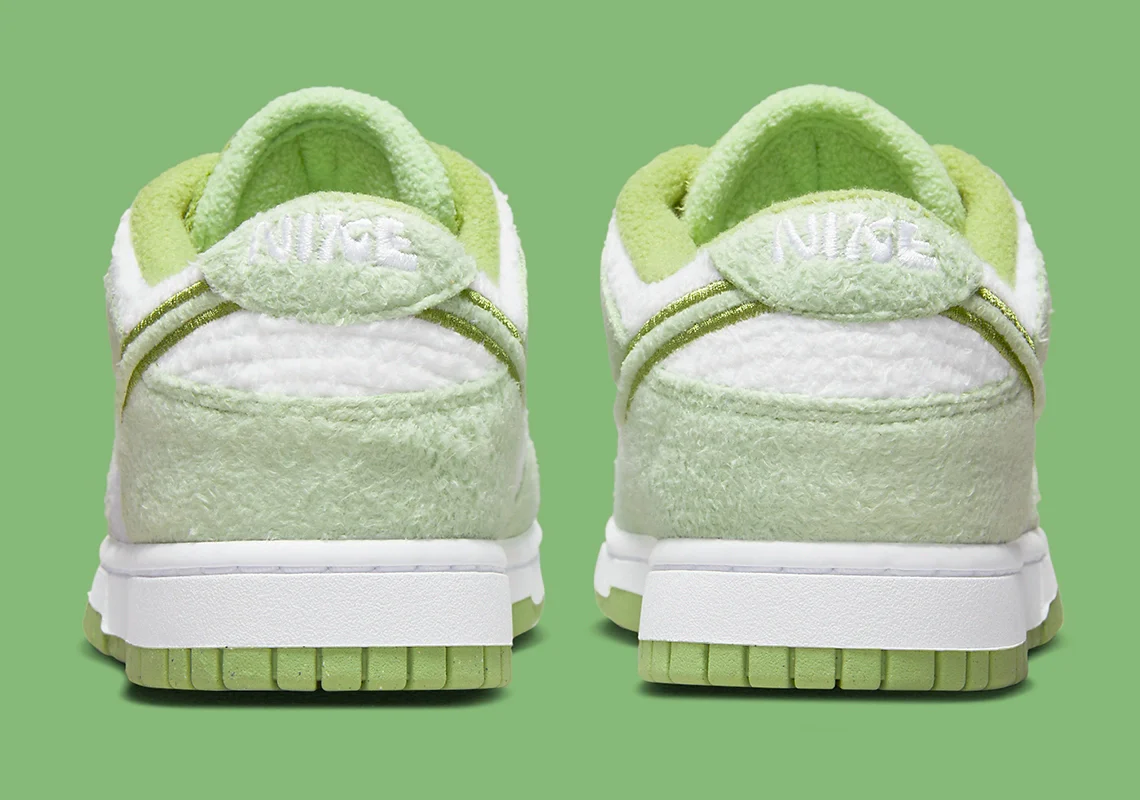 L’empeigne en cuir lisse bicolore de la Nike Dunk a offert des possibilités estivales infinies pour l’une des silhouettes les plus convoitées à ce jour. Alors que le modèle suit la transition saisonnière, le Swoosh choisit la polaire pour recouvrir l’intégralité de sa construction low-top avec une paire de Nike Dunk Low vert citron et blanc. Conformément à la conversion de la marque de Beaverton à des tissus et textiles plus chauds à l’approche des mois d’automne, la paire à venir est habillée d’un matériau laineux qui remplit également la doublure intérieure pour un ajustement confortable. Le garde-boue, le recouvrement des quartiers et le contrefort du talon sont tous d’un vert menthe qui suit le même style sur les lacets, la languette arrière et la garniture de la langue, tandis que les autres panneaux contrastent en blanc. Pour conclure l’ensemble pistache, la teinte dominante traite la bande de roulement et le Swoosh au milieu du pied, tandis que la garniture et la languette sont finies avec les spectres tonaux établis en teinte olive vif.