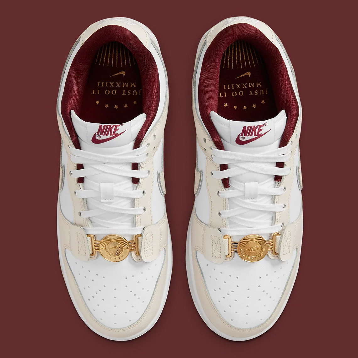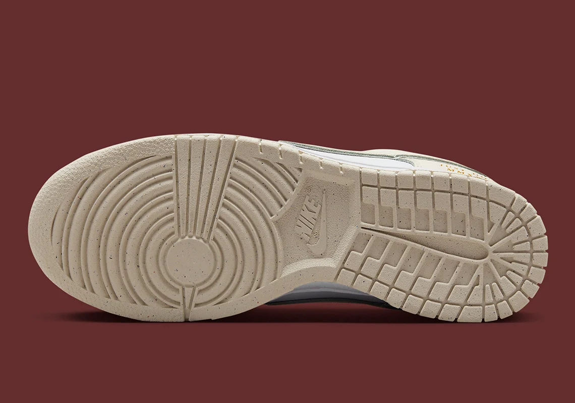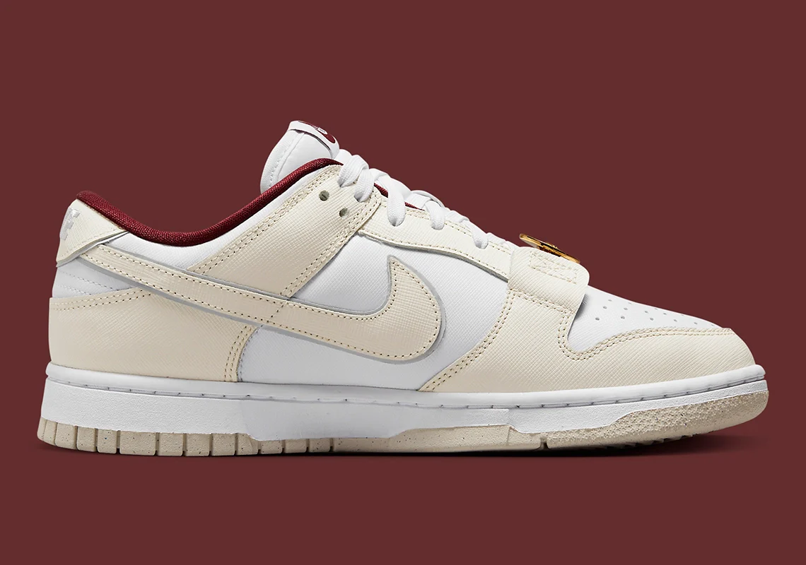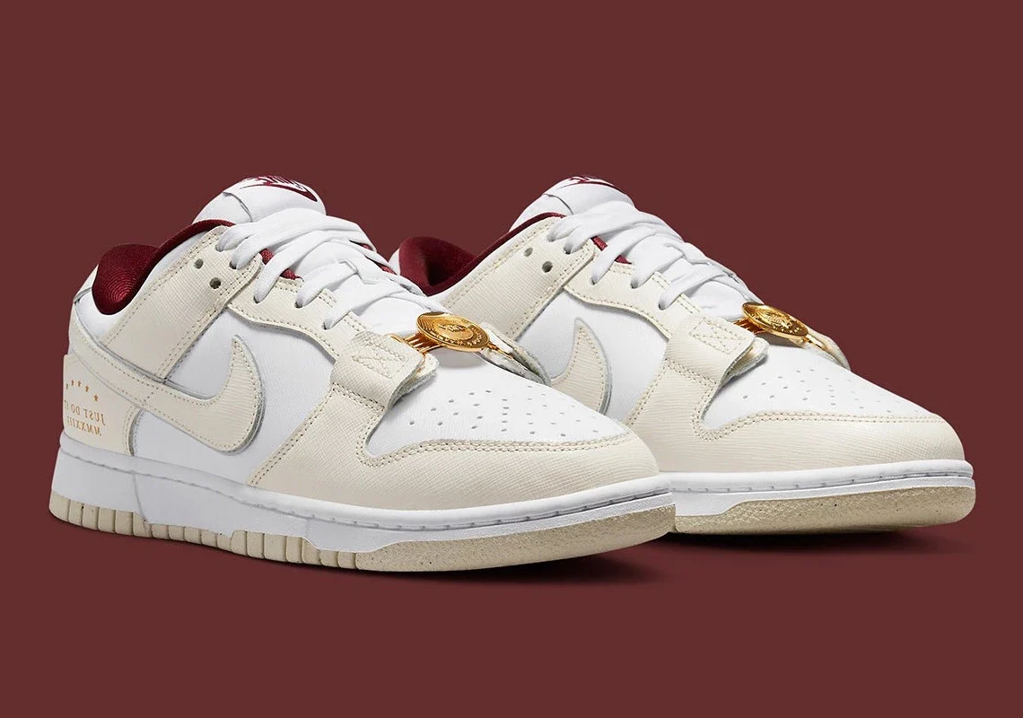 La Nike Dunk Low « Just Do It » est complétée par une deuxième version qui relève de ce concept. Les mêmes options de couleurs (voile, mousseline et rouge) sont de retour, avec le détail du chiffre romain doré sur le talon et le lacet doré agrandi qui semble être un artefact des temps anciens. Le lettrage sur le talon indique l’année 2023, ce qui signifie une sortie prochaine (avec un peu de chance au printemps 2023).