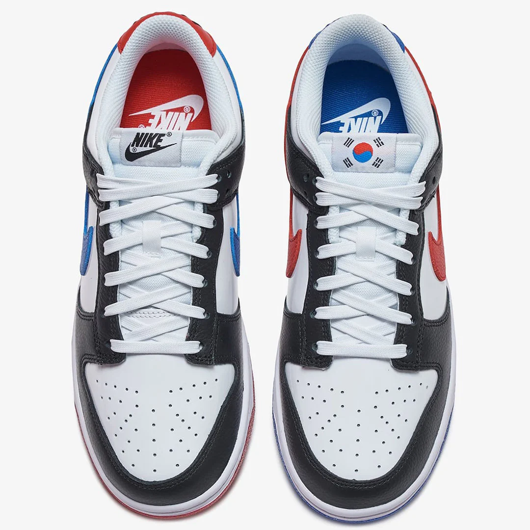 La Dunk Low Seoul a une base blanche avec un garde-boue, un œillet et un collier arrière en cuir noir. Un Swoosh rouge avec une semelle extérieure bleue translucide est visible sur la paire gauche et l’inverse sur la droite. Cela s’inspire du cercle rouge et bleu qui se trouve au centre du drapeau et qui représente l’équilibre. Les talons sont également dépareillés avec le logo Nike cousu phonétiquement à l’arrière en coréen. Le Taegukgi est également orné sur la langue gauche, tandis que le logo Nike classique se trouve sur la droite