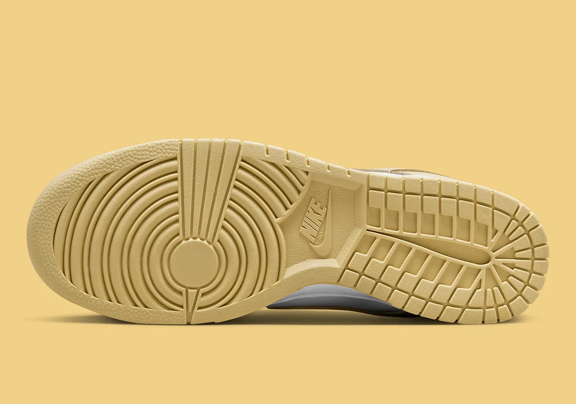 Ici, les superpositions (Swoosh, embout, languette du talon, etc.) sont de couleur bronze et s’harmonisent avec les détails adjacents tels que les lacets, la semelle extérieure et le logo Nike. Le blanc neutre complète l’ensemble avec la base en cuir, la semelle intermédiaire et la languette.