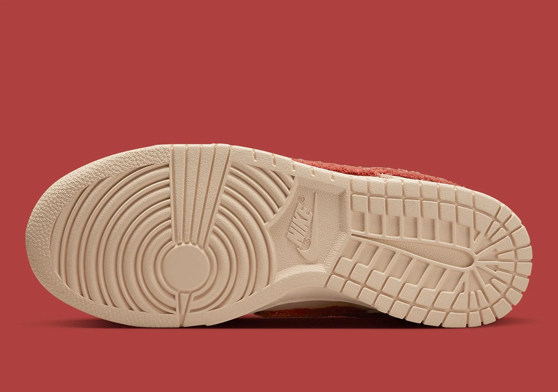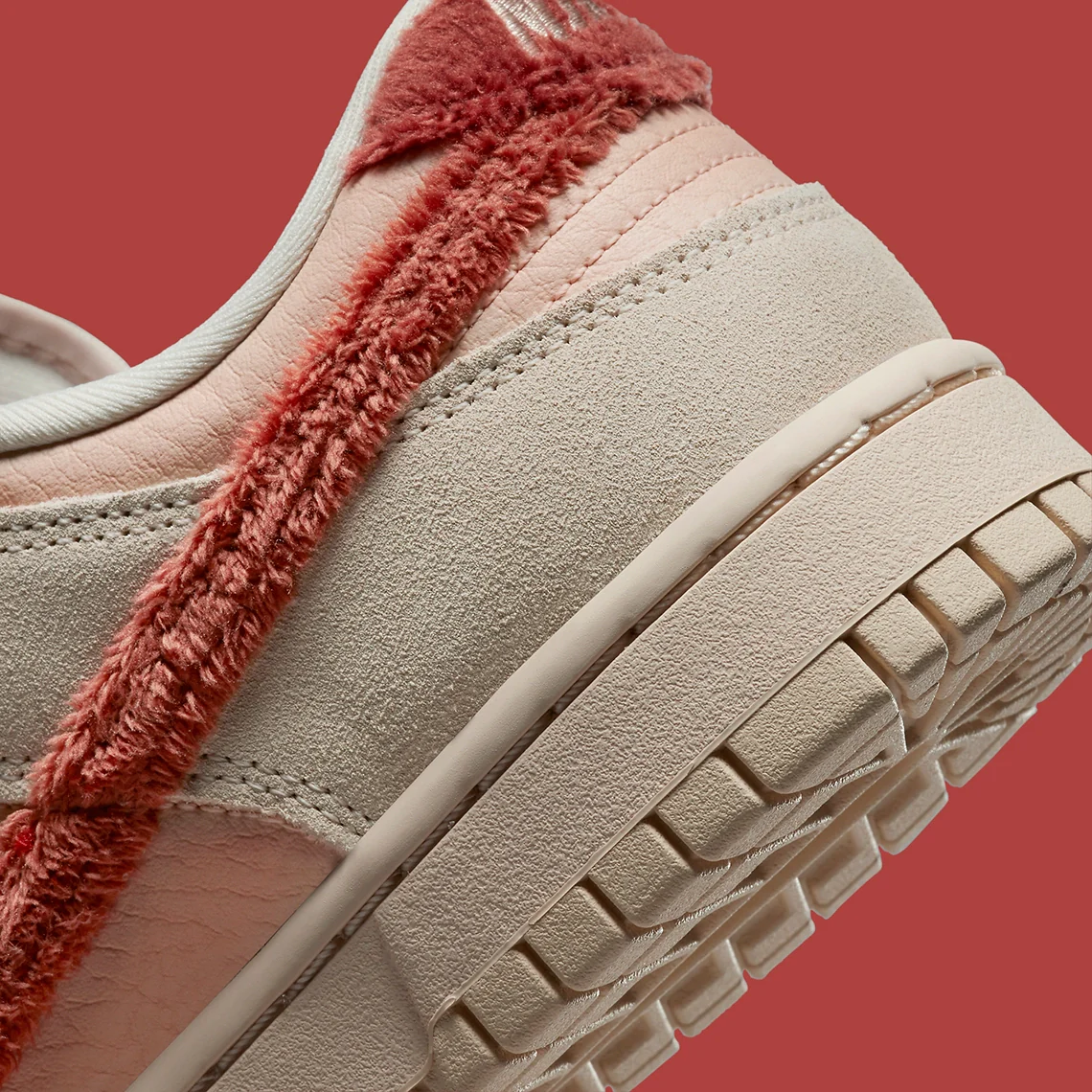 Ayant été produite dans un large éventail de couleurs et de matériaux, la Nike Dunk Low est certainement bien habituée à s’écarter de la norme. Et pour sa dernière offre (familièrement intitulée « Terry Swoosh« ) la silhouette continue d’embrasser le non conventionnel, en s’habillant d’un look beaucoup plus flou que votre GR moyenne. Comme son surnom le suggère, ces Dunk Lows font un usage audacieux du tissu éponge, l’appliquant à la fois au Swoosh et à la languette du talon. Dans sa finition rouge brûlé, la matière pelucheuse complète la construction adjacente – principalement, les roses clairs qui effleurent la base en cuir grainé. Ailleurs, le reste de la chaussure est équilibré avec un beige neutre, qui habille les superpositions en daim, la languette tissée, la semelle intermédiaire, et ainsi de suite.