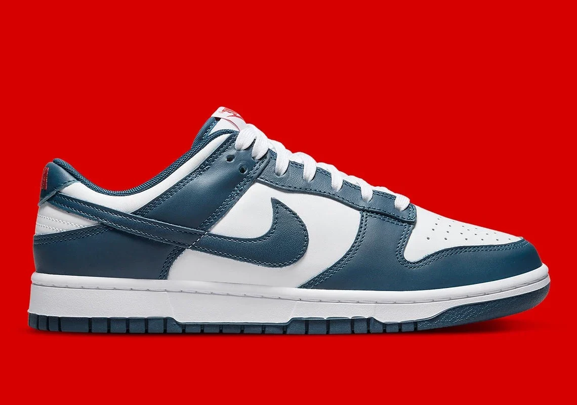 La Nike Dunk Low « USA » ou « Valerian blue » est une version de mai 2022 de la basket patriotique dans un coloris classique et une construction tout cuir. La version « USA » célèbre les principales fêtes observées aux États-Unis au printemps et en été. Ce modèle présente des superpositions bleu valérien qui sont contrastées par une base en cuir blanc sur le panneau central, les orteils et le talon. Des Swooshes bleus recouvrent les panneaux intermédiaires et des touches de rouge apparaissent sur la languette et le logo du talon pour compléter le design.
