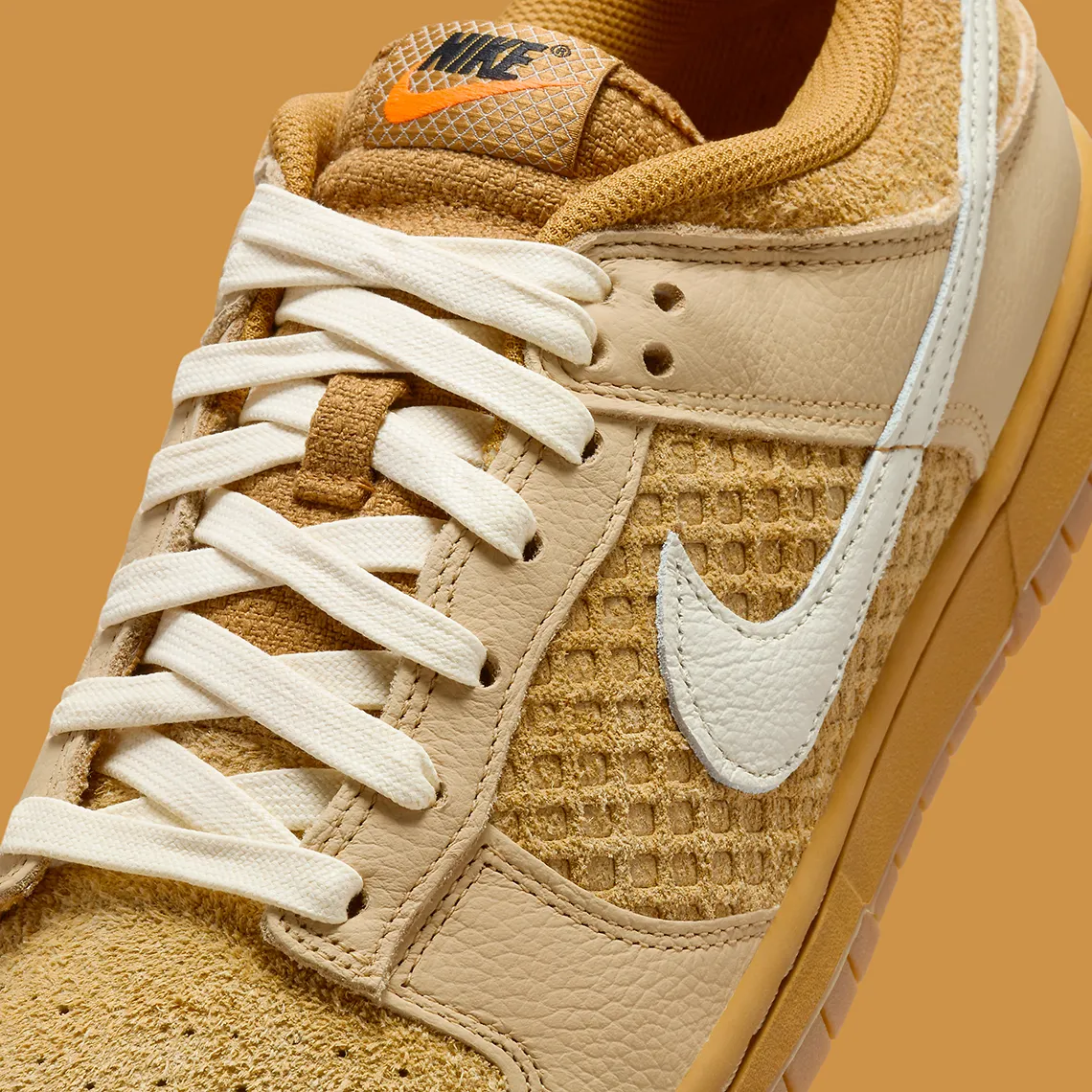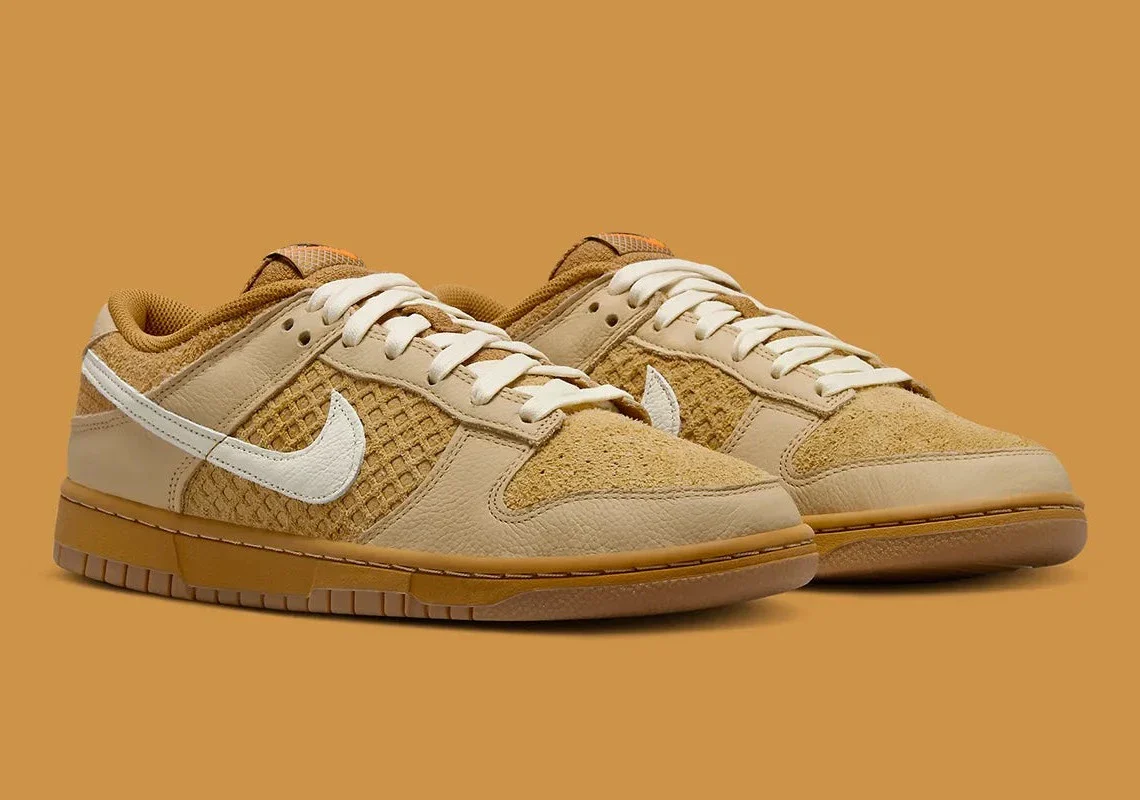 Dans cette nouvelle version, la Dunk rend hommage à ces origines excentriques avec un coloris fraîchement cuit en cuir et en daim, caractérisé par une texture gaufrée sur le panneau intermédiaire et des étiquettes sur la languette et la semelle intérieure. Les lacets et le Swoosh sont d’un blanc cassé très doux, tandis que les semelles en gomme terminent le look.