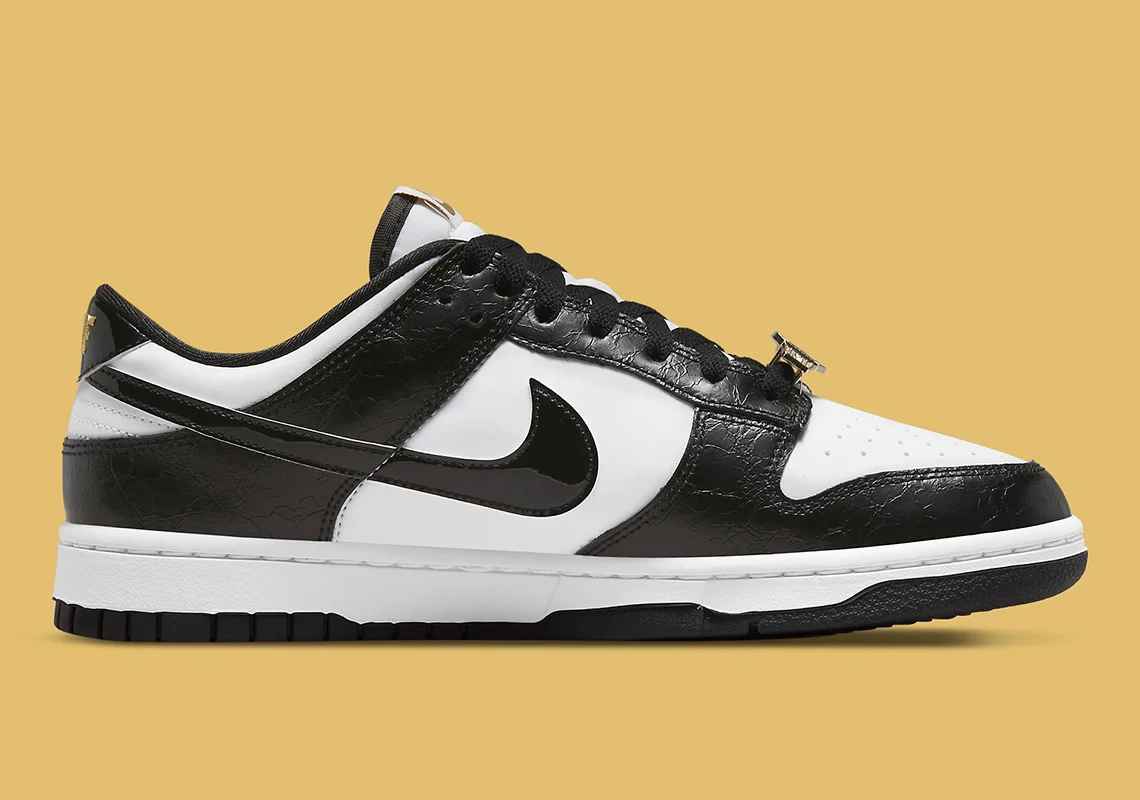 Cette version de la Dunk Low de Nike arrive dans un coloris noir et blanc toujours aussi attrayant, mais il y a quelques éléments clés de cette version Premium qui peuvent être liés à l’une des plus importantes versions de Nike Dunk de tous les temps. Alors que le bloc de couleurs blanc/noir est une copie claire de la récente mode « Panda », le cuir texturé semble vouloir apporter une touche de cuir de luxe. Le marquage NIKE doré sur la languette et le talon nous rappelle les accents dorés de la collaboration Nike SB Dunk High de Supreme en 2003, tandis que la ceinture précieuse au niveau du lacet pourrait être un clin d’œil au mantra « World Champions » du label skate/street. La semelle intérieure, quant à elle, est colorée en violet, et le marquage offre un motif tigre-camoison.