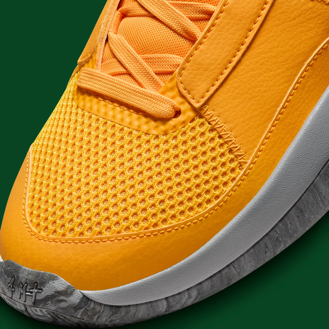 À l’instar de ses contemporaines, la dernière basket basse à coussin d’air Zoom Air arbore une teinte jaune d’or sur l’ensemble de l’empeigne en mesh et en cuir. Les insignes Ja de couleur assortie et le numéro 12 brillent, tout comme les lacets et la construction de la languette, sur un fond gris foncé. Alors que la teinte foncée a également masqué les swooshes du profil et la signature de Morant au talon, la semelle sous le pied se termine par une finition en niveaux de gris en tandem avec un détail marbré qui engloutit la bande de roulement.
