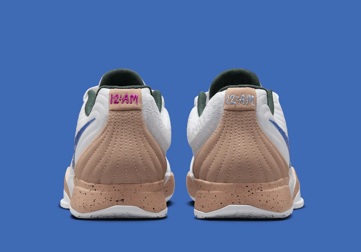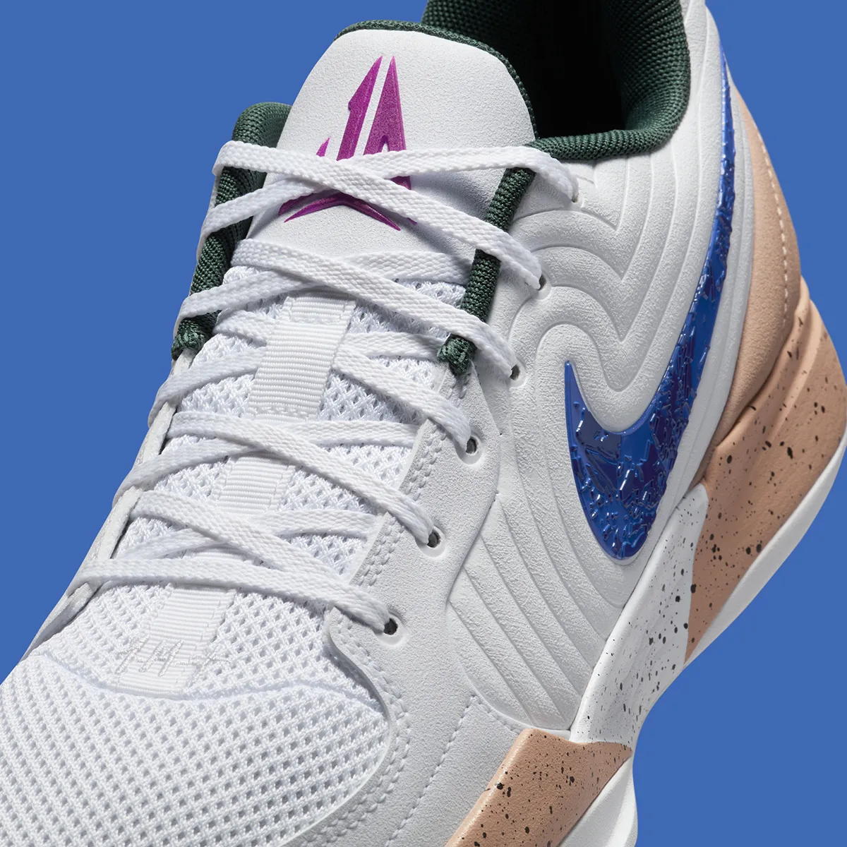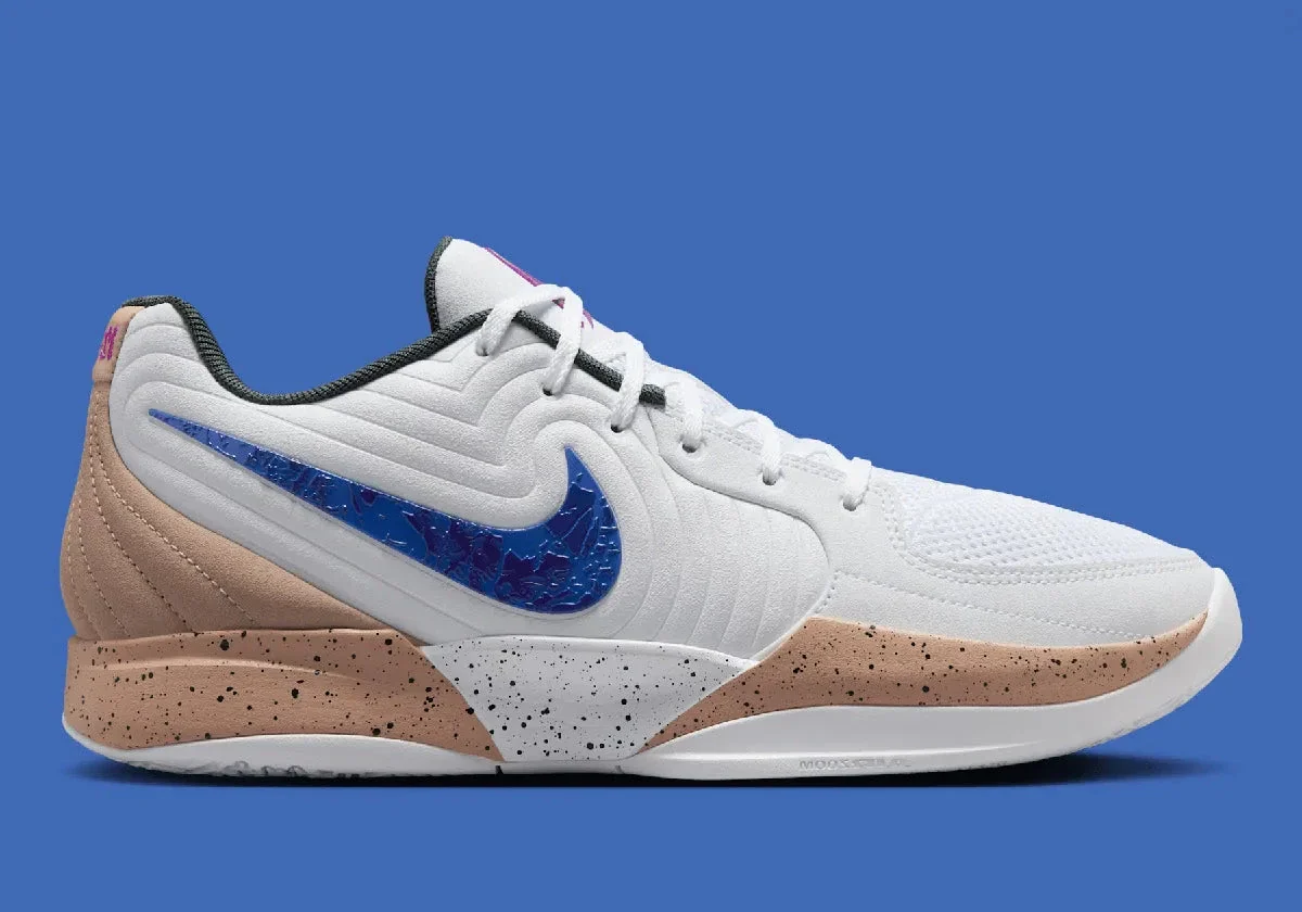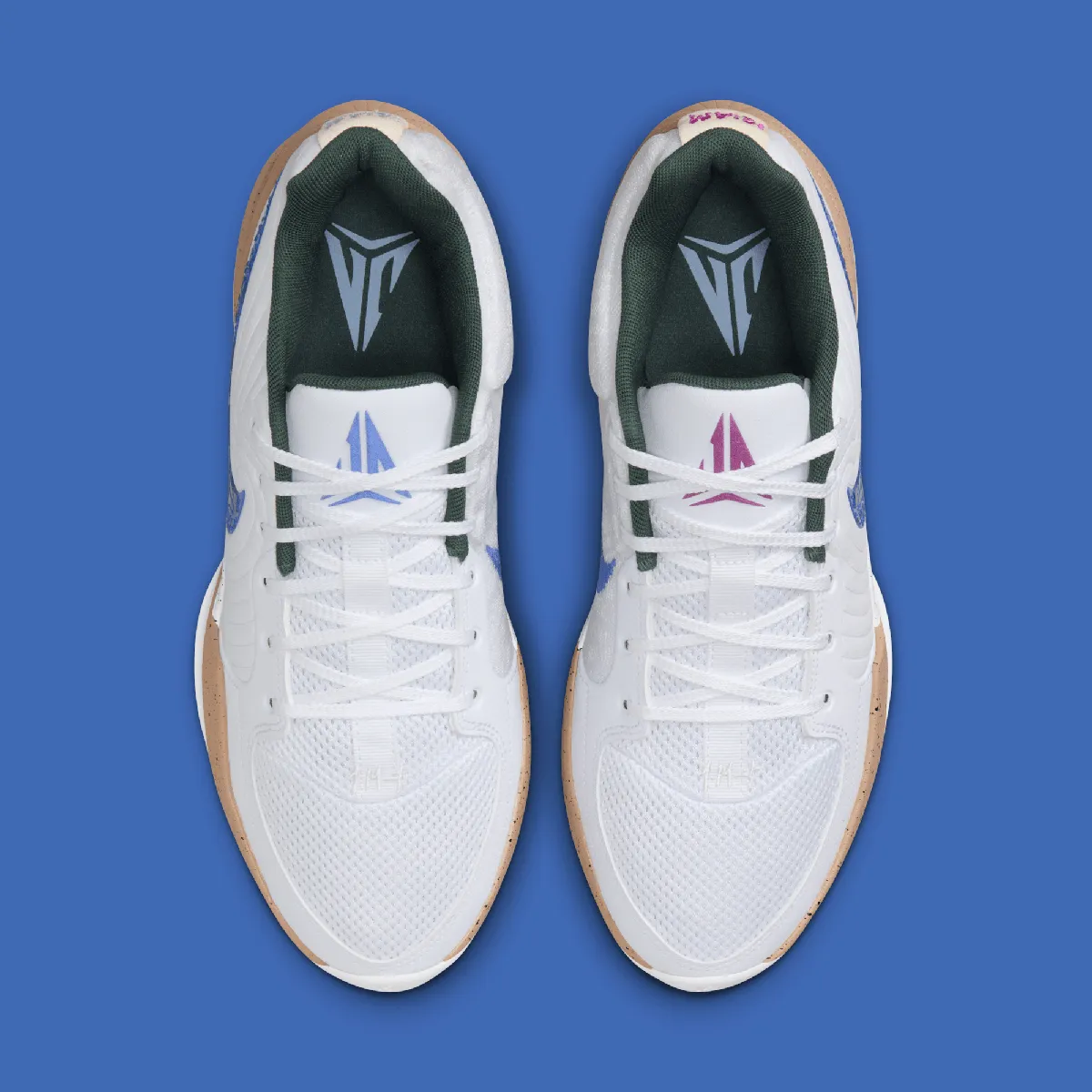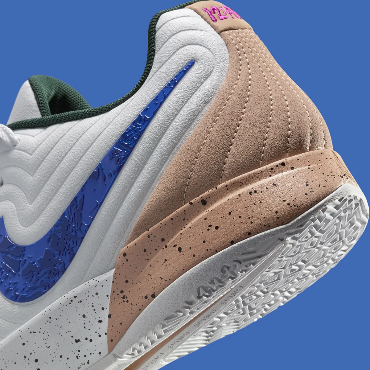 Le surnom « In The Woods » pourrait laisser supposer une palette de marron et de vert, mais la chaussure est en fait disponible en blanc avec des accents de bleu et de beige. Peut-être que les « bois » en question comptent beaucoup de bouleaux ? Quoi qu’il en soit, ces chaussures se nettoient très bien. Comme nous l’avons vu avec la Stargazer Ja 2 inaugurale, le quartier latéral présente une fois de plus un motif radial centré sur le Swoosh. Le logo lui-même est de couleur bleu royal, avec des détails astucieux qui rappellent les cartes topographiques pour s’adapter au thème. Une partie du talon en cuir fauve assure une transition transparente sous le pied, où de la peinture fauve apparaît sur l’avant-pied et le talon de la semelle intermédiaire. Nike ajoute également des détails subtils de peinture noire pour faire bonne mesure.