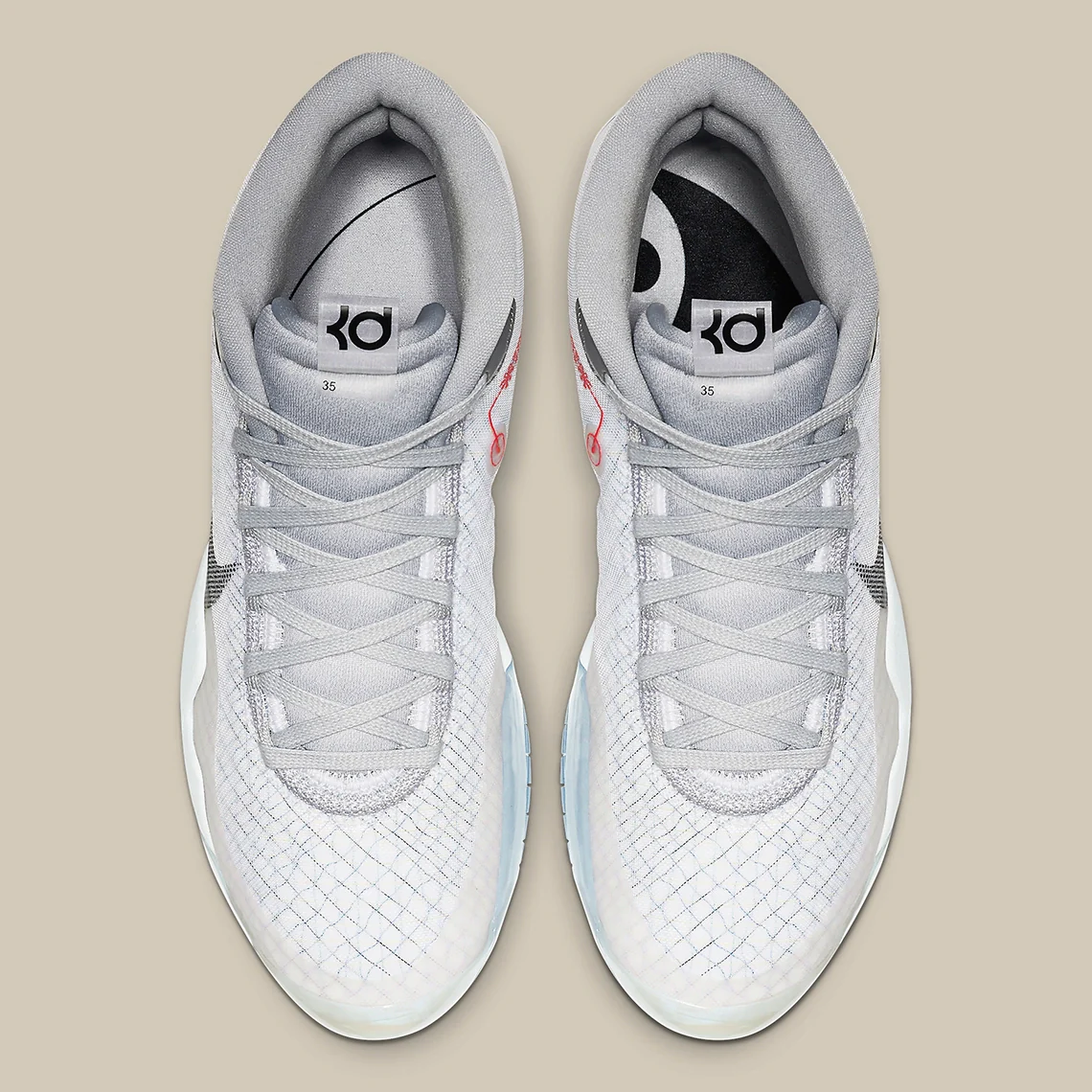 Kevin Durant a peut-être quitté le NorCal ensoleillé et sanguin pour la poussière de Brooklyn (et troqué Steph Curry pour Kyrie Irving) mais sa signature Nike continue comme si de rien n’était, avec la Nike KD 12 NRG qui a récemment fait surface dans un nouveau « Wolf Grey« . L’empeigne est presque entièrement habillée dans des tons gris doux, avec des accents techniques arrivant par le biais d’un Swoosh noir au milieu du pied qui est construit d’un imprimé à pois, Flywire multicolore sous-jacent qui fournit à la fois le style et le soutien, et un texte rouge frappé sur le médio-pied. La languette Flyknit et le collier souple du talon sont tous deux habillés d’un gris légèrement plus foncé pour un contraste tonal, avec l’œillet supérieur offrant une petite touche d’argent métallique. La semelle intermédiaire translucide présente un mélange intéressant de tons, combinant un bleu glacé avec une teinte havane très légère, et une unité Zoom Air rouge est visible directement à travers la semelle extérieure.