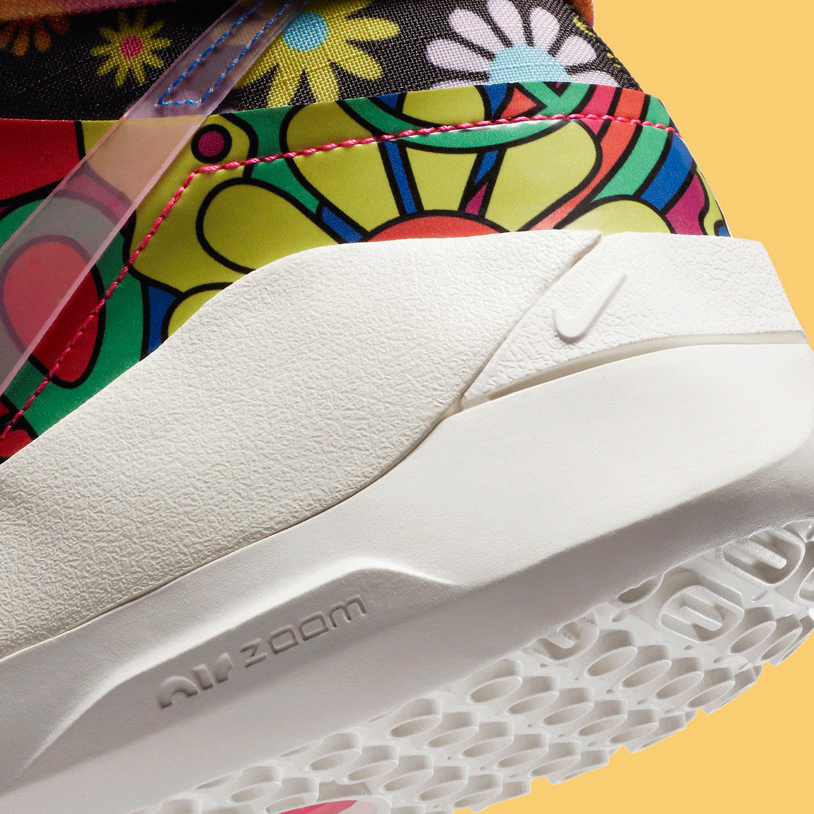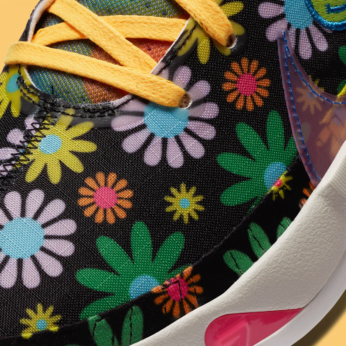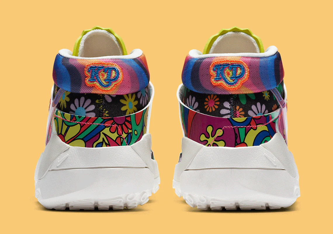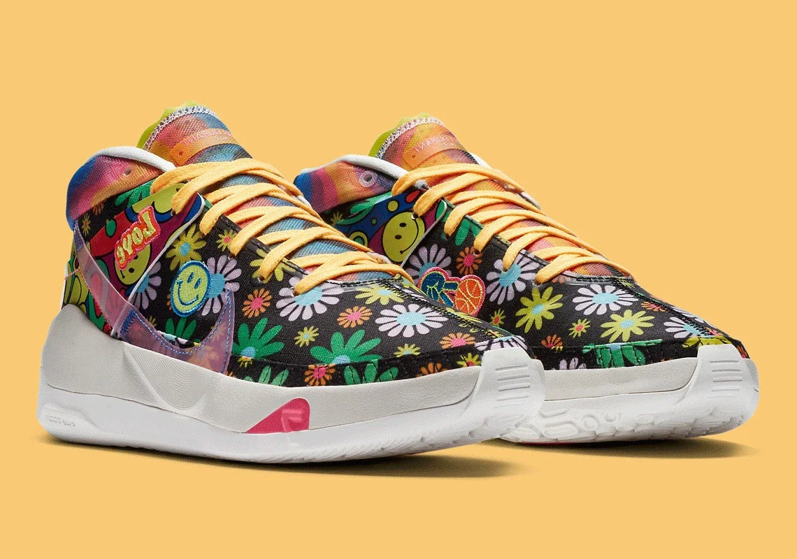 Après avoir dévoilé sa collection » Peace, Love, And Golf « , NIKE, Inc. a (officieusement) partagé d’autres arrangements colorés d’inspiration hippie avant la Journée internationale de la paix en septembre. Le prochain modèle est la Nike KD 13 « Easy Money Sniper ». Bien qu’elle ne soit pas couverte de formes abstraites comme ses homologues de golf, la dernière basket signée par Kevin Durant arbore un ensemble tout aussi accrocheur. Une base noire sert de décor à des graphiques floraux dont la taille et la couleur varient, en particulier sur les rabats du talon qui rappellent la Air Jordan 1. Des patchs « LOVE » et des visages souriants se joignent au mélange le long du profil latéral ; les côtés médians arborent des gestes de paix latéraux et des embellissements de basket-ball. Ailleurs, la languette et le rembourrage du col s’adonnent à une palette plus discrète, mais toujours aussi ludique, cette dernière comportant également un logo « KD » de style rétro. Les Swooshes latéraux et les unités de la semelle ne participent pas à l’esthétique psychédélique, mais leur transparence et leur prédominance de blanc cassé complètent bien le design de la chaussure.