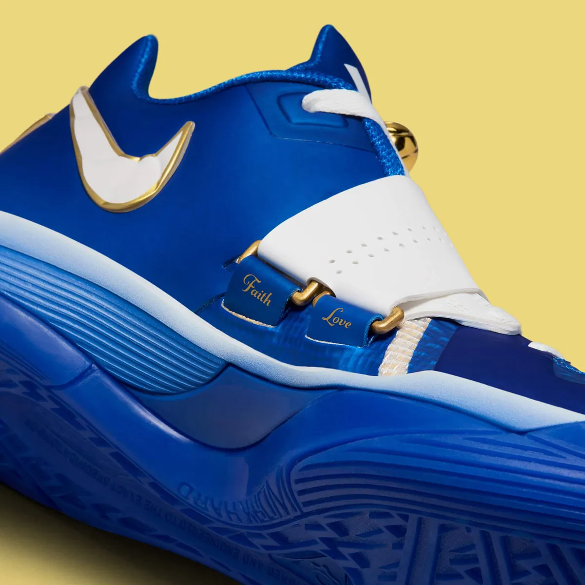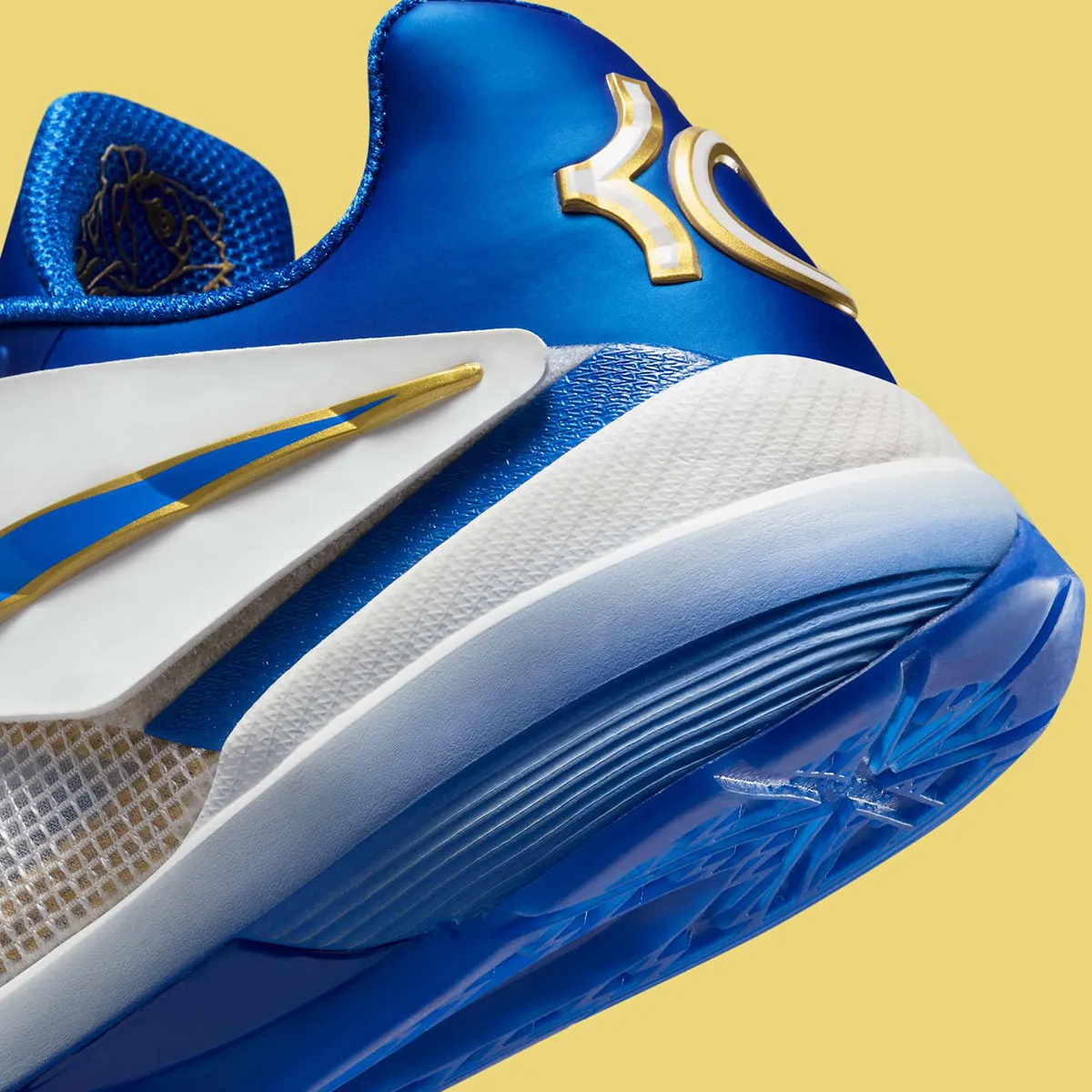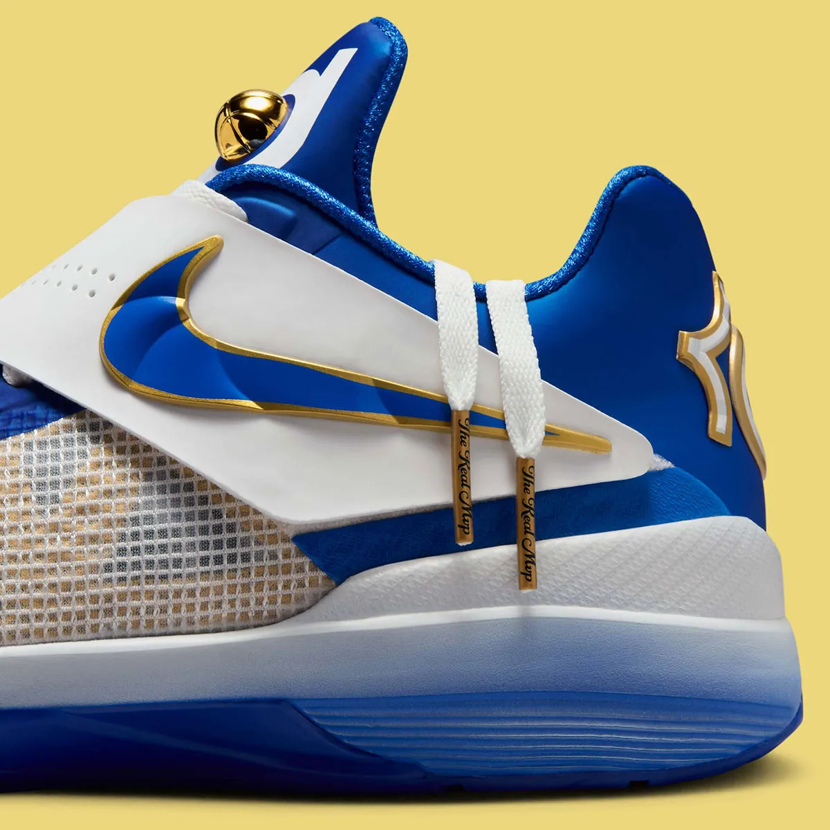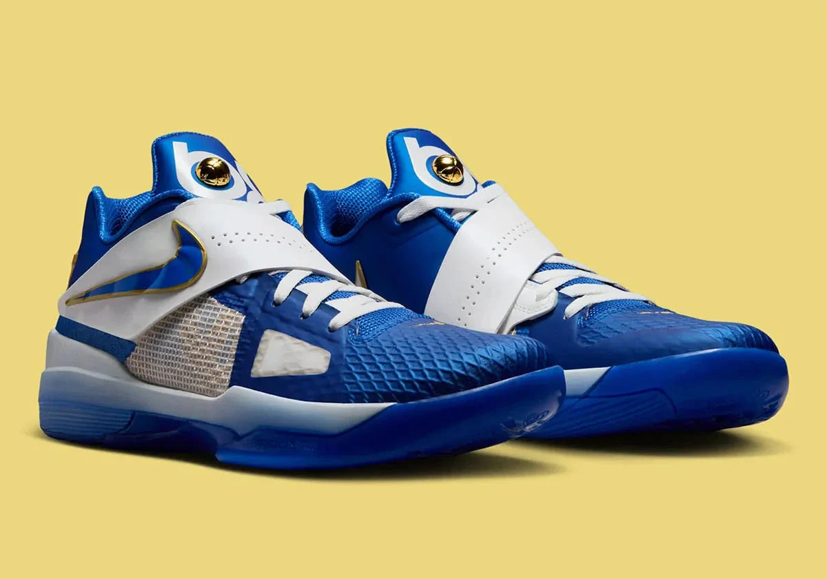 La Nike KD 4 Retro devrait revenir en force en février grâce à ce duo de designs animés inspirés des mots de KD. Cette édition alternative se souvient de la riche nuance de bleu portée par Kevin en peignant la majorité de l’empeigne. Le blanc s’invite sur la lanière médio-pied et les découpes respirantes, tandis que des accents dorés apparaissent pour souligner le Swoosh et le logo KD ainsi que la breloque de basket-ball fixée sur la languette.