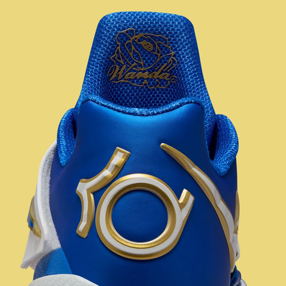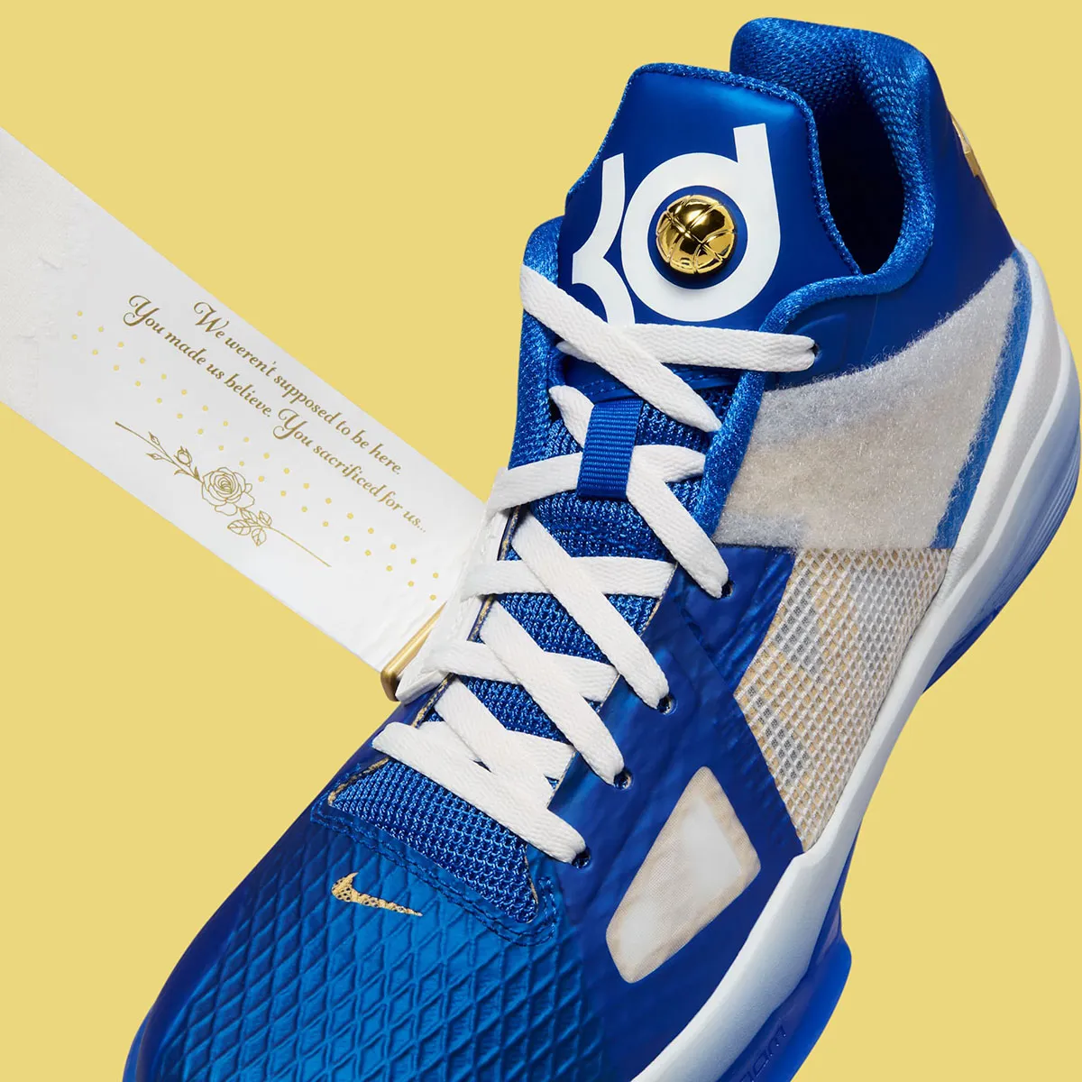 Sur le côté intérieur de la languette se trouve la citation emblématique « We weren’t supposed to be here… » (Nous n’étions pas censés être ici…) que Durant partage en larmes avec les médias alors que ses yeux sont fixés sur sa mère Wanda ; son nom apparaît derrière la languette avec un motif floral. Son nom apparaît derrière la languette avec un motif floral. « You the real MVP », les derniers mots emblématiques de ce discours, sont inscrits sur les semelles intérieures.