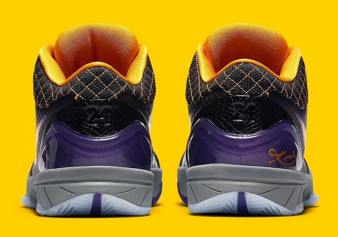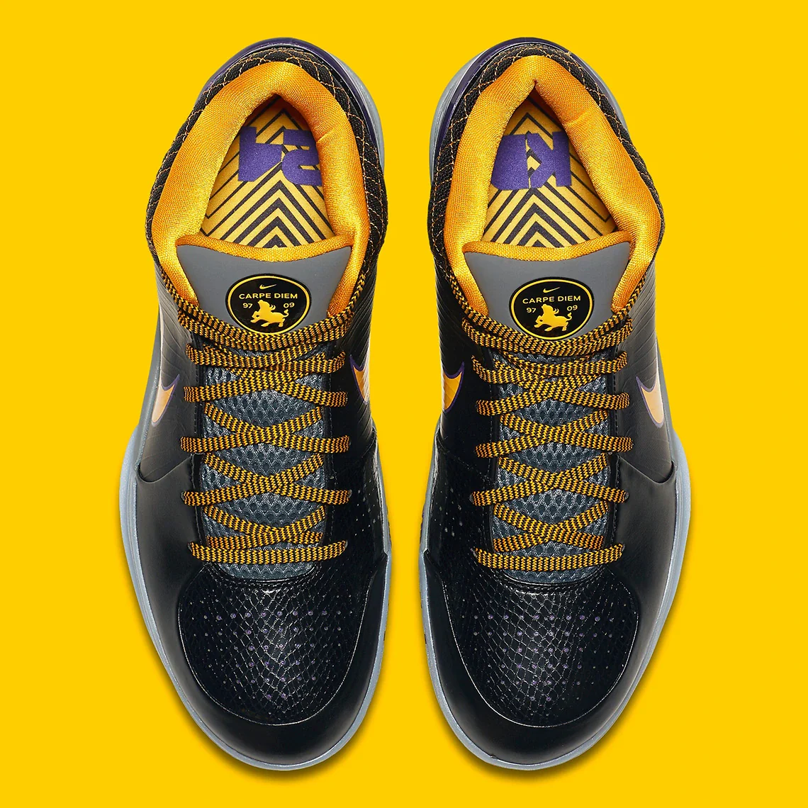 Sa tige en cuir noir premium est rehaussée de détails jaunes et violets, un clin d’œil vibrant aux Los Angeles Lakers, tandis que la doublure intérieure à motif quadrillé gris et noir ajoute une touche signature à cette édition mythique. Le logo Kobe sur la languette, orné du mantra “Carpe Diem”, rappelle l’esprit conquérant du Mamba.