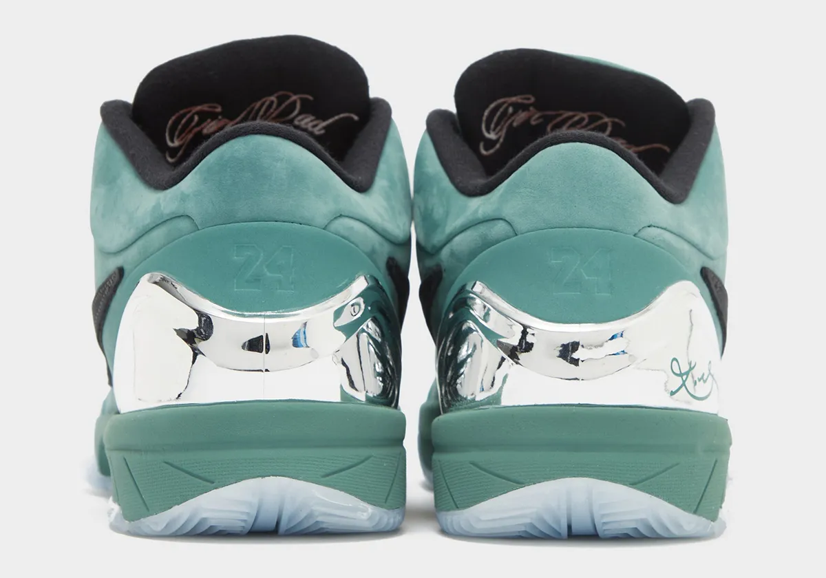 Elle présente aussi un lacage noir, un Swoosh noir contrasté, et la mention “Girl Dad” brodée au niveau de la languette intérieure — inscription forte et personnelle dédiée à Kobe et à ses filles.
