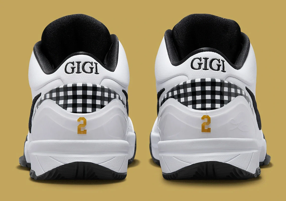 Sorti à temps pour son anniversaire, le colorway incorpore plusieurs clins d’œil à la Mambacita elle-même : en plus d’afficher son surnom sur la semelle intérieure et l’emballage, la paire écrit « Gigi » sur la colonne vertébrale de la chaussure ainsi que sur ses agrafes. De plus, le numéro de maillot de Gigi Bryant est imprimé sur le talon dans une finition dorée, assortie au logo de Kobe sur la languette. Le reste de la chaussure est principalement composé de couleurs neutres, avec des Swooshes, des lacets et des plaids noirs qui accentuent une base blanche prédominante.