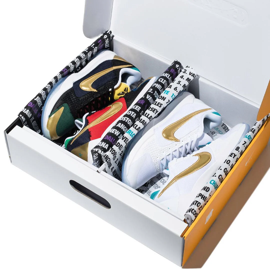 La première paire, inspirée des Hornets, présente une tige en cuir verni bleu turquoise et violet, clin d’œil aux couleurs de l’équipe de Charlotte. La seconde arbore une composition multicolore audacieuse, mélangeant les teintes des équipes passées à côté du Mamba — une œuvre symbolique de la revanche et de la détermination.