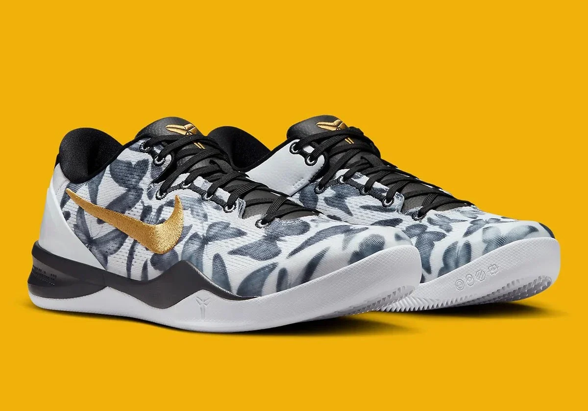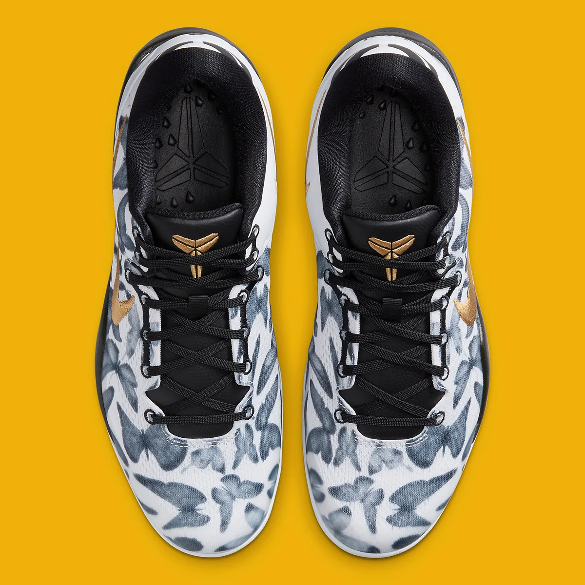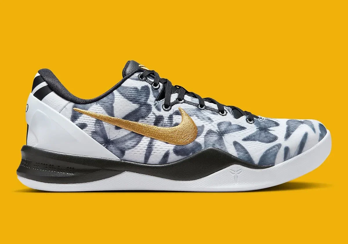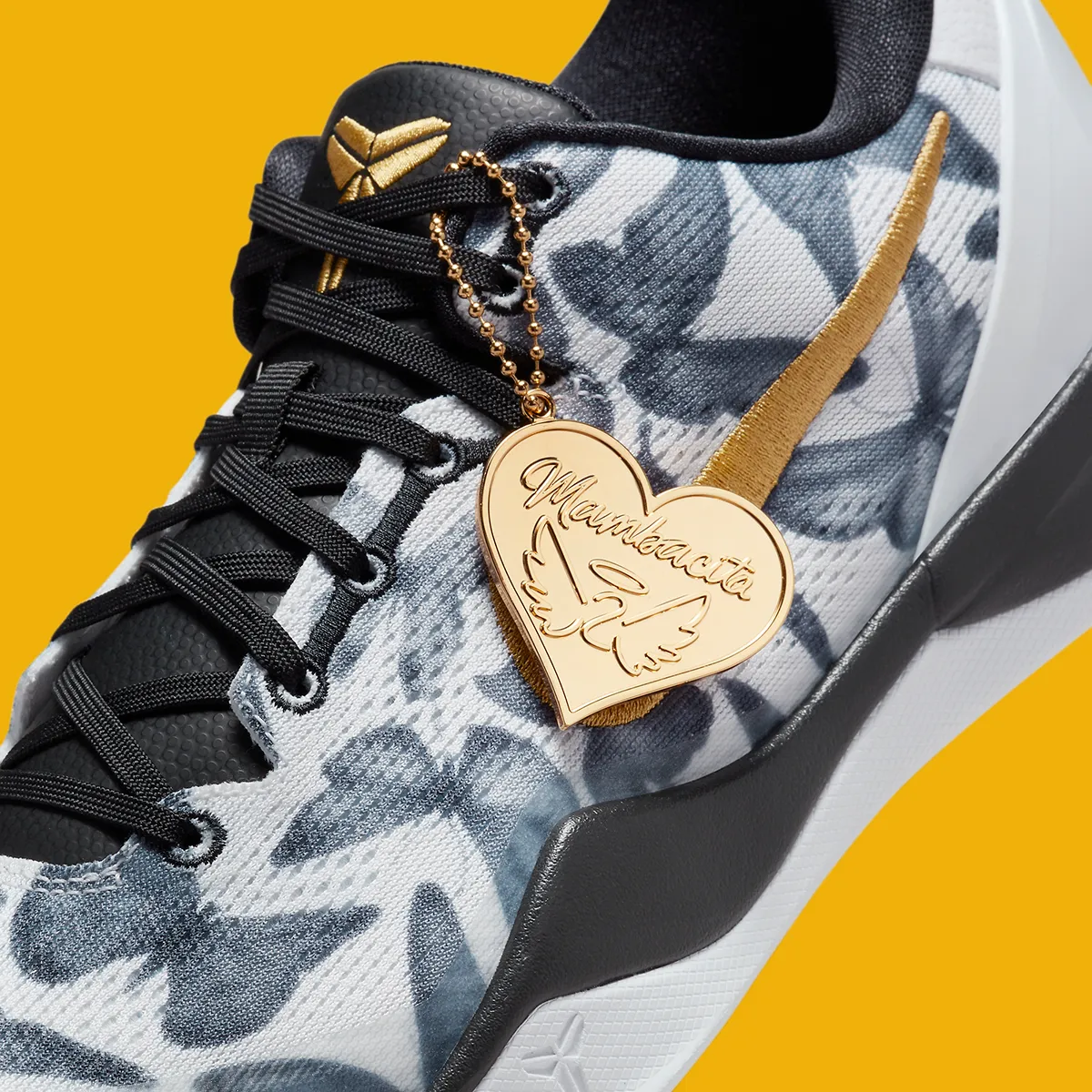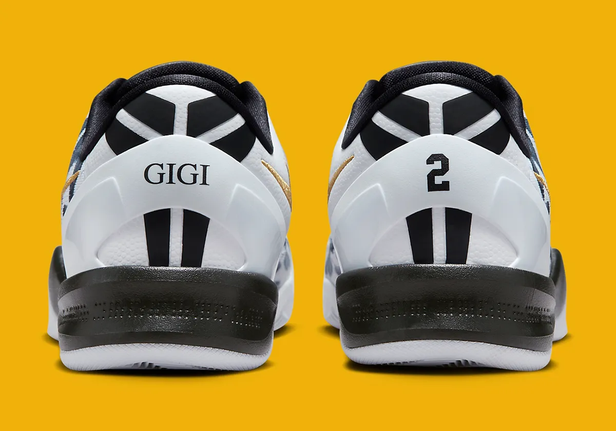 Poursuivant la tradition de la « Mambacita », dans laquelle Nike et Vanessa Bryant concoctent un élégant coloris blanc, or et noir d’une chaussure Kobe, cette Kobe 8 « Mambacita » présente un élégant motif de papillons sur la tige en mesh technique, tandis que des accents dorés apparaissent sur la gaine Kobe et les emblèmes Swoosh brodés sur les côtés latéral et médial. Sur le talon, on peut lire « Gigi » ainsi que son numéro de maillot 2, tandis qu’une étiquette de suspension en or dur est attachée avec le logo des ailes de Mambacita.