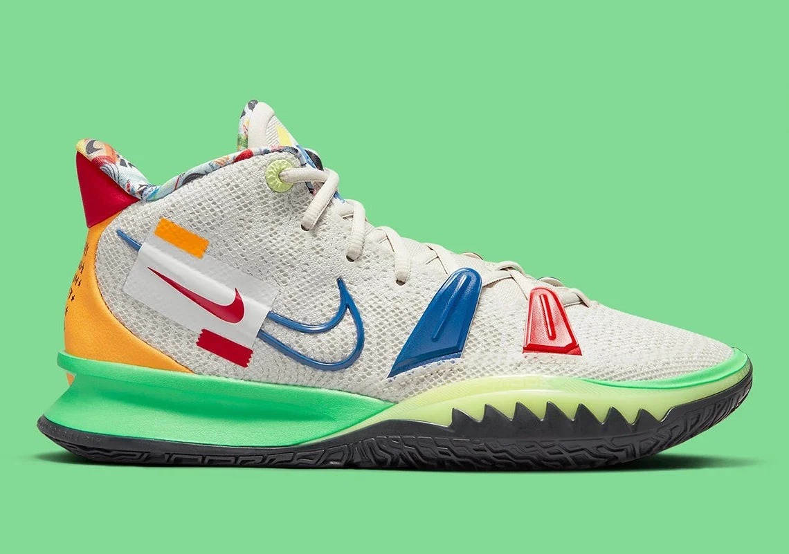 Plus économique que la Nike Kyrie 7, la prochaine paire est dotée de spécifications techniques prêtes pour le jeu. Un maillage léger mais durable sur la tige profilée se livre à des nuances de noir, tandis que les swooshes, les languettes et d’autres composants complémentaires du profil s’écartent dans une teinte blanc cassé. Ailleurs, l’option Nike Basketball présente un bleu vif au niveau des œillets supérieurs et du logo sur la langue, tandis que les lacets sont revêtus d’un violet clair contrastant. Sous le pied, les semelles agressives divisent davantage la palette de couleurs titulaire « Black / Bone», les semelles extérieures optant principalement pour la plus claire des deux couleurs.