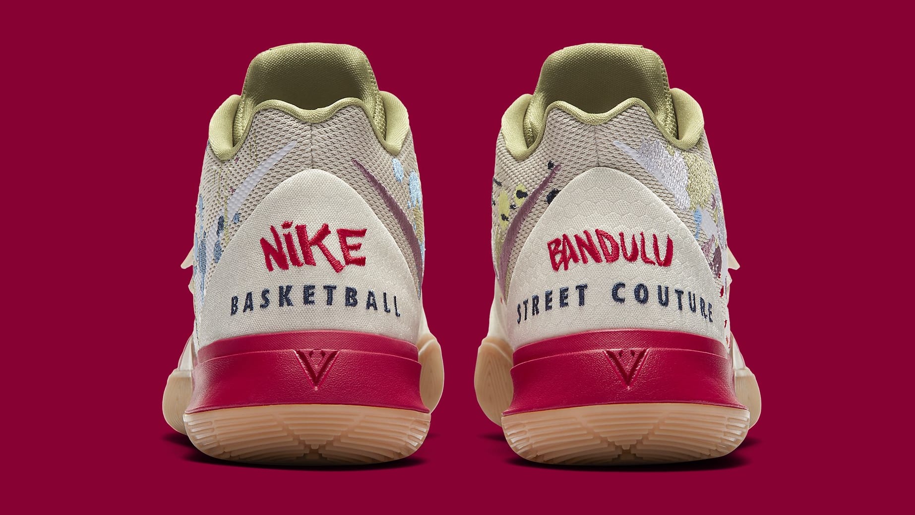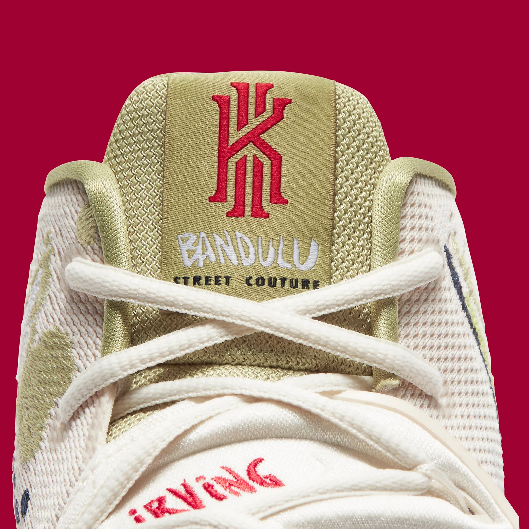 D’autres éclaboussures recouvrent l’orteil et le petit coup de Swoosh blanc brodé. La broderie gribouillée à la main occupe une place prépondérante dans le dessin, car « Kyrie Irving » est écrit en rouge sur les couvre-mouches Venus, « Nike Basketball » sur la chaussure gauche et « Bandulu Street Culture » sur la chaussure droite. Les touches finales comprennent une langue olive légère avec une semelle intermédiaire en voile et une semelle extérieure rouge vif. La Nike Kyrie 5 « Bandulu » est sortie le 27 juillet 2019.