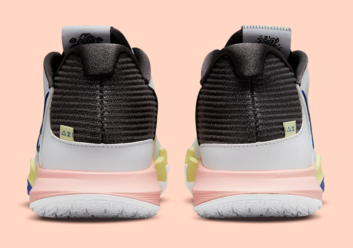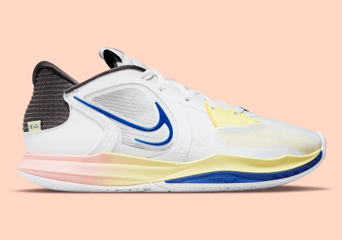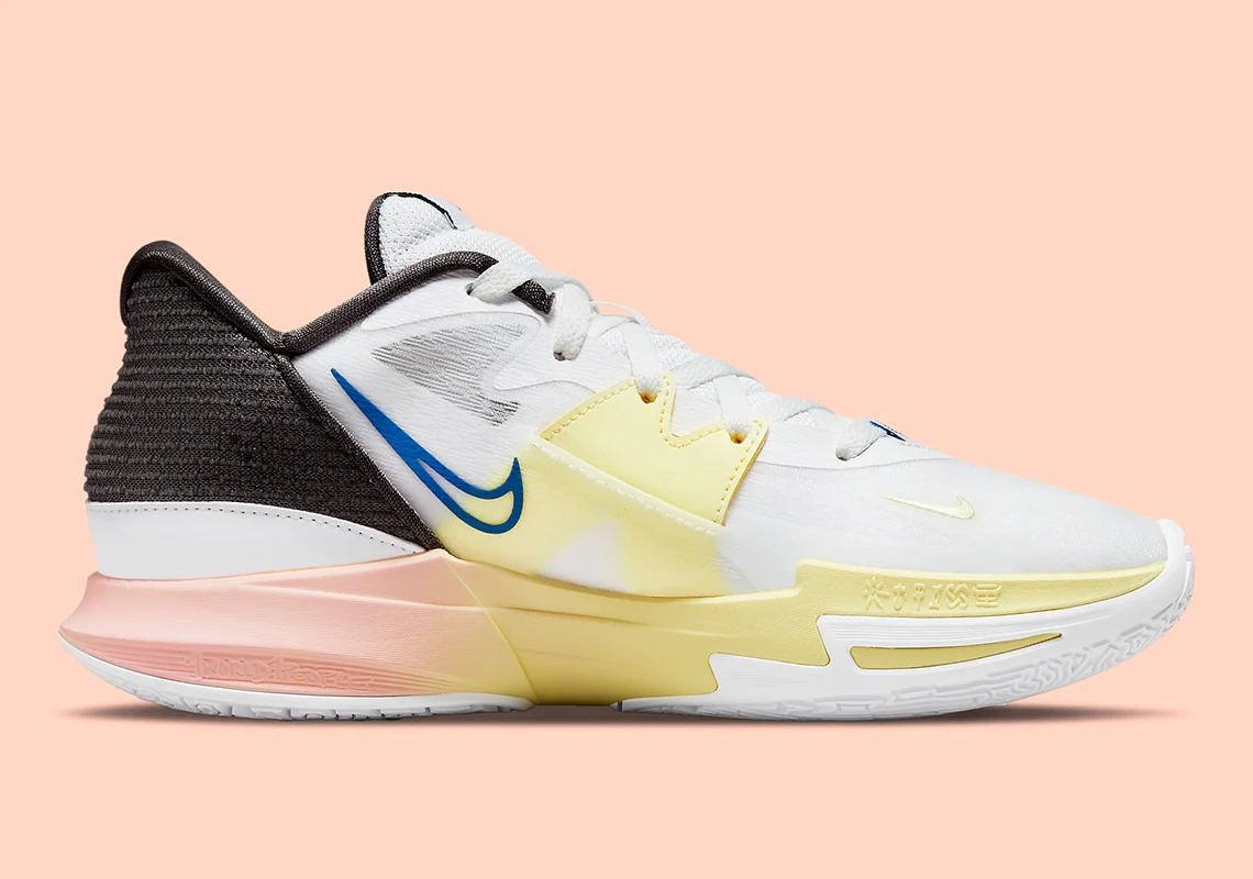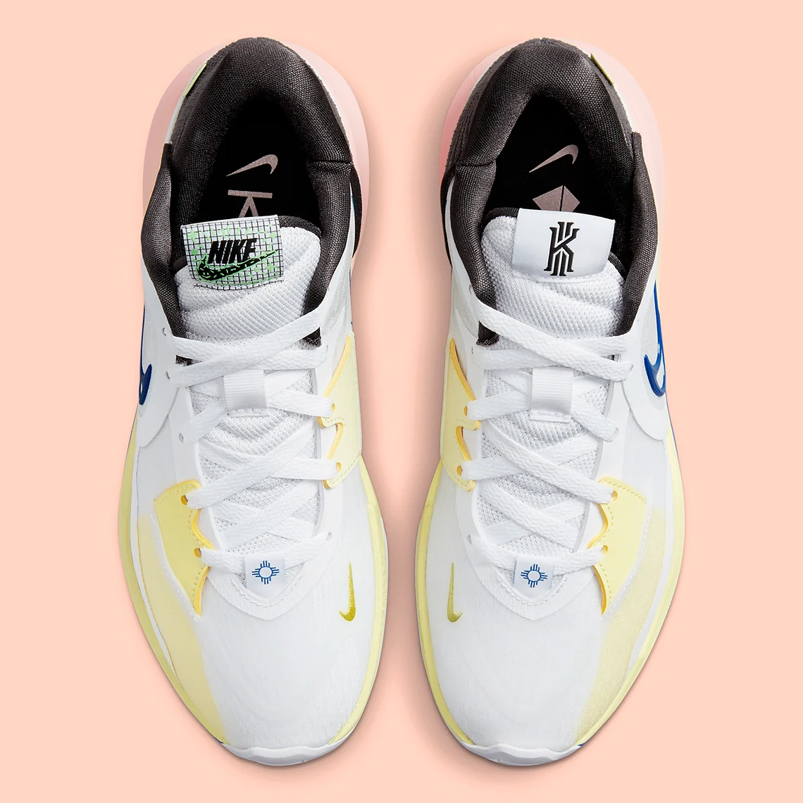 Ce premier look de la Nike Kyrie 5 Low White Game Royal révèle une base Duke blanc/bleu, avec un dégradé de jaune clair et de melons prêt pour l’été pour une teinte rafraîchissante prête pour l’été. Étant donné le penchant de Kyrie pour l’obscur, il y a probablement une signification plus profonde derrière ce coloris ainsi que les logos et symboles qui existent autour de la chaussure.