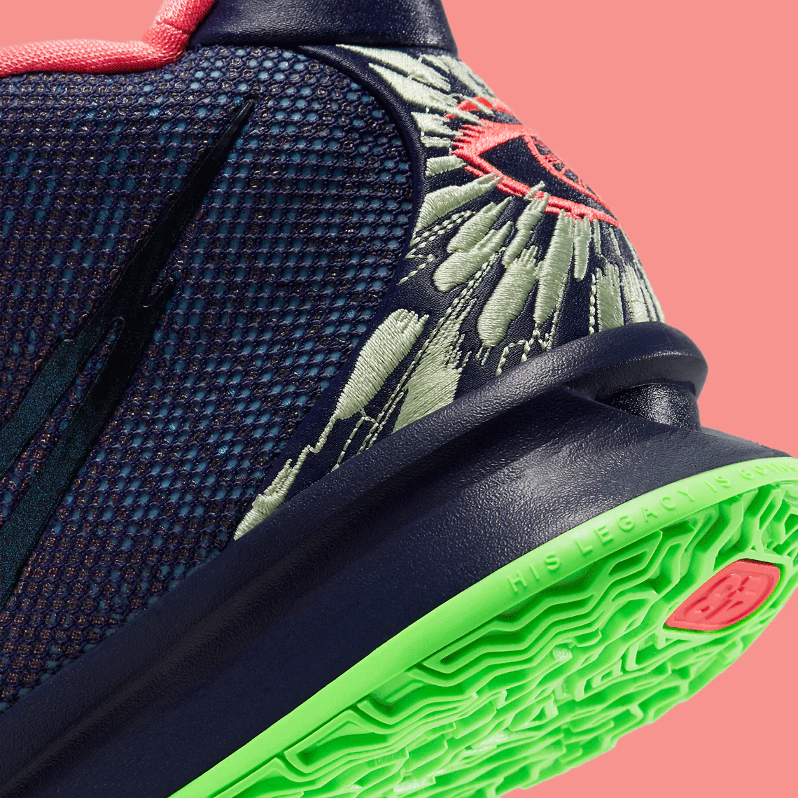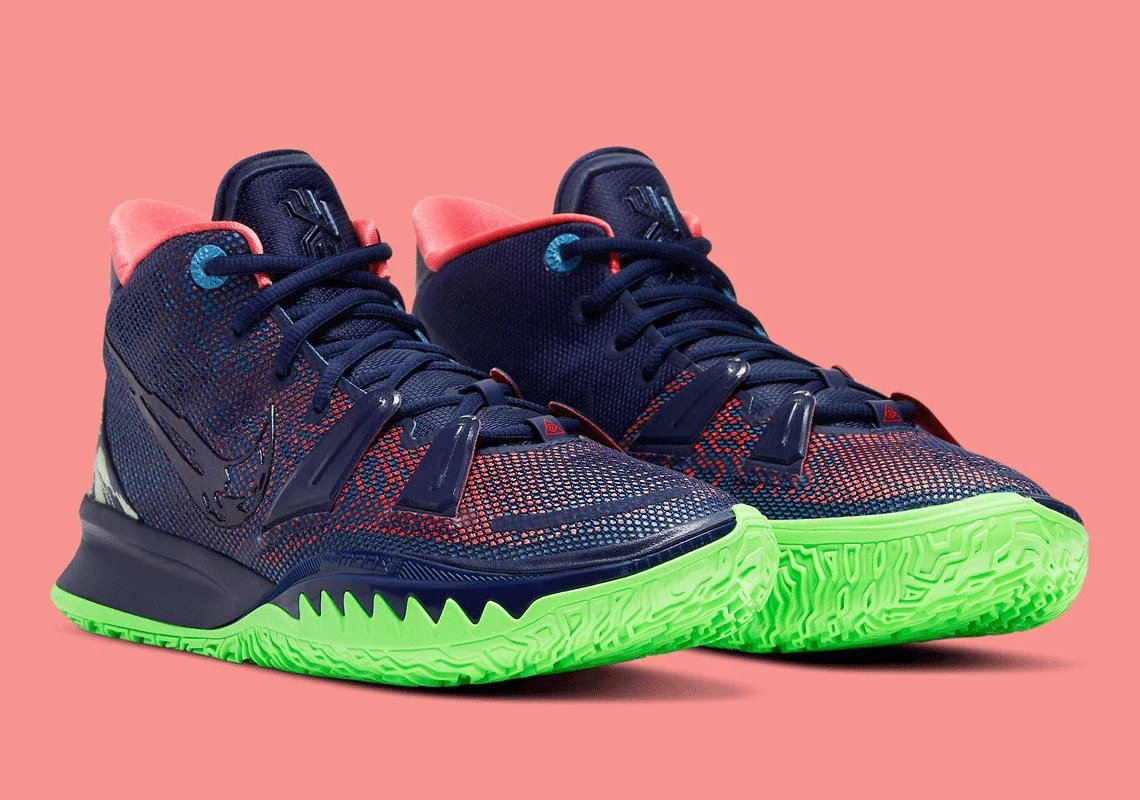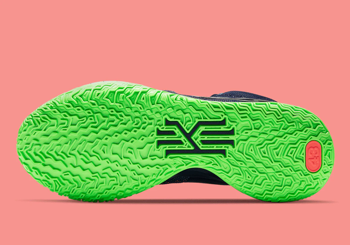 Bien qu’elle soit toujours prévue pour être lancée dans le cadre de la collection Nike Rayguns, la paire nouvellement apparue renonce à un schéma de couleur prédominant « Noir » en faveur d’une palette composée de nuances de marine, de vert vibrant et de rose. Les swooshes latéraux s’adonnent à une esthétique fragmentée, tandis que les dos arborent un ensemble d’yeux brodés accrocheurs. Sous le pied, la dernière basket d’Irving renforce son design audacieux, puisque la bande de roulement multidirectionnelle est revêtue d’une nuance de vert apparemment fluorescente.