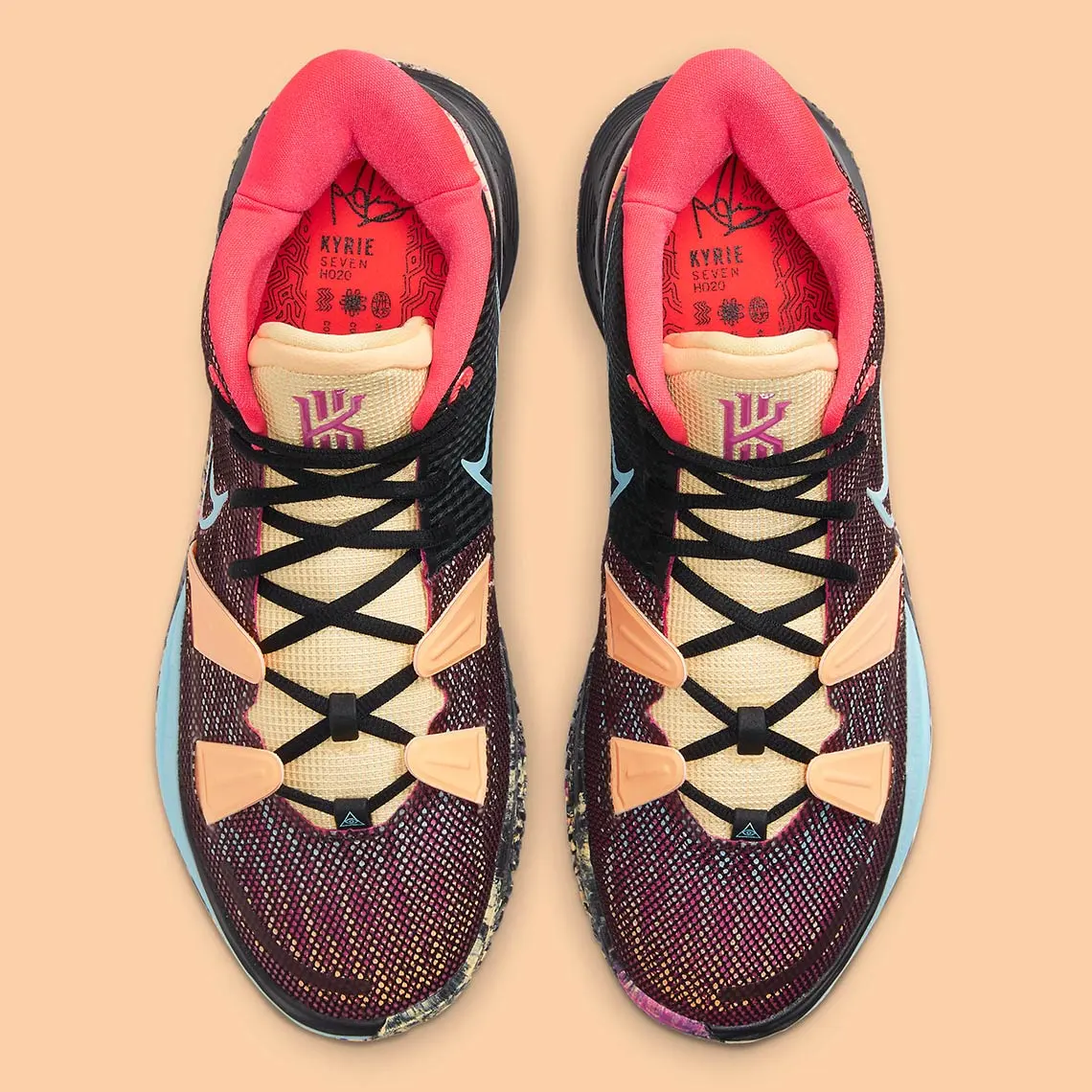 Contrairement à ce qui précède, le côté latéral est enveloppé sur le dessus avec un filet noir, les couches en dessous étant principalement enveloppées et obscurcies. Mais, à travers quelques-unes des ouvertures, des touches de rose clair à foncé ainsi que quelques taches de bleu arrière leur tête, complétant non seulement la langue et les œillets avant, mais aussi des parties de l’outillage et l’intégralité du Swoosh décrit. Ailleurs, des tons plus vifs voient la doublure, ajoutant des rouges vibrants au-dessus d’un contrefort de talon habillé d’orange pâle, une teinte inspirée des tons du désert qui apparaissent tout au long des collaborations NIKE. Ce dernier est ensuite accentué par des références aux partitions et aux gribouillis rose vif, tandis que la semelle ci-dessous correspond à une telle énergie avec un marbrage complexe.