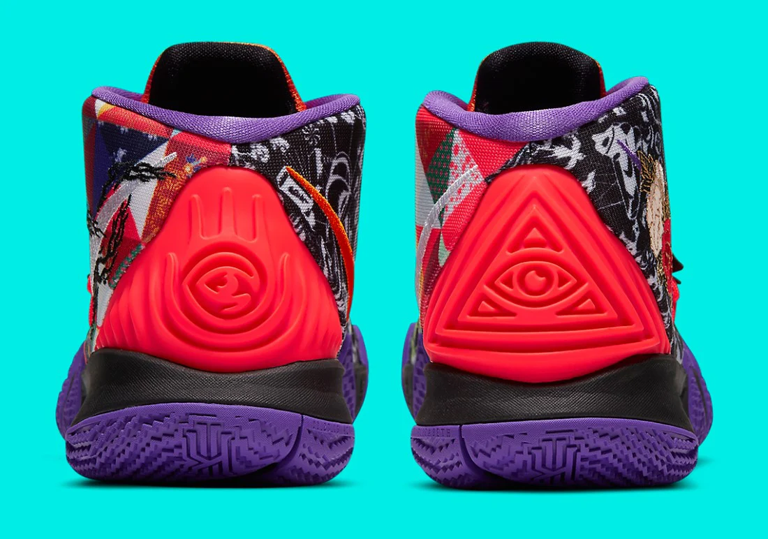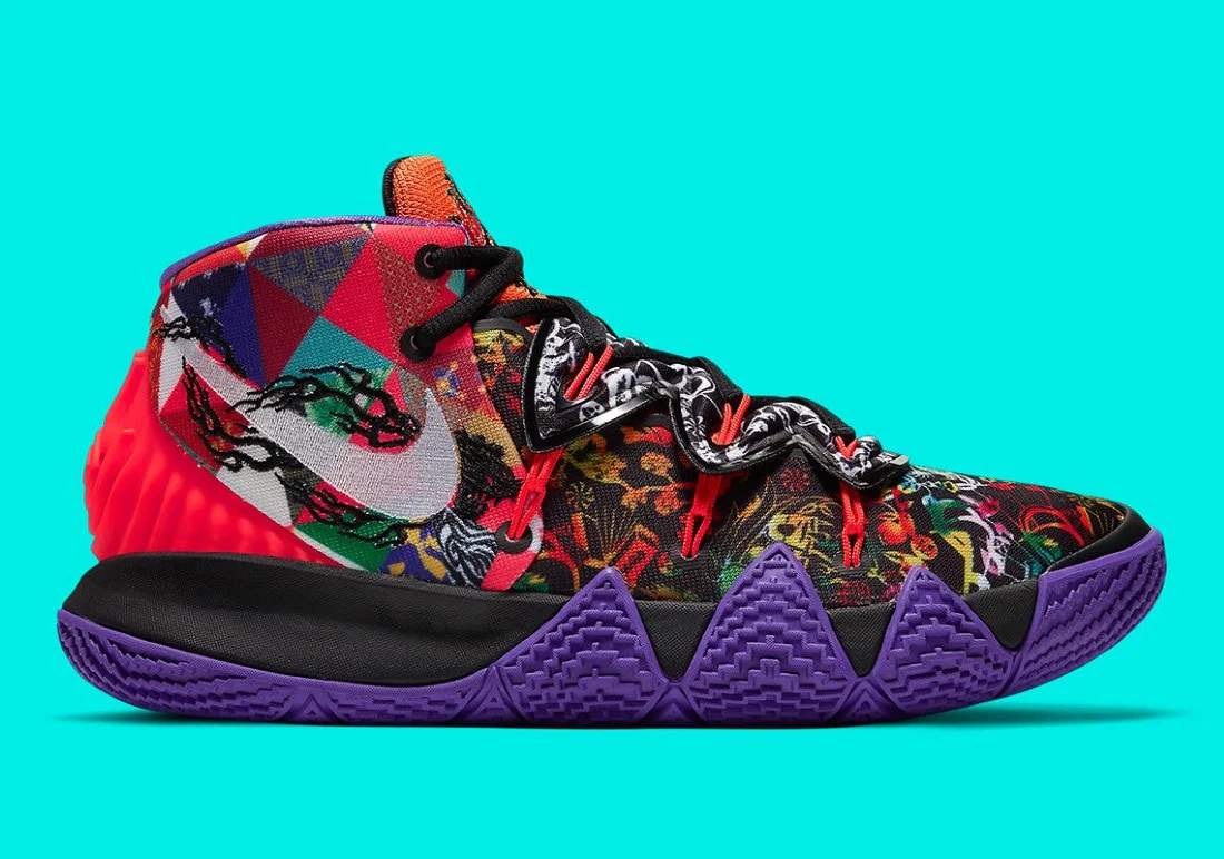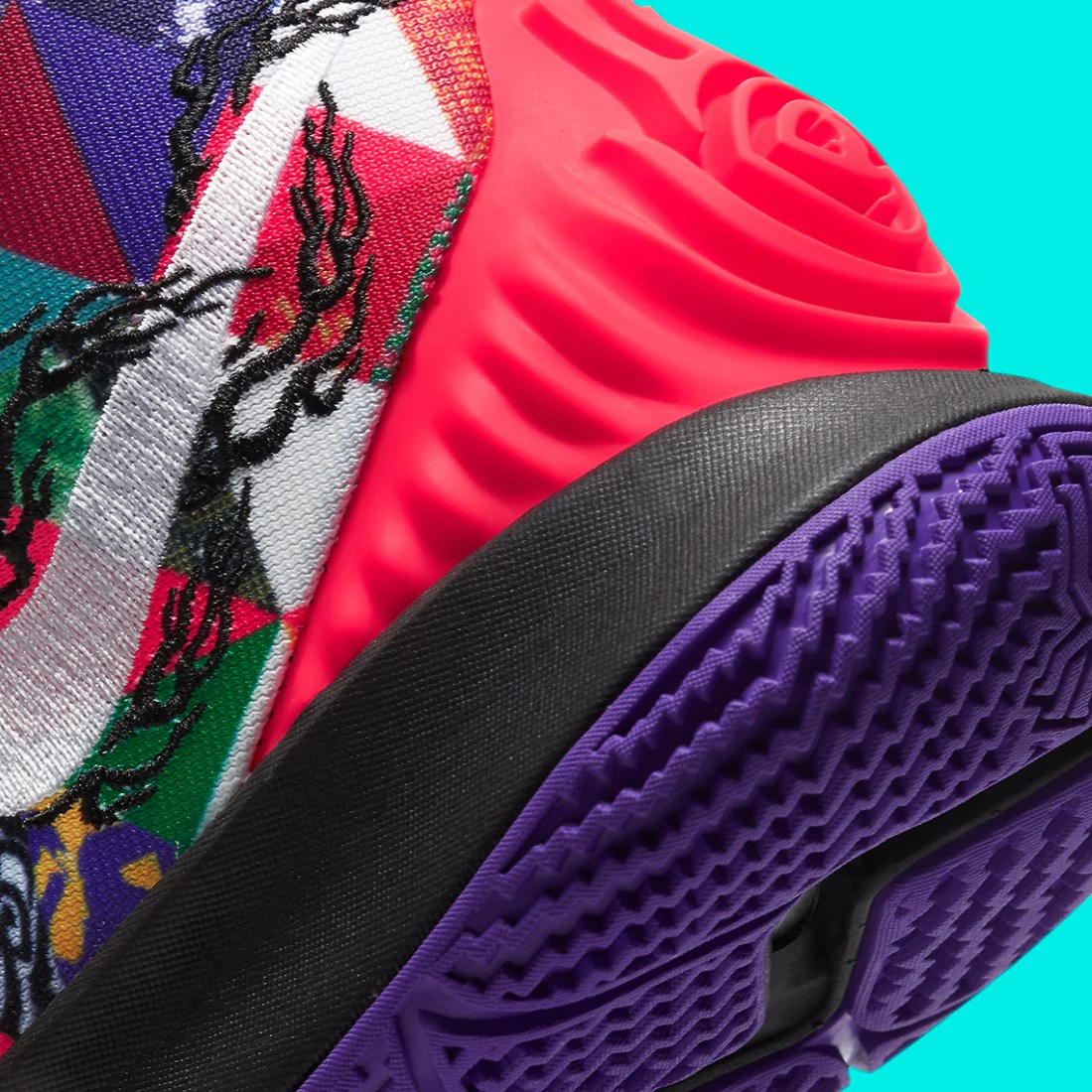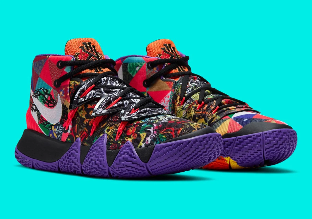 Ce nouveau modèle, appelé Kyrie S2 Hybrid “Chinese New Year”, est bourré de détails complexes, faisant honneur non pas à l’animal star de la nouvelle année qui vient, le buffle, mais aux différents aspects de la culture millénaire chinoise. Ainsi, les panneaux situés à l’arrière-pied sont décorés d’un motif patchwork multicolore faisant un clin-d’œil à l’art de papiers d’origami, agrémenté d’un dragon brodé qui enlace un Swoosh blanc. La partie avant, elle, n’est pas en reste puisqu’elle est couverte d’un imprimé associant les fleurs, les pétards et autres éléments qui font référence aux festivités du nouvel an lunaire. Ce graphisme est traité différemment selon le côté de la chaussure : en couleurs sur le côté intérieur et en noir et blanc sur celui extérieur pour le pied droit. Le schéma est cependant inversé pour le pied gauche. La languette, truffée du logo Kyrie, ainsi que le talon sont recouverts d’un rouge vif tandis que le col rembourré, la semelle intérieure agrémentée de la signature du joueur des Nets de Brooklyn et la semelle intermédiaire prennent une teinte violet très prononcée qui contrastent fortement avec la couleur noire prédominante de la chaussure.