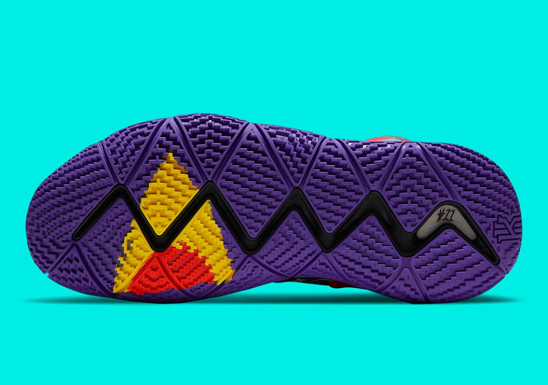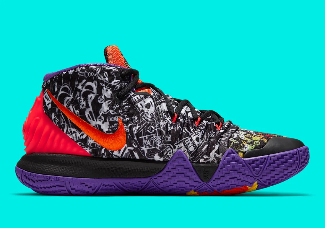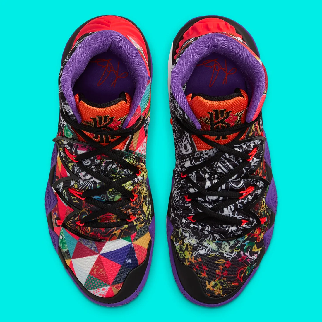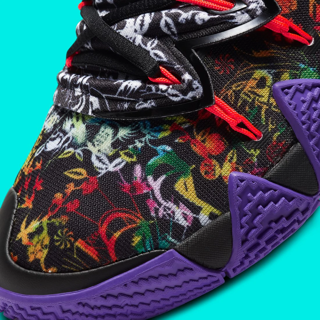 Ce nouveau modèle, appelé Kyrie S2 Hybrid “Chinese New Year”, est bourré de détails complexes, faisant honneur non pas à l’animal star de la nouvelle année qui vient, le buffle, mais aux différents aspects de la culture millénaire chinoise. Ainsi, les panneaux situés à l’arrière-pied sont décorés d’un motif patchwork multicolore faisant un clin-d’œil à l’art de papiers d’origami, agrémenté d’un dragon brodé qui enlace un Swoosh blanc. La partie avant, elle, n’est pas en reste puisqu’elle est couverte d’un imprimé associant les fleurs, les pétards et autres éléments qui font référence aux festivités du nouvel an lunaire. Ce graphisme est traité différemment selon le côté de la chaussure : en couleurs sur le côté intérieur et en noir et blanc sur celui extérieur pour le pied droit. Le schéma est cependant inversé pour le pied gauche. La languette, truffée du logo Kyrie, ainsi que le talon sont recouverts d’un rouge vif tandis que le col rembourré, la semelle intérieure agrémentée de la signature du joueur des Nets de Brooklyn et la semelle intermédiaire prennent une teinte violet très prononcée qui contrastent fortement avec la couleur noire prédominante de la chaussure.