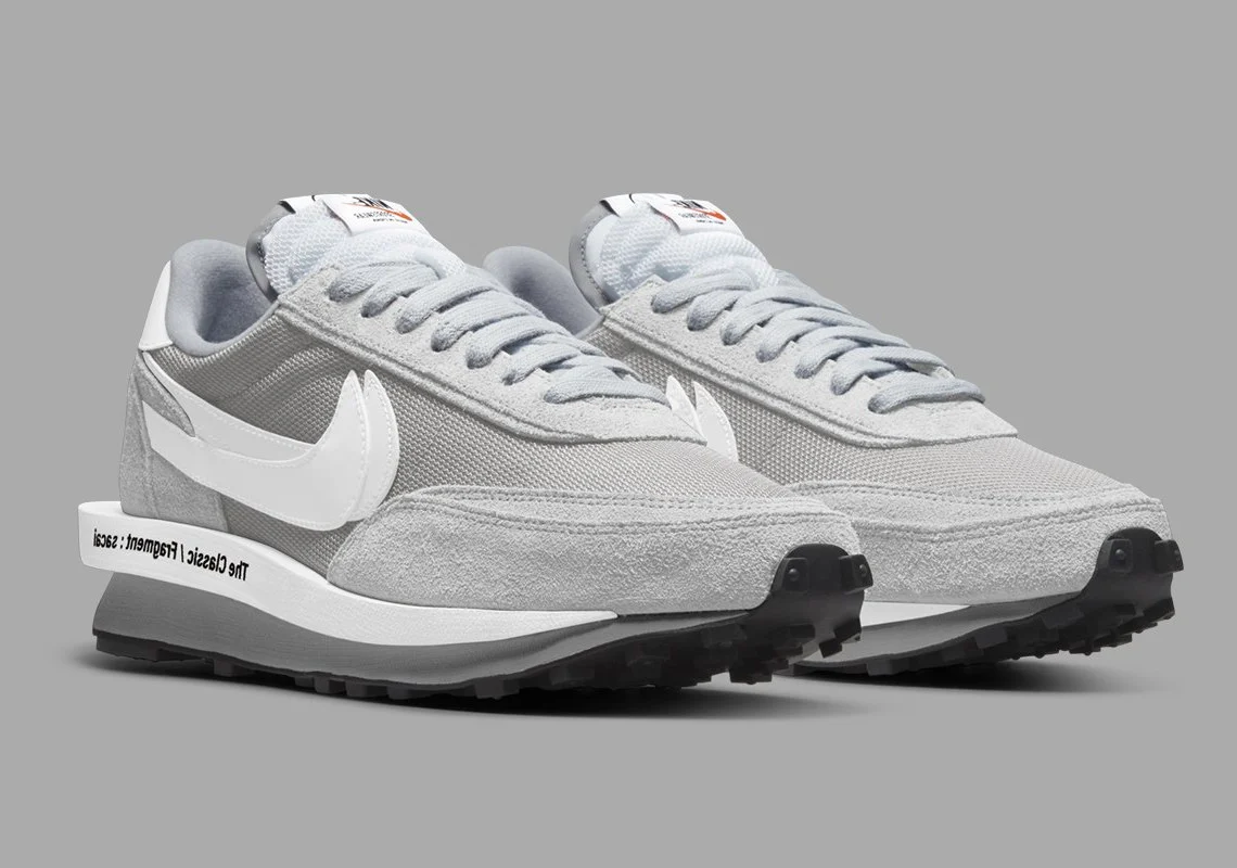 Le coloris Grey associe une tige en mesh gris clair avec des renforts en daim ton sur ton et un double Swoosh en cuir blanc contrastant. On retrouve les détails signature de sacai : double Swoosh, double languette, double lacets et semelle intermédiaire empilée, donnant à la paire une esthétique avant-gardiste.