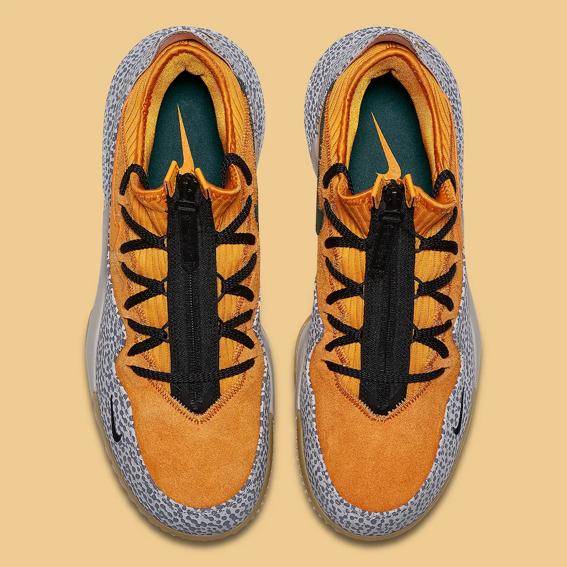 Le garde-boue est orné d’une impression safari, assortie à la superposition du talon. Sous le pied, la semelle intermédiaire abrite des unités Zoom Air visibles pour l’amortissement, laissant place à une semelle extérieure en caoutchouc gomme pour la traction.