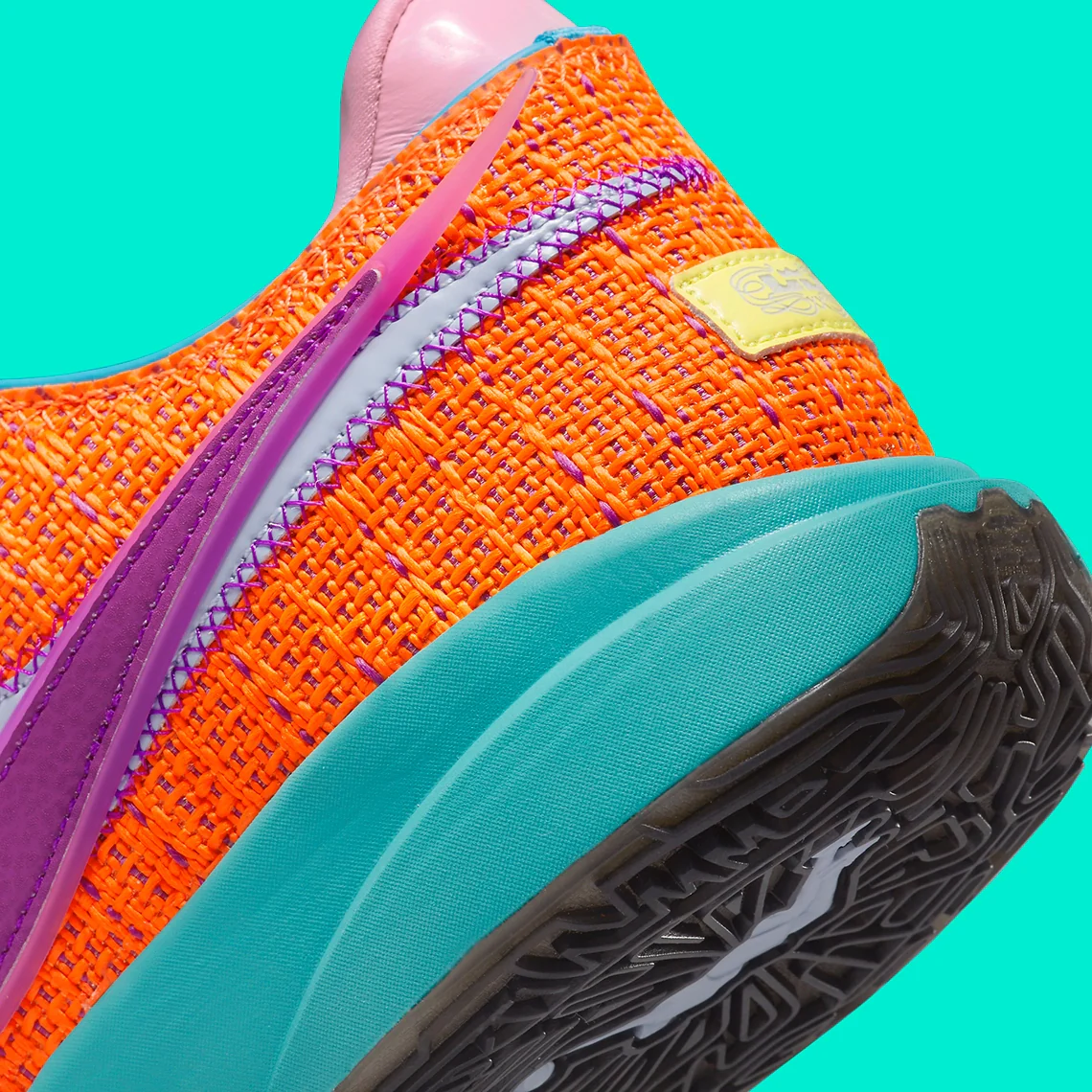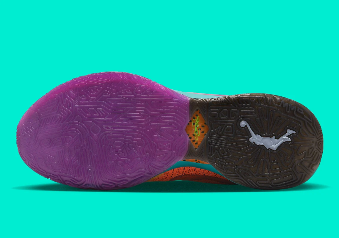 Si l’on excepte la finition lumineuse et réfléchissante de la languette noire de jais, la teinte rarement monochrome est immédiatement noyée dans un quartier brillant « Green Strike » et une garniture turquoise accentuée. Nous avons eu un premier aperçu de la paire en décembre, le colorway animé présente un rose pastel pour ancrer la doublure de la chaussette avant que l’injection de personnalité de l’empeigne ne se termine par des languettes de talon jaunes et bleues et des accents argentés métalliques ornant les dubras et les œillets de l’empeigne. Sous le pied, cependant, la disposition en deux parties du talon convient à la semelle semi-translucide violette et noire, tandis qu’un « Hot Punch » et un turquoise vif s’associent à la semelle intermédiaire bicolore en guise de conclusion.
