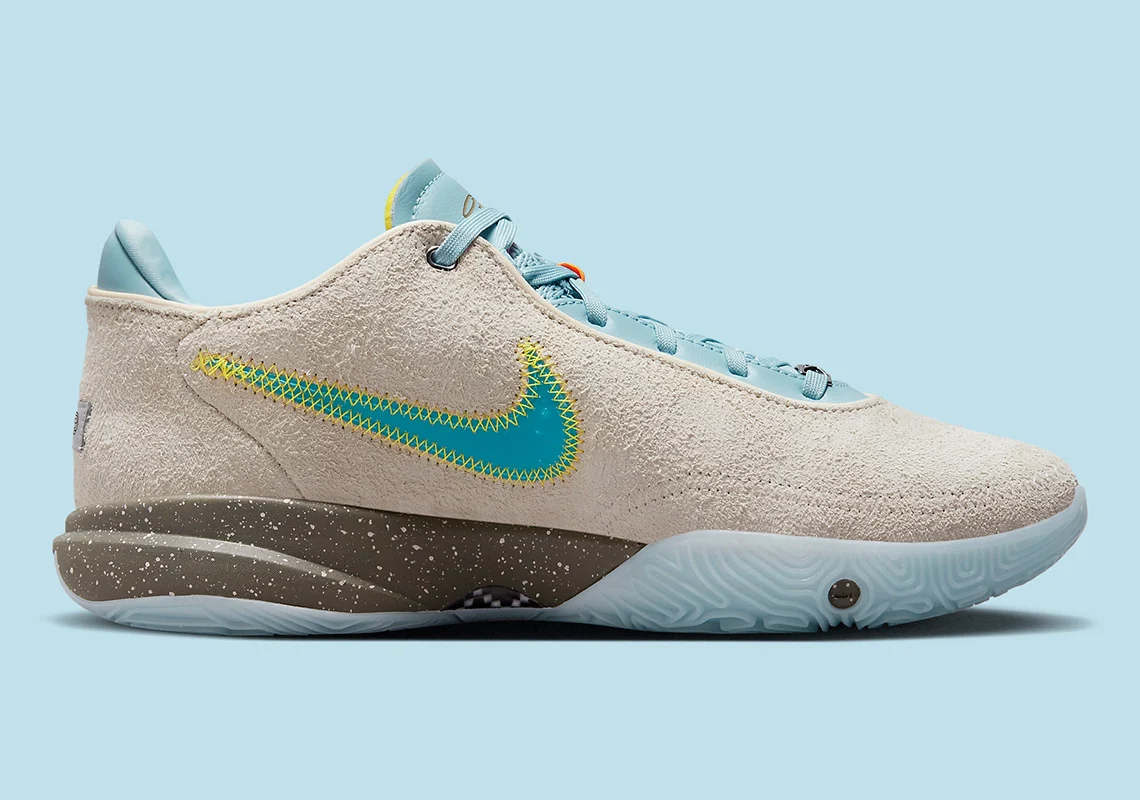 Un daim de haute qualité recouvre la majeure partie de l’empeigne, arborant un coloris « Guava Ice » qui ouvre la voie à des contrastes plus animés. Le marquage et la construction de la languette et de son pourtour introduisent les couleurs vibrantes « Teal Nebula » et « Emerald Rise« , qui évoquent des images de l’océan. Sous le pied, une semelle intermédiaire grise mouchetée est complétée par une semelle extérieure phosphorescente qui complète la Nike LeBron by UNKNWN conceptuelle.