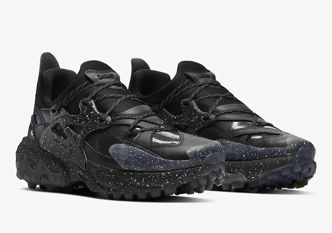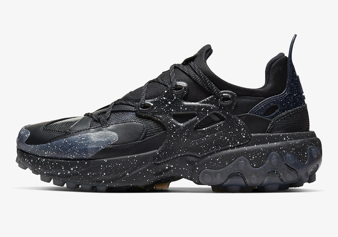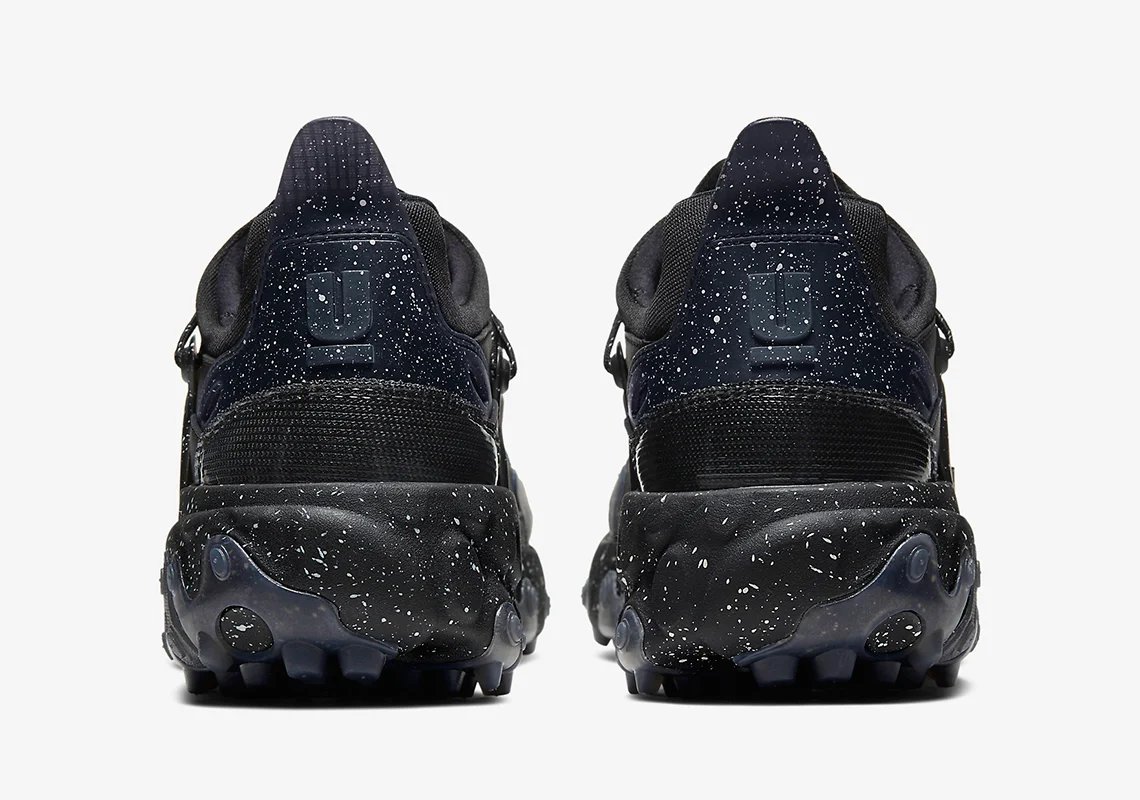 Le noir, le blanc et un violet quelque peu coloré remplissent l’espace, chacun étant équipé d’un mélange d’éclaboussures de peinture contrastées pour leurs éléments plus sombres – un motif repris de nombreux travaux antérieurs. Les semelles, qui font l’objet d’un traitement DIY, reprennent celles de la version originale, mais avec une bande de roulement entièrement nouvelle, qui imite les semelles à crampons, dans un clin d’œil évident au sentier. Ailleurs, les cages conservent leur forme générale, mais les lacets s’écartent de leur emplacement habituel et s’enroulent de l’avant-pied vers le haut, dans un style qui alimente l’agressivité aux côtés des panneaux rembourrés. Des imprimés éthérés de type galaxie sur les embouts aux mailles balistiques le long de la base, l’ensemble du kit supprime et remplace la présentation autrefois homogène du modèle. Le marquage arrive subtilement, contrairement à l’Helvetica en gras de ses prédécesseurs, avec un « U » souligné sur le talon et une fermeture standard le long de la semelle intérieure.