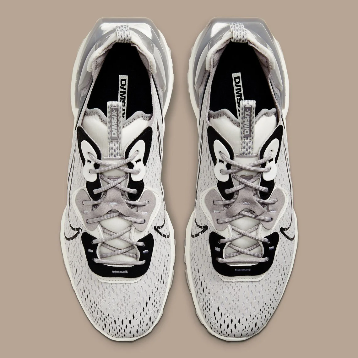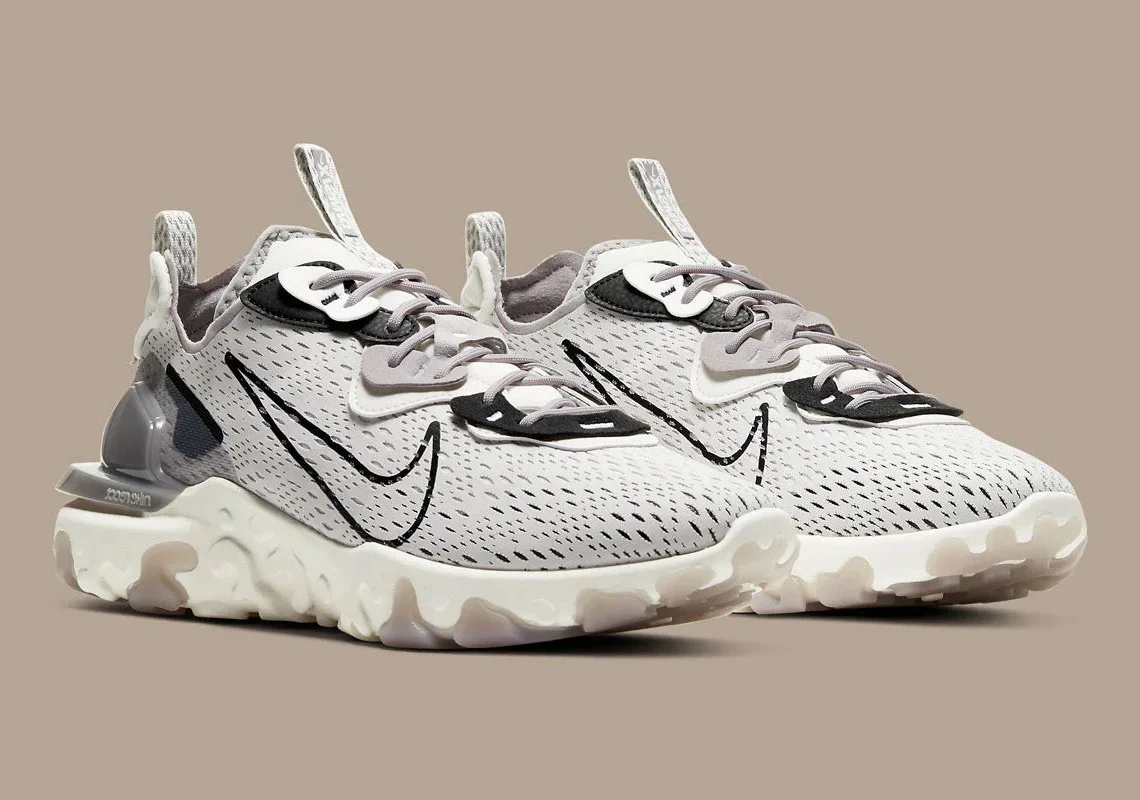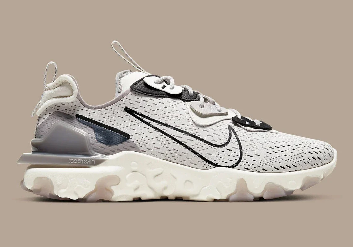 Depuis son lancement en février 2020, la Nike React Vision a largement favorisé les coloris animés. Pour sa dernière version, cependant, le modèle lifestyle expérimental propose un ensemble sobre « Vast Grey ». Revêtue de « Light Bone« , l’empeigne en mesh de la React Vision met en scène des teintes complémentaires de noir et de gris. À l’instar d’une Air Max 90 récente, les Swooshes, les œillets et les structures du talon contrastent avec leur environnement blanc cassé, bien que les caractéristiques de la React Element 55-followup soient beaucoup plus exagérées. La palette tranquille se poursuit sous le pied, bien qu’il n’y ait pas de tons sombres. Au lieu de cela, l’amorti de la React est entièrement recouvert d’un blanc pâle, tandis que ses coussinets en caoutchouc arborent une finition crème laiteuse.