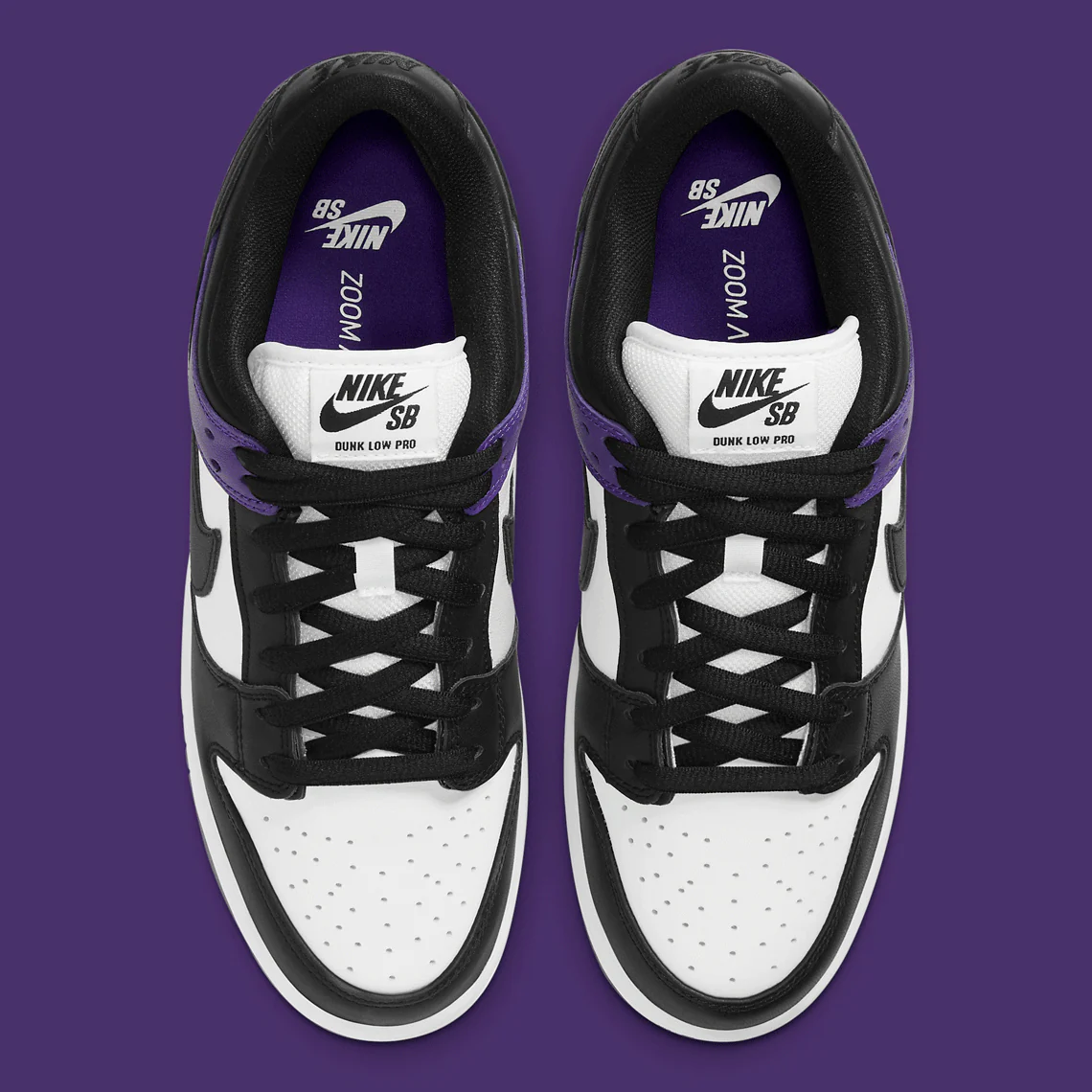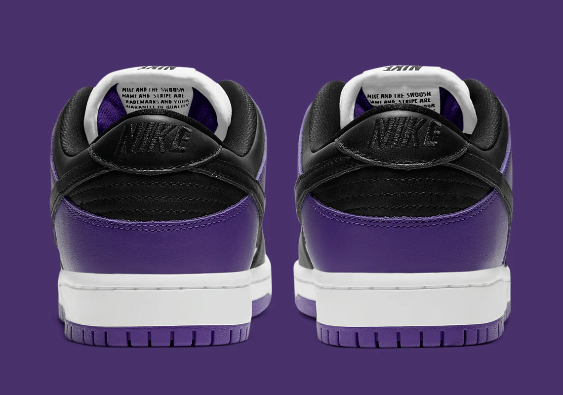 Un Swoosh en cuir noir apparaît au milieu du pied et un Court Purple en cuir se trouve sur le talon. Une broderie noire « Nike » marque l’arrière de la chaussure. Le motif de la langue bouffante caractéristique de la SB Dunk apparaît sur la « Court Purple » et offre à son porteur un coussin pour le skateboard. De plus, le design de la semelle extérieure offre une bonne adhérence pour ceux qui choisissent de skateboarder avec la SB Dunk Low « Court Purple ».