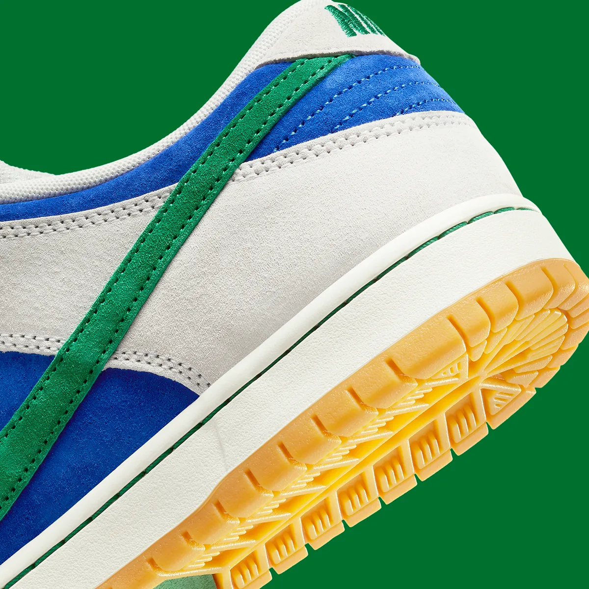 À l’instar d’une autre Dunk SB révélée fin 2023, cette nouvelle version est fabriquée en suédine de l’avant à l’arrière, et s’appuie simplement sur un schéma de codification des couleurs rafraîchi pour faire le gros du travail. L’empeigne est composée d’un bleu royal et d’un vert malachite, le premier servant de base et le second accentuant les logos du Swoosh et la languette du talon. Nike s’appuie ensuite sur une nuance neutre de Phantom pour la superposition, tandis que la semelle intermédiaire blanche et la semelle extérieure en gomme complètent le look classique de la chaussure de skate.