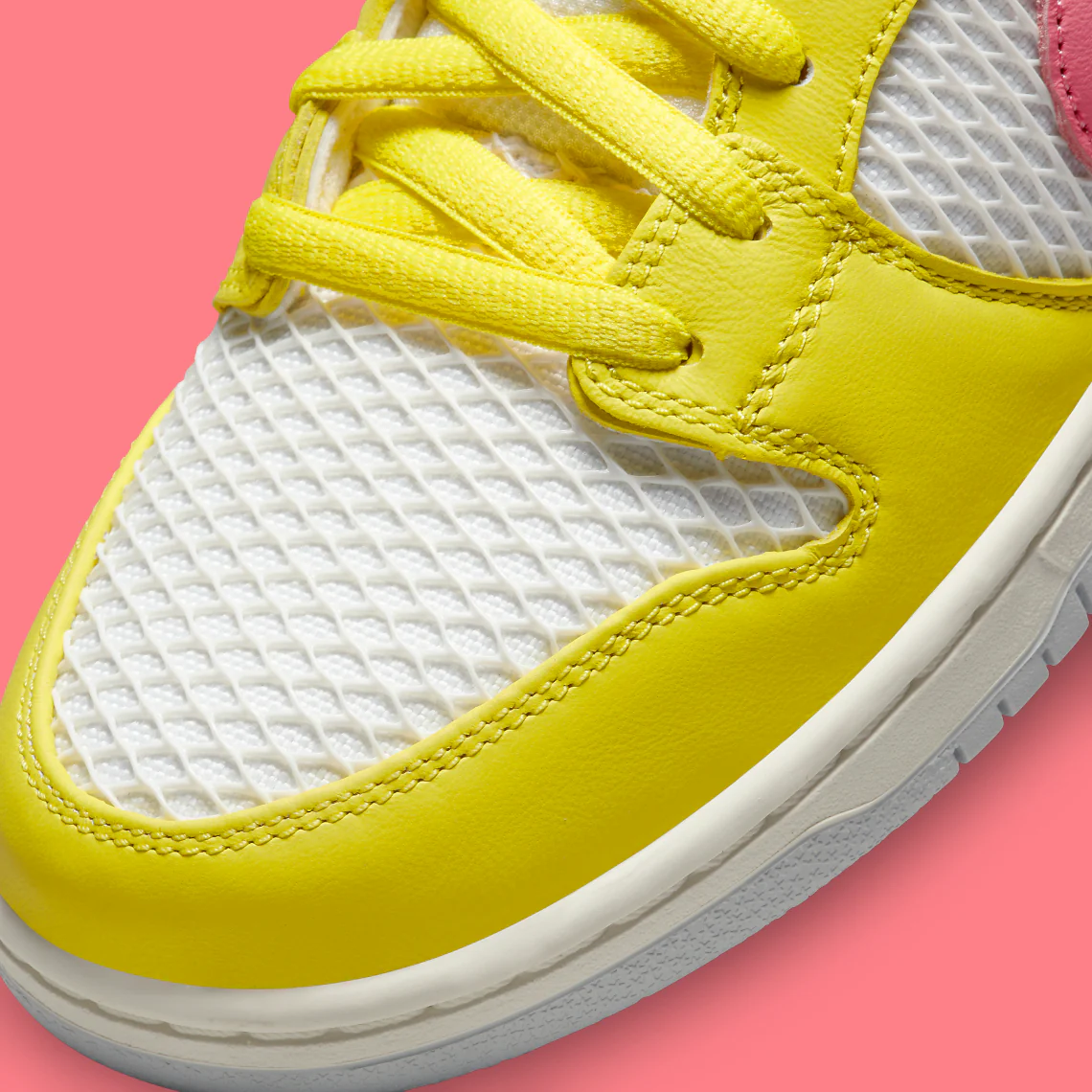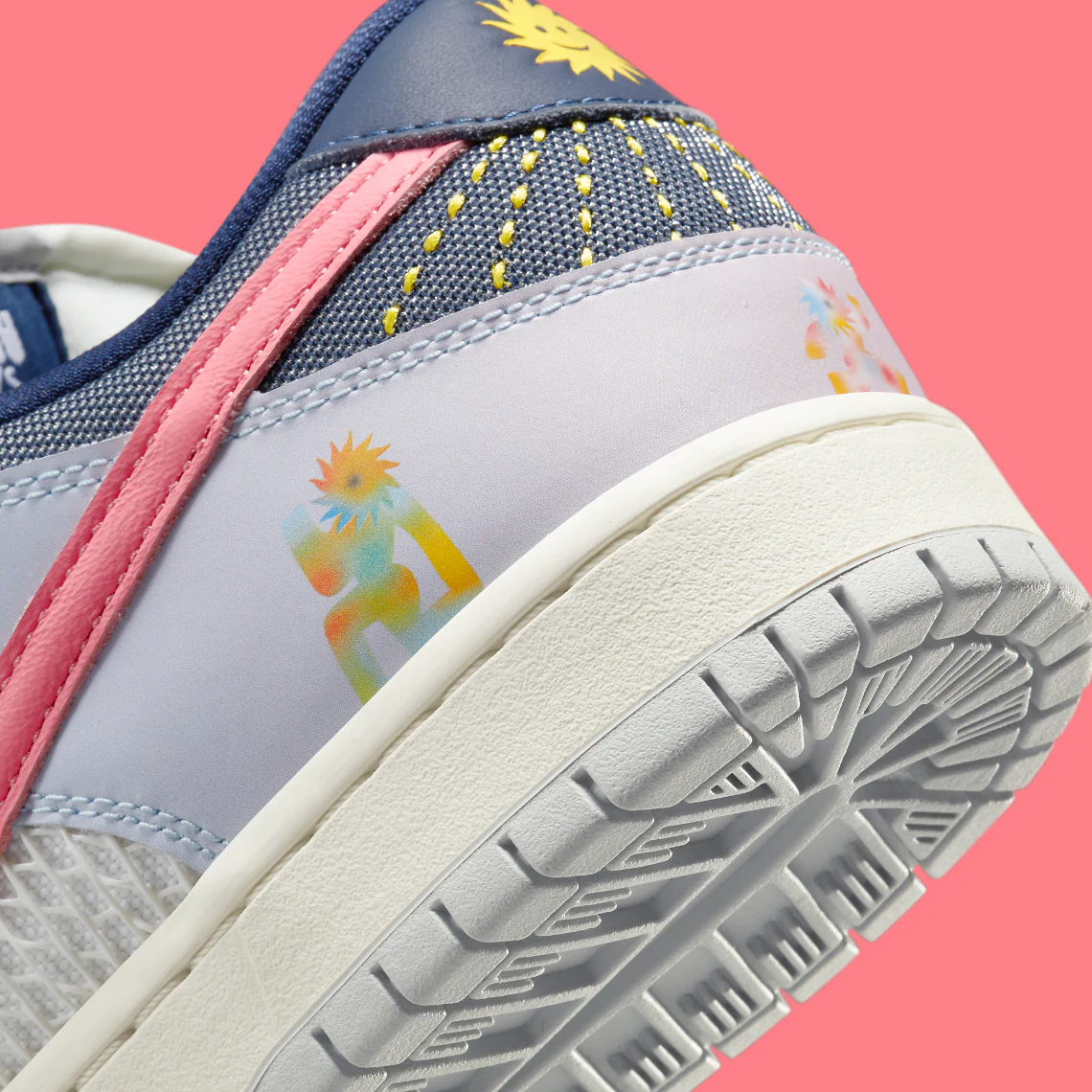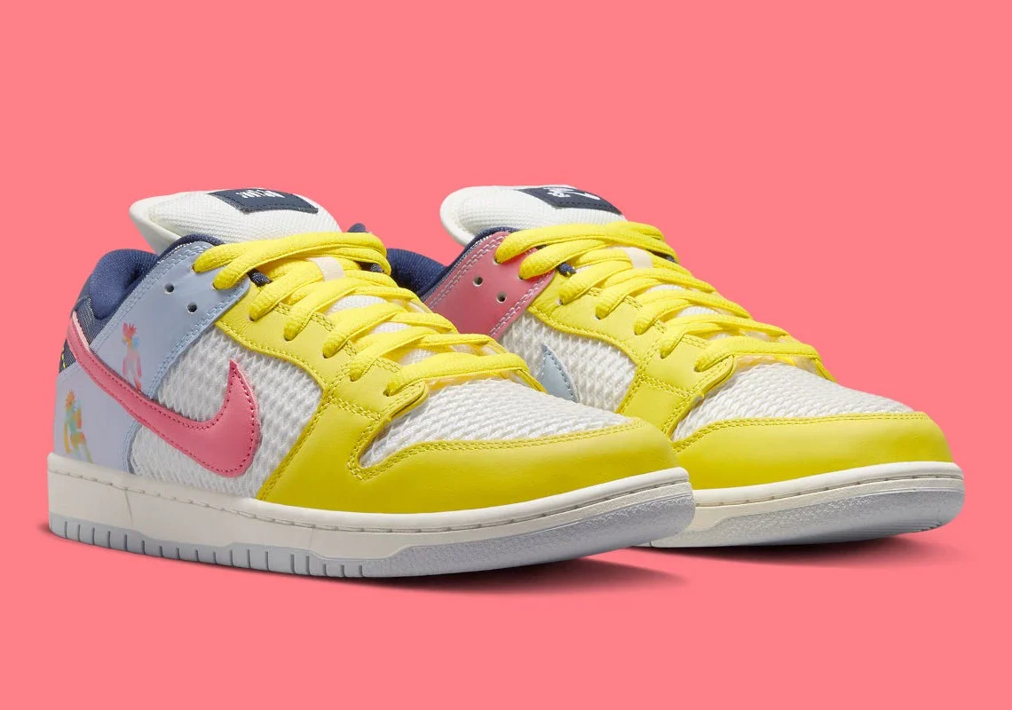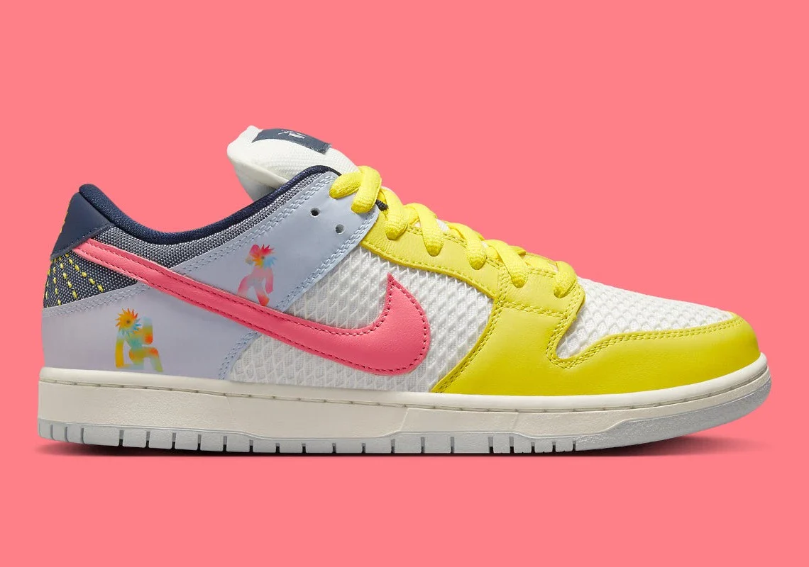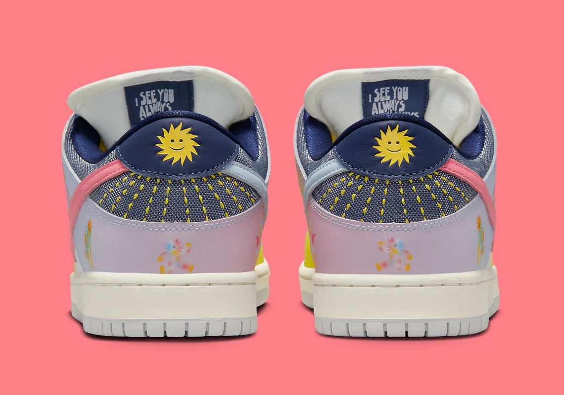 Au lieu de cela, la Nike Dunk modifiée présente une teinte jaune et bleu clair autour de l’avant-pied et du talon, respectivement, tandis que les couches de base optent pour une construction en mesh ouvert non standard. Les panneaux de l’empeigne arborent des graphiques spécifiques à la Be True, avec le motif du soleil sur la colonne vertébrale. Le dessous de la languette de la proposition Nike SB affiche un message d’inclusivité bienvenu : « I see you always in all ways« .