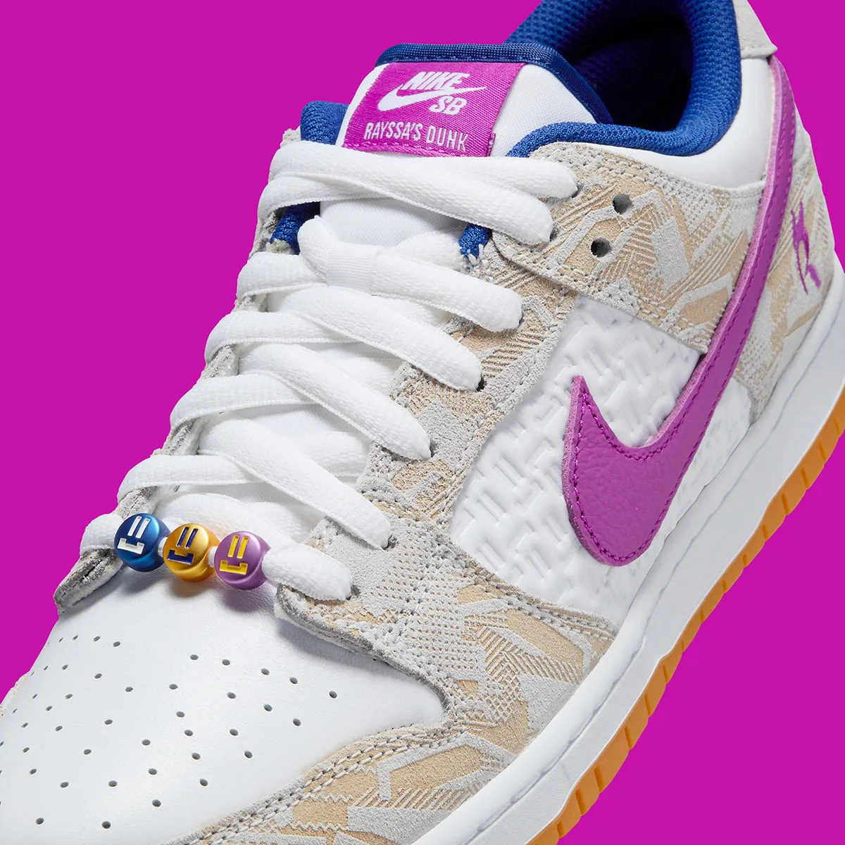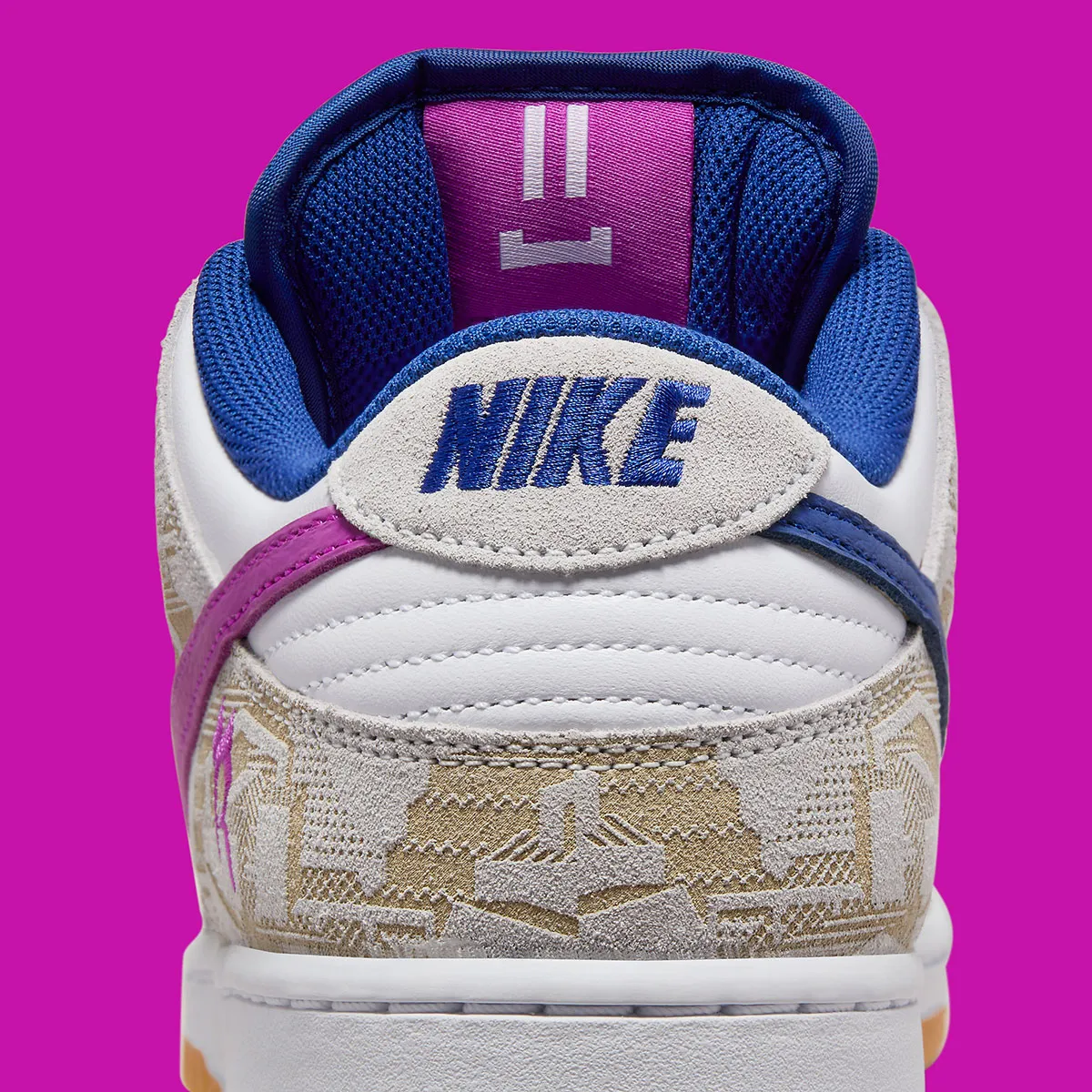 Alors que les premières images de la maquette montraient une composition titrée avec un dégradé de violet, de bleu et de rose, les images officielles du premier coup d’œil présentent plutôt une palette neutre. Le traitement coloré de cette dernière se concentre sur les languettes violettes de la marque Rayssa, tandis que les teintes « Deep Royal Blue » animent la languette médiane et la doublure intérieure qui l’entoure. Les swooshes en cuir marbré étendent les tons vibrants de la roue Pantone encore plus loin avec le « Vivid Purple » qui traite les installations du pied gauche tandis que les swooshes de droite reviennent au contraste bleu foncé qui préside à l’empeigne.