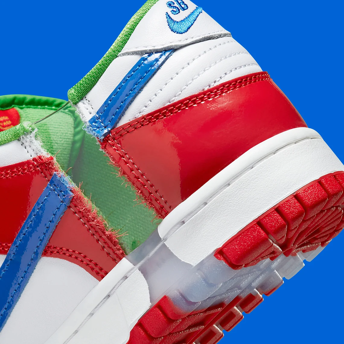 Nike SB n’est certainement pas étranger aux sneakers extrêmement rares et quasi-introuvables (la plupart étant des Dunks), depuis le premier effort conjoint avec Supreme jusqu’au crossover provoquant des émeutes avec Staple. La brève collaboration du sous-label avec eBay est cependant beaucoup plus légendaire, car deux des trois paires supposées produites ont été sciées en quatre parties distinctes. Avance rapide de près de deux décennies plus tard et nous voyons maintenant les pièces se recoller… littéralement. Après plusieurs teasers au cours de l’année dernière, les images officielles de la eBay x Nike SB Dunk Low ont finalement fait surface. Et plutôt que de recréer le coloris original à l’identique, les deux partenaires ont choisi d’imiter ce à quoi ressemblerait la Dunk Low si les fragments susmentionnés étaient collés ensemble. Il en résulte une version unique et plus personnelle qui délaisse l’esthétique au profit de la narration, et qui célèbre simultanément la vie de Sandy Bodecker. Les couleurs de la marque (rouge, bleu, jaune et vert) sont présentes sur la construction en cuir verni, mais elles sont quelque peu éclipsées par le TPU transparent et les pièces glacées de la semelle intermédiaire qui traversent verticalement trois sections différentes de la chaussure.