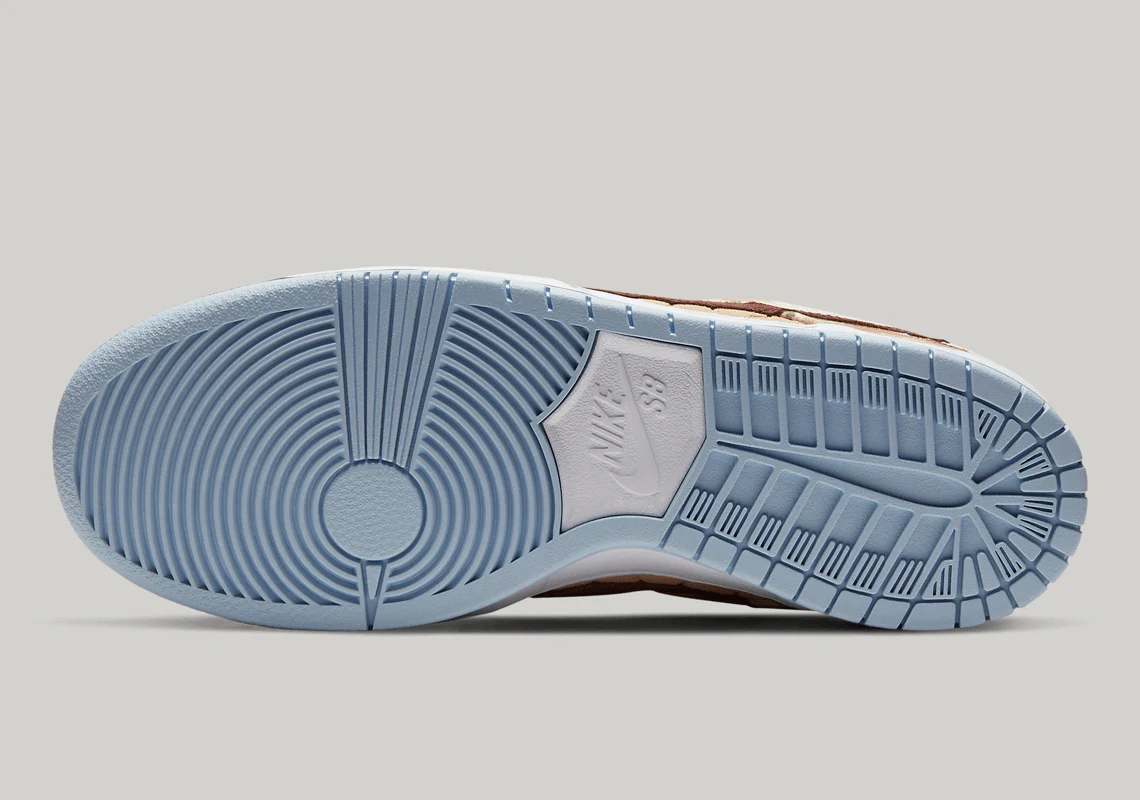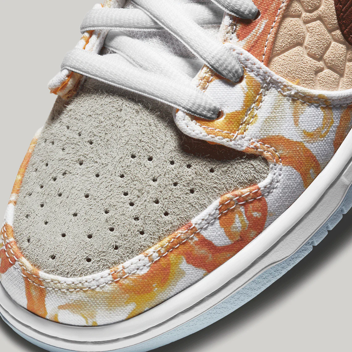 La chaussure gauche présente des panneaux de couleur neutre, commençant par le Swoosh marron et s’étendant jusqu’au bout et au milieu du panneau. La chaussure droite est plus audacieuse et présente un cuir orange sur le milieu du panneau, un bout marron et une disposition en arc-en-ciel sur les aquarelles des panneaux superposés.