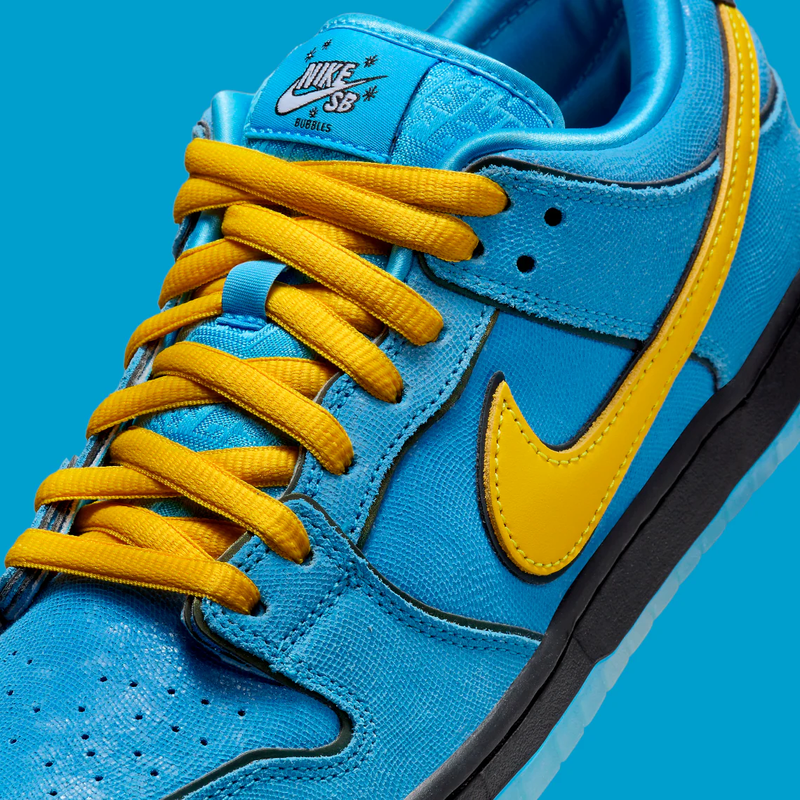 La SB Dunk Low « Bubbles » se démarque par sa palette de couleurs vibrantes, s’inspirant de Bubbles elle-même. Cette chaussure présente une délicieuse combinaison de teintes Blue Chill, Deep Royal Blue et Active Pink, reflétant le look distinctif de Bubbles. La tige présente une texture captivante semblable à une peau de serpent en bleu, complétée par des lacets jaunes accrocheurs et des logos Swoosh. De plus, les talons sont ornés d’yeux captivants et le design comprend des bordures réfléchissantes, des languettes riches en logo et des semelles intérieures de style bande dessinée, faisant de ces chaussures un véritable joyau de collection.